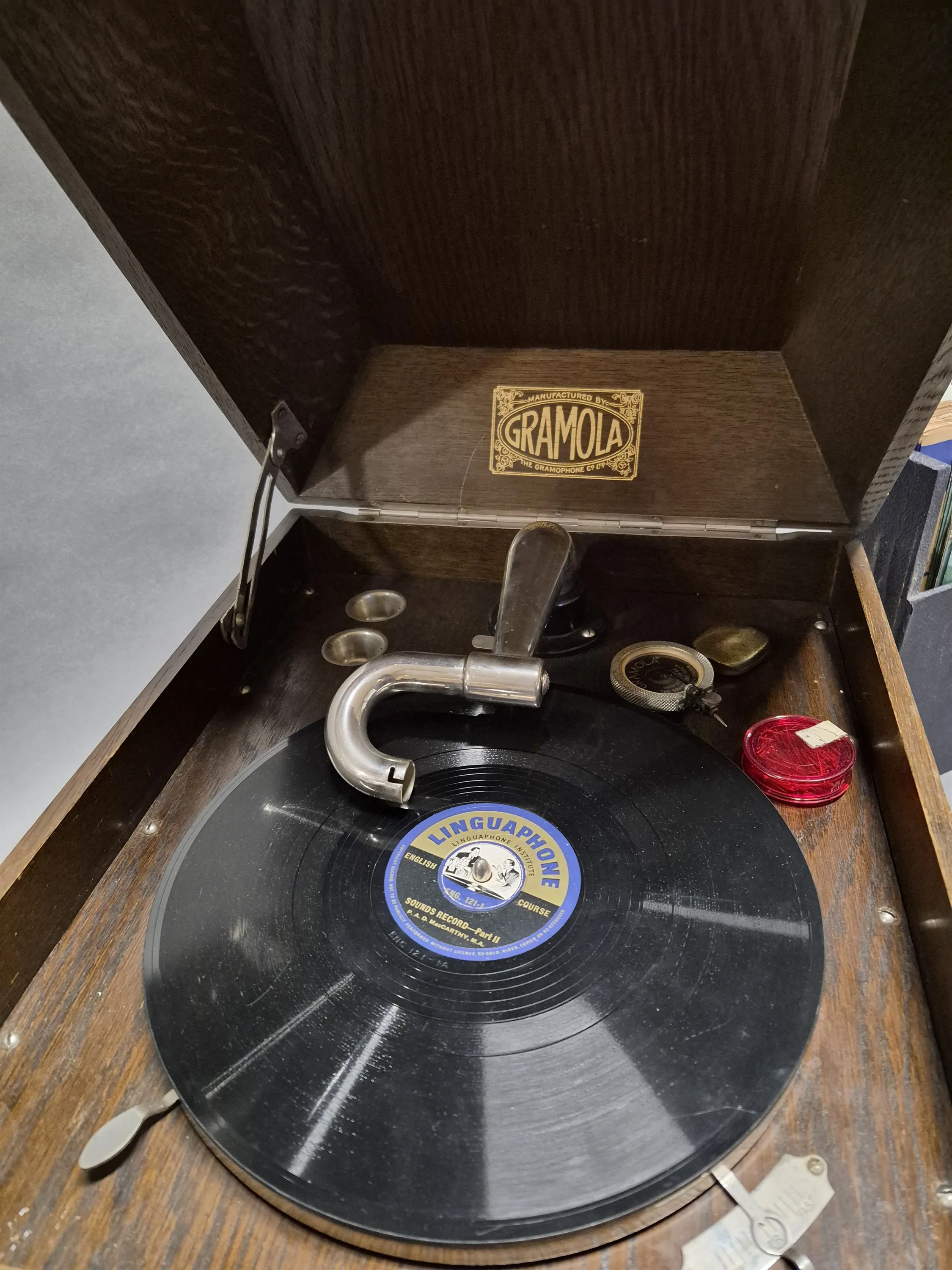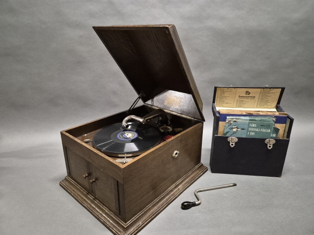 18339. Grammofon Gramola och stenkakor, längsta mått 48 cm, ej testad