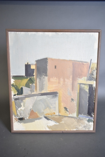 13248. Gustav Adolf Johansson olja på duk, "Kubistiskt hus" mått 58 x 69 cm