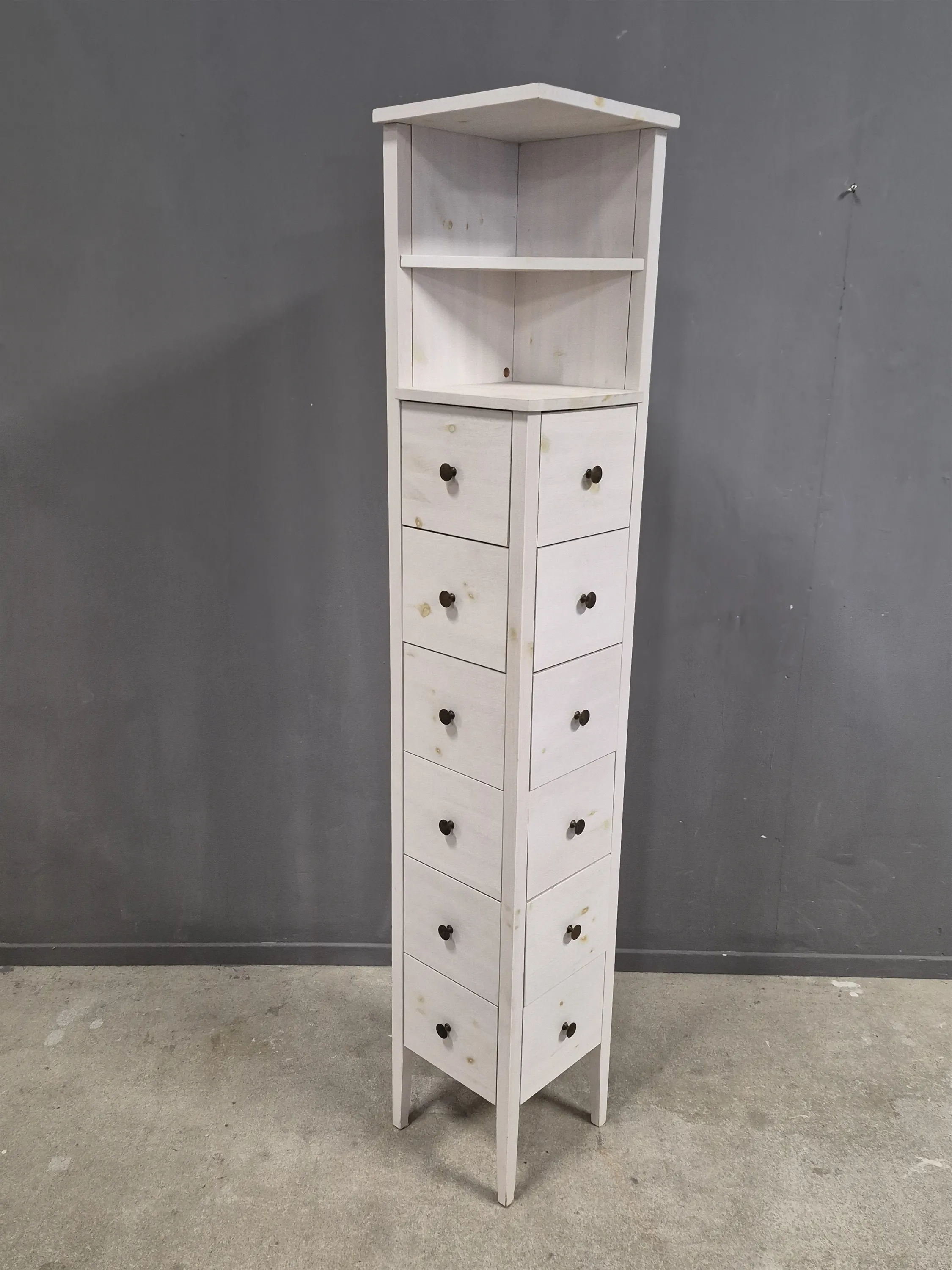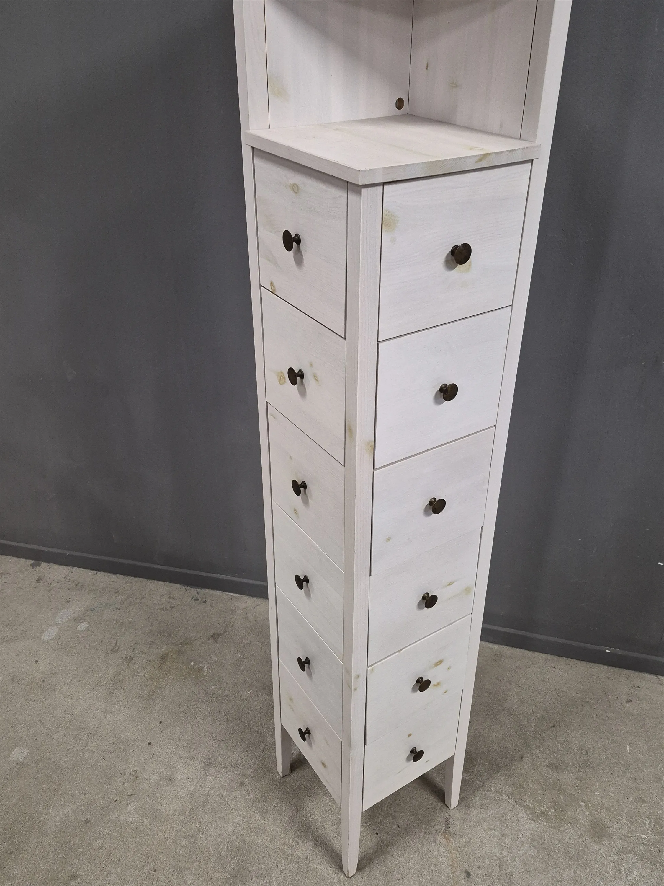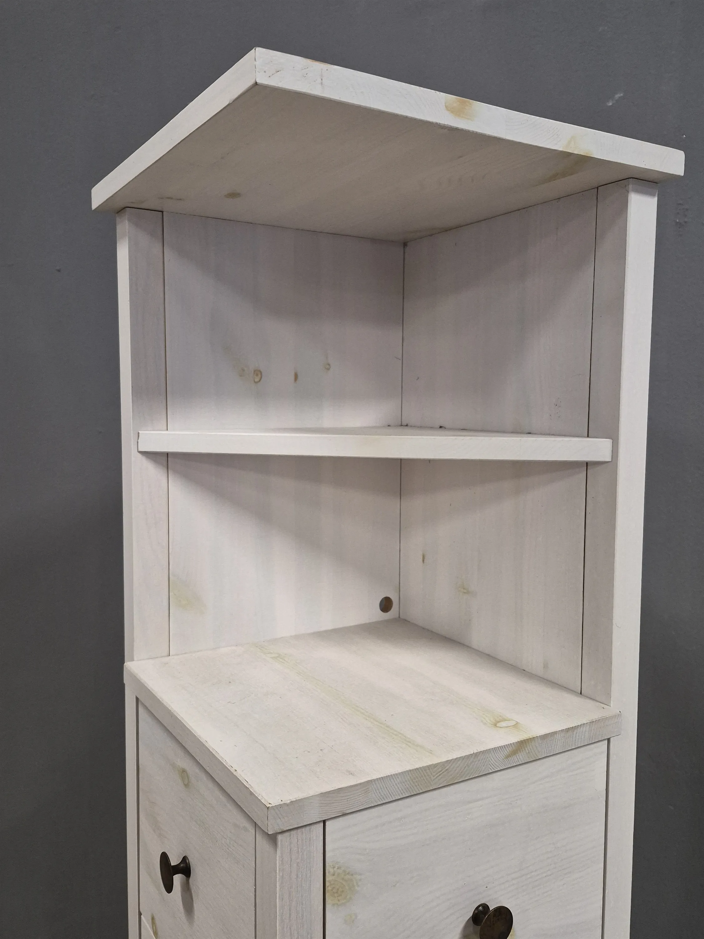 20815. Hörnbyrå med hyllplan, betsad furu, höjd 183 cm, djup & bredd 31 cm
