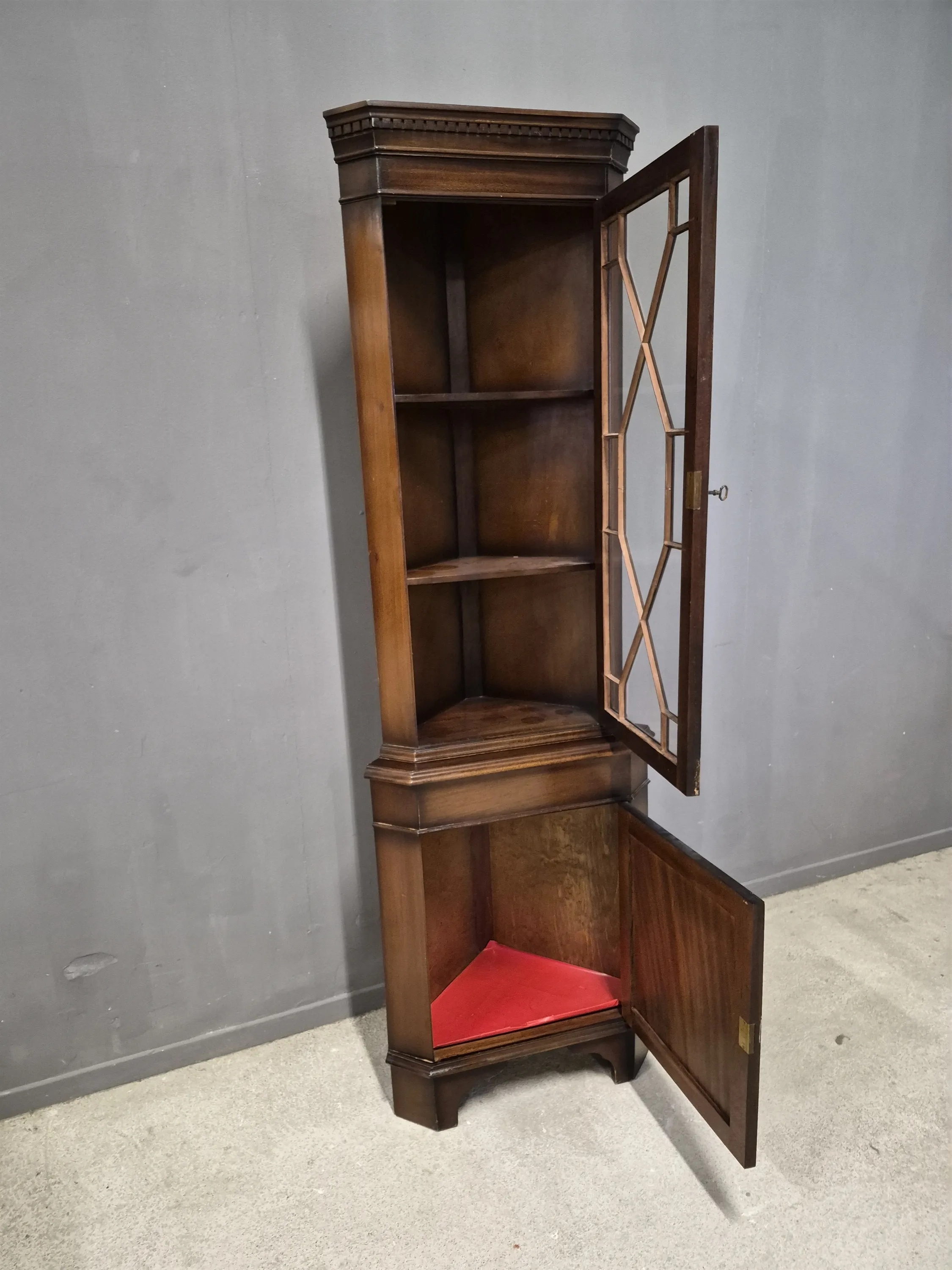17835. Hörnskåp, Engelsk stil, mahogny, höjd 180 cm, djup 42 cm