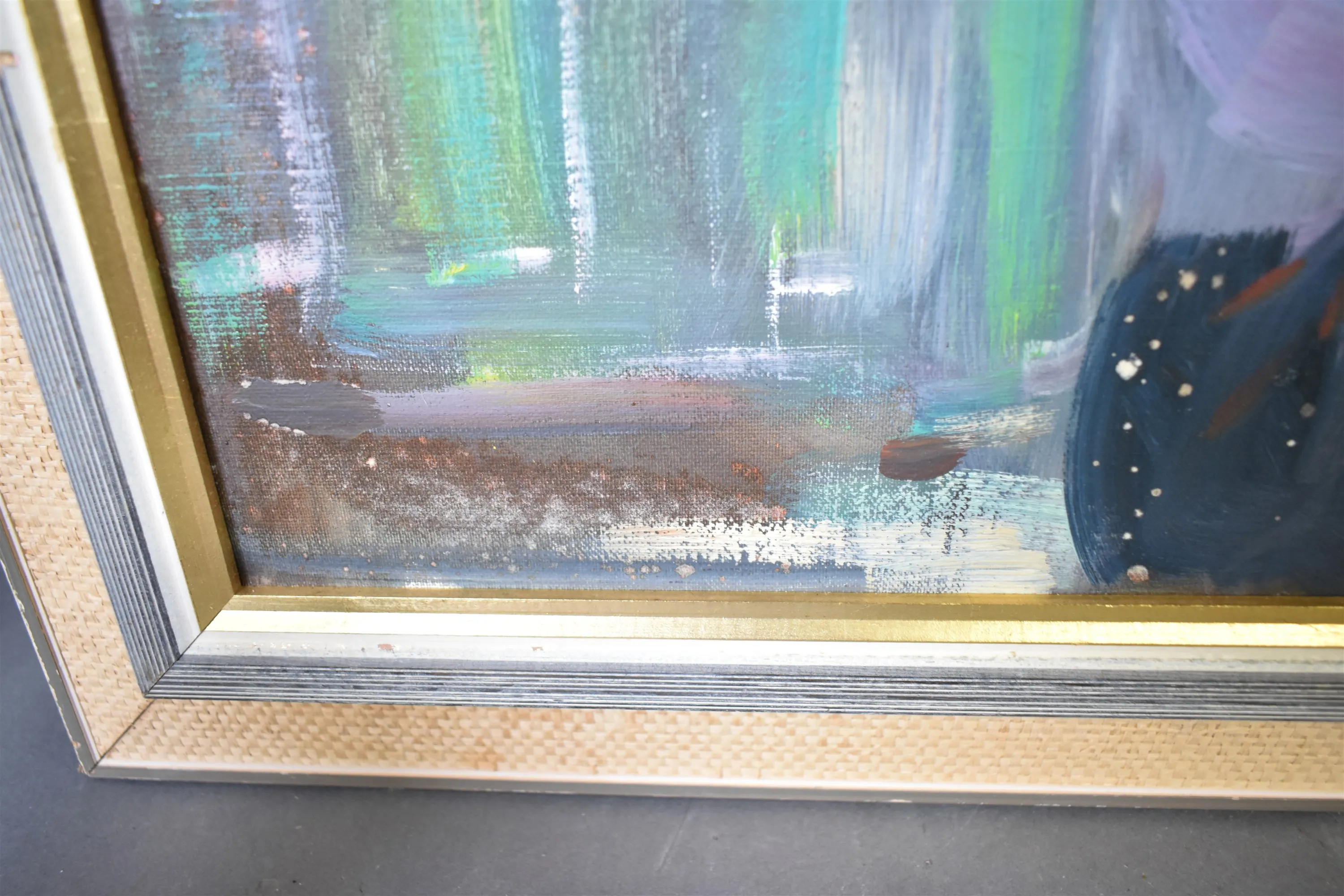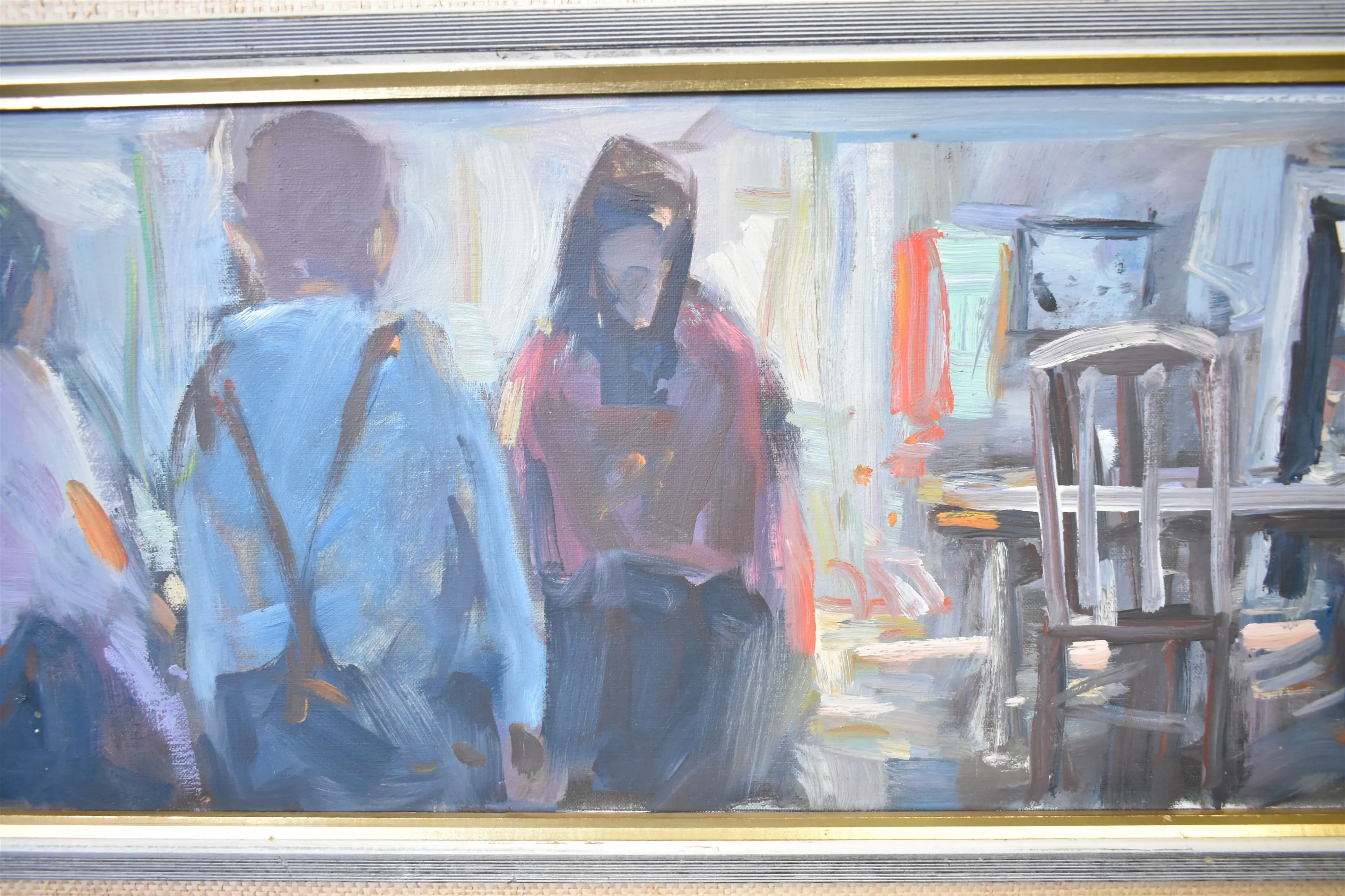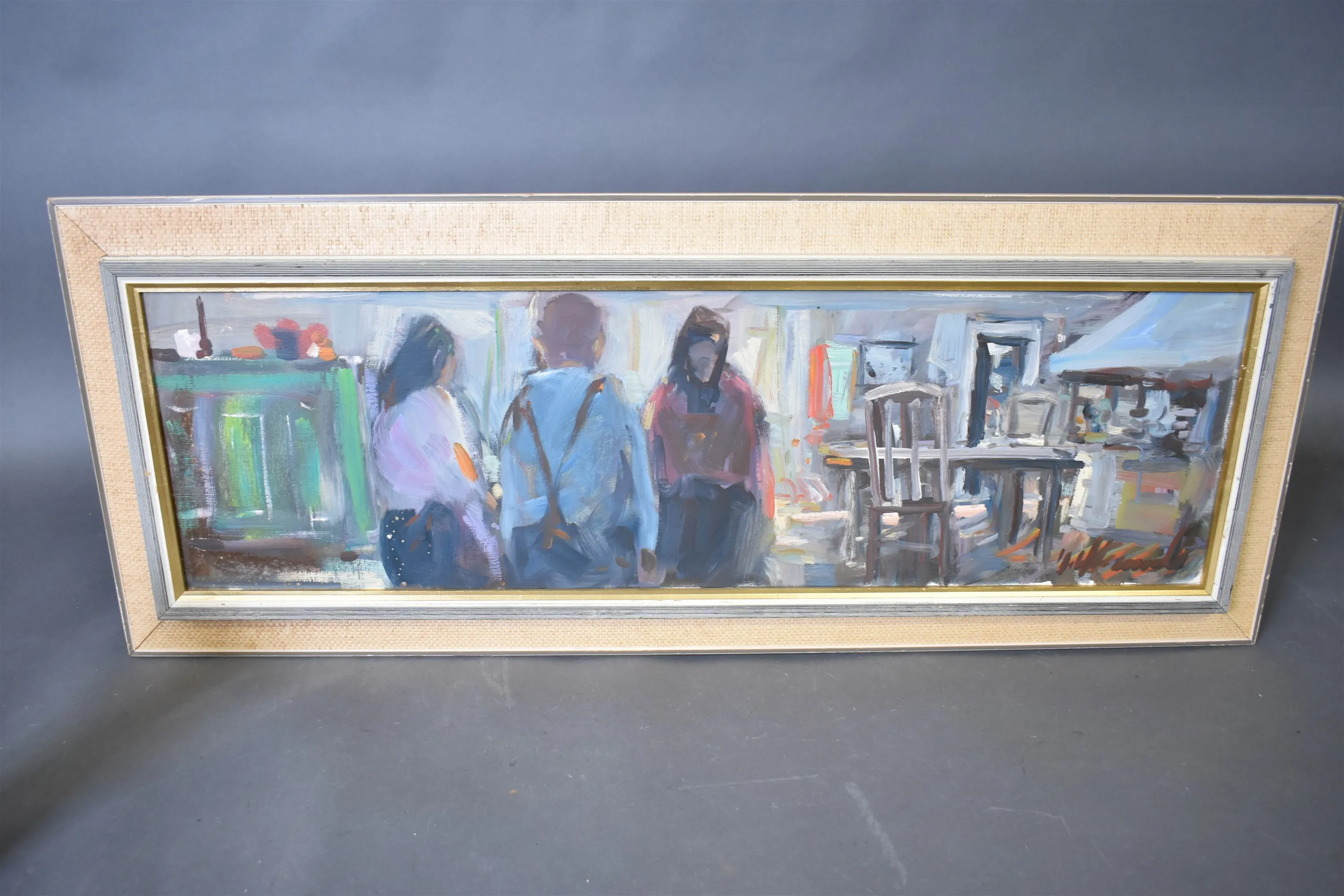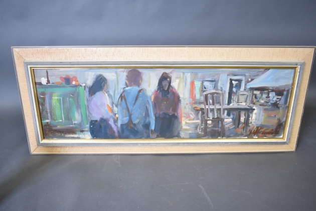 13672. H.Karlsson olja på duk, Fiskarfamilj, Strömstad mått 45 x 116 cm