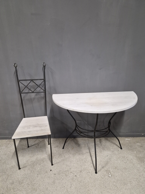 17424. Halvmånebord och stol, mått på bord höjd 82 cm, längd 100 cm, bredd 51 cm