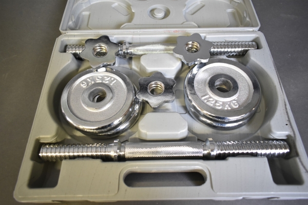 9887. Hantelset, 4 viktskivor, 1 spärrskruv saknas