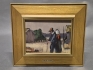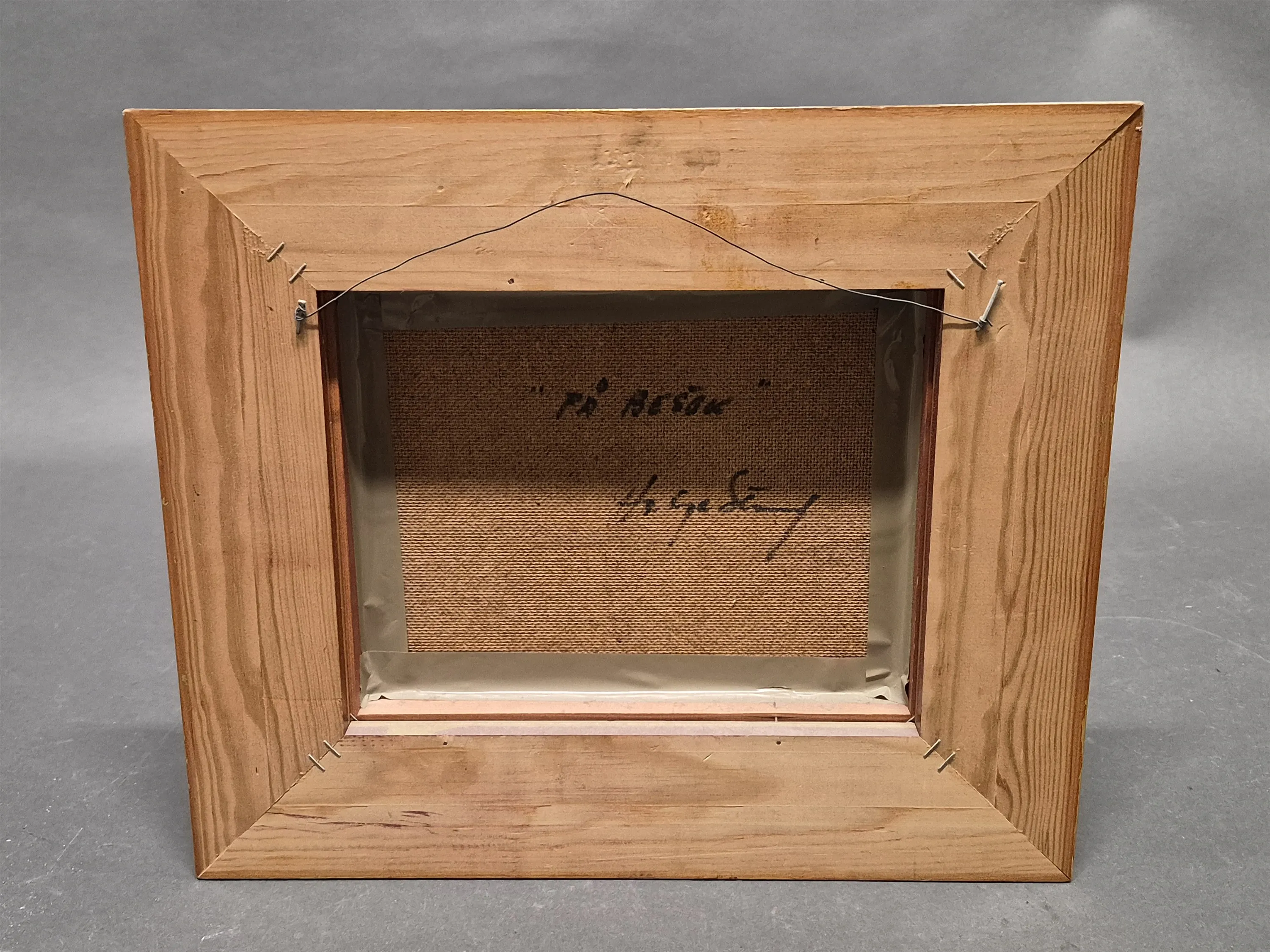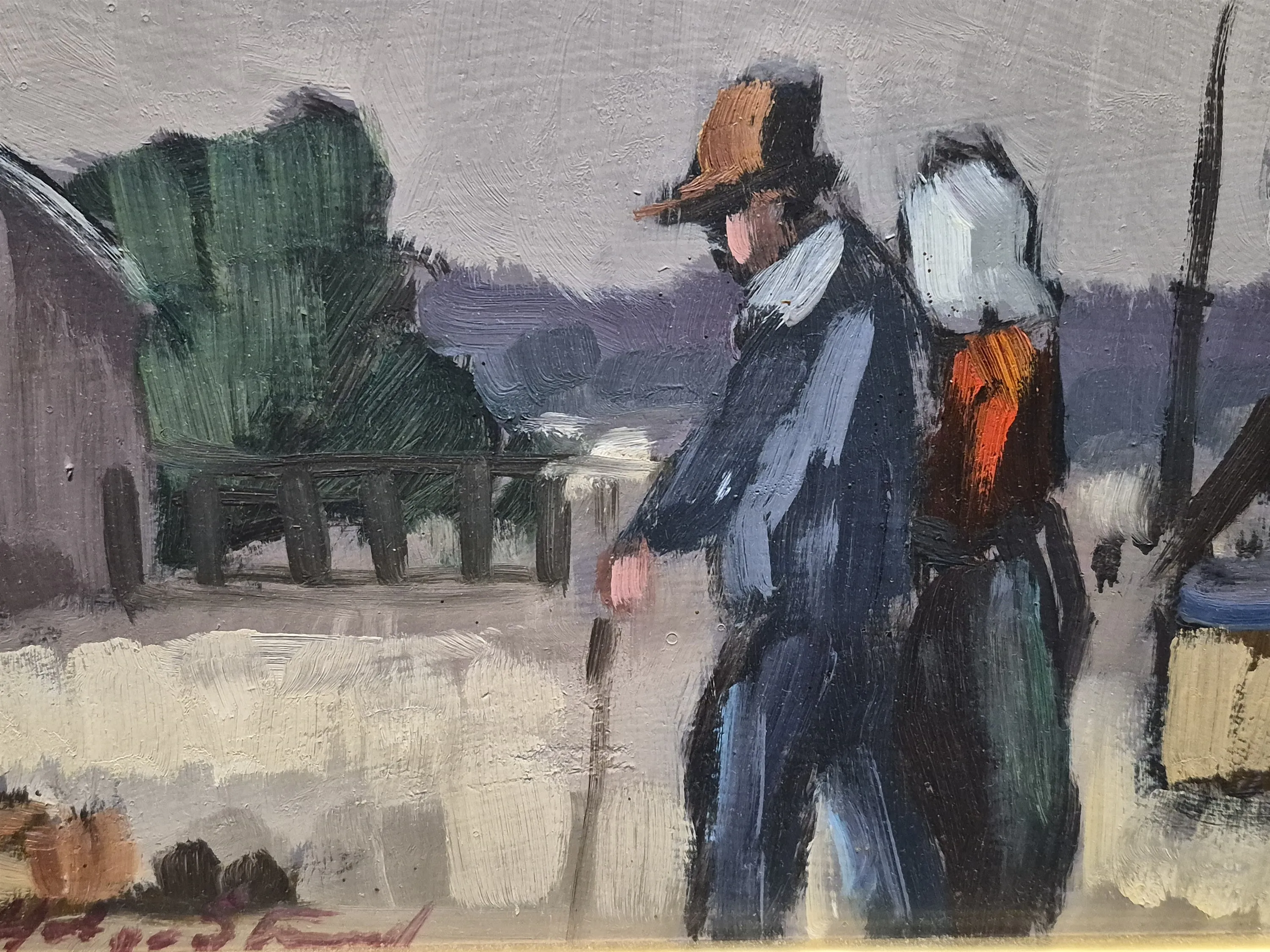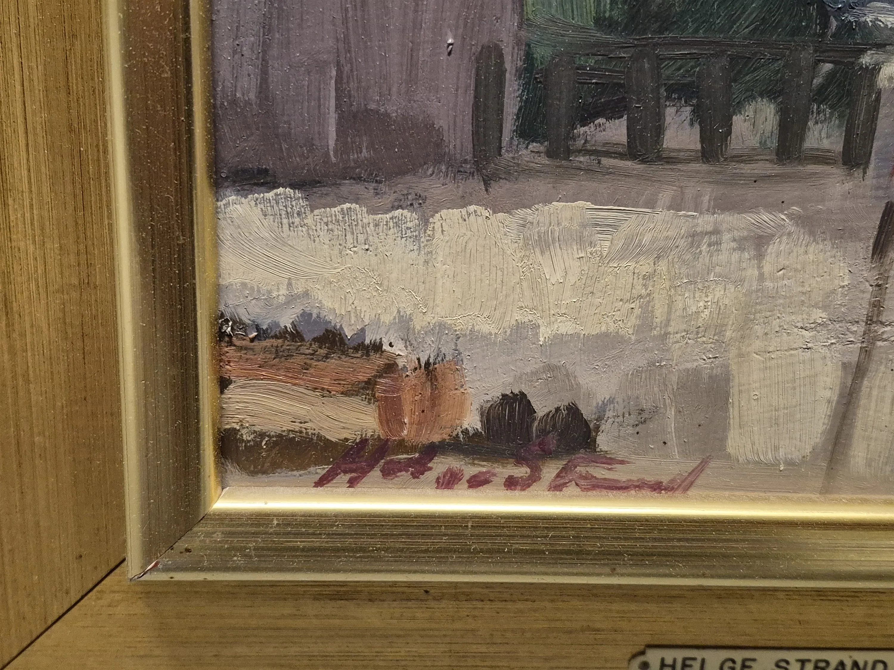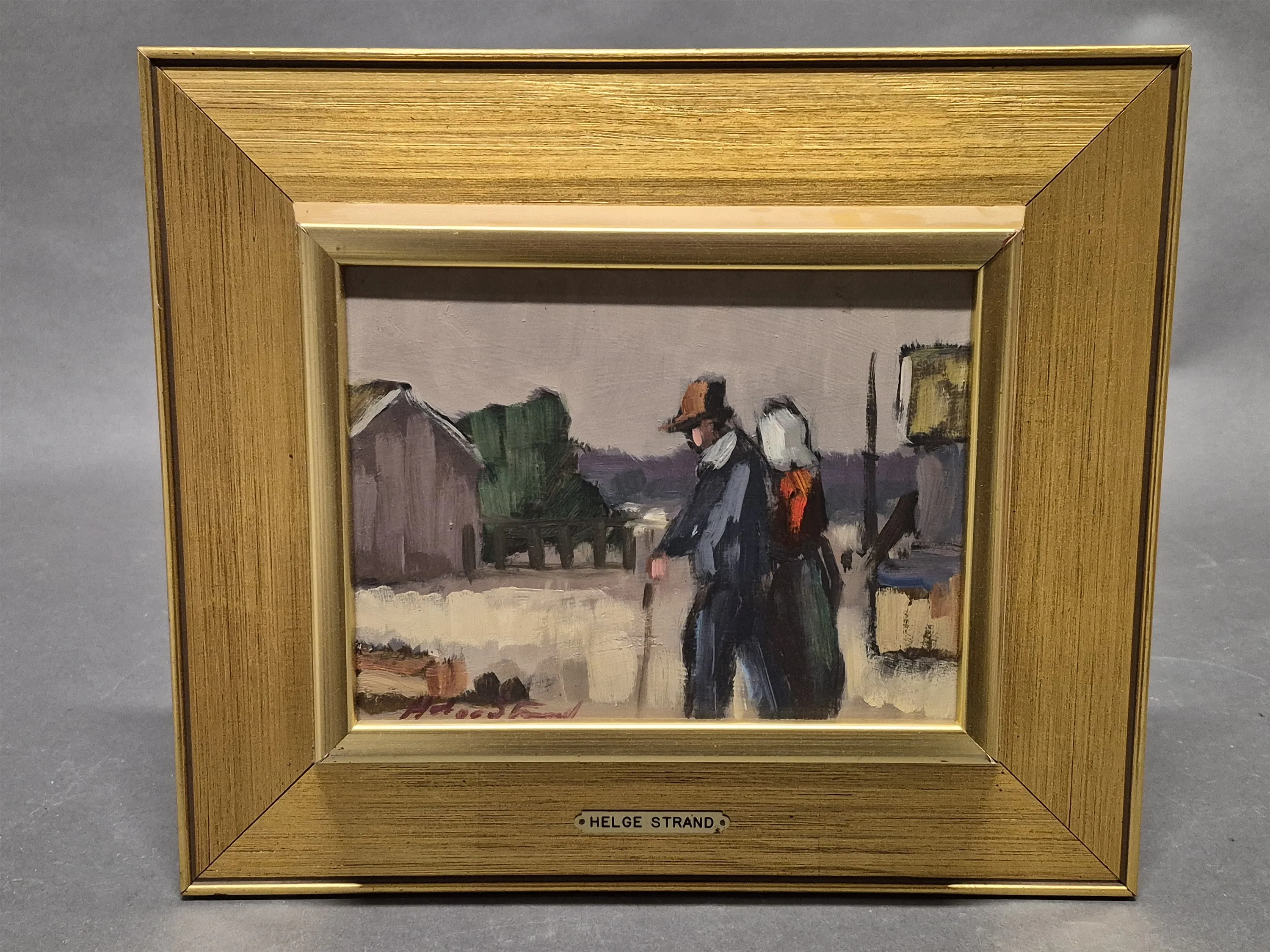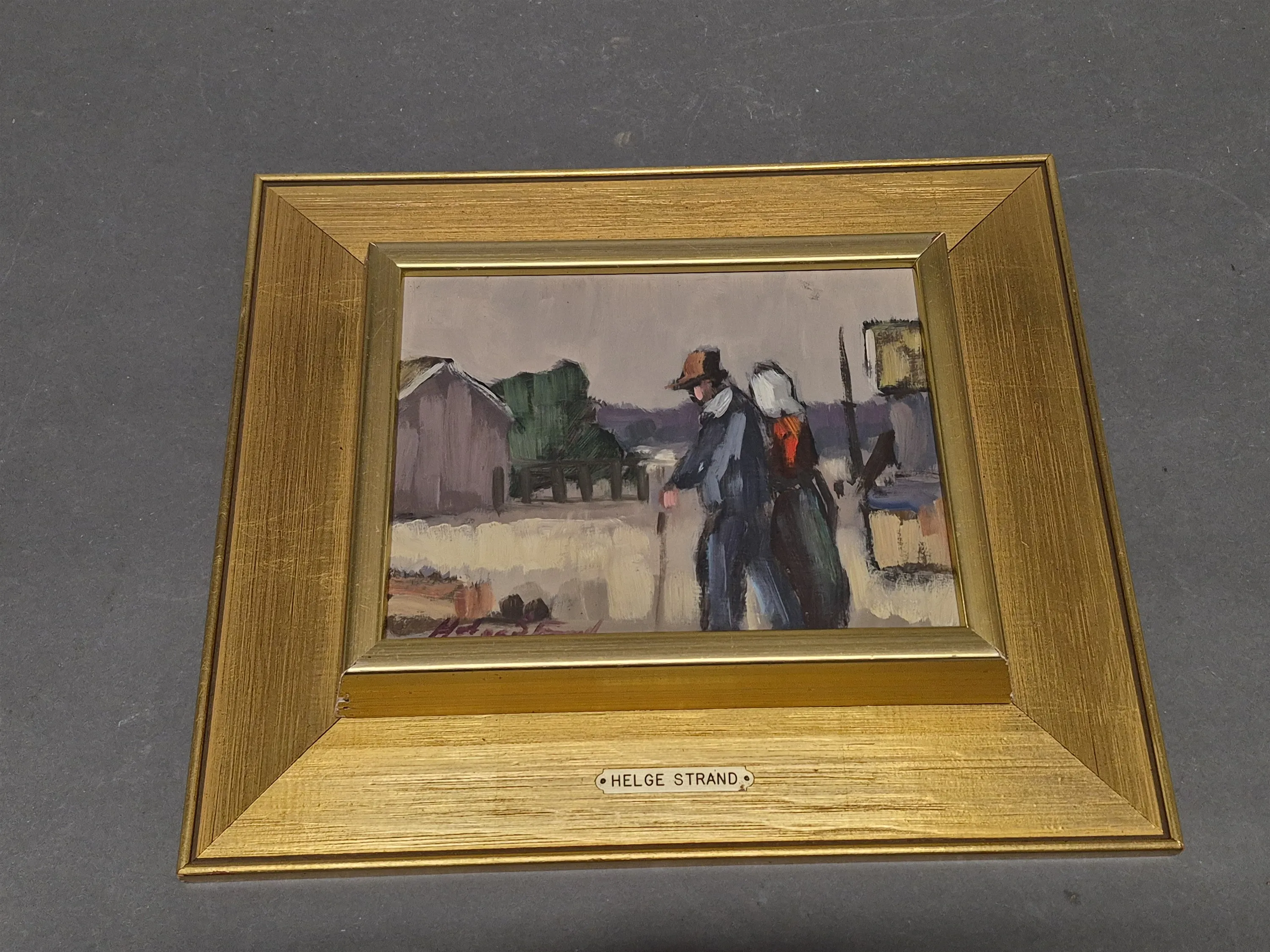19034. Helge Strand olja på pannå, "På besök", mått 39 x 34 cm