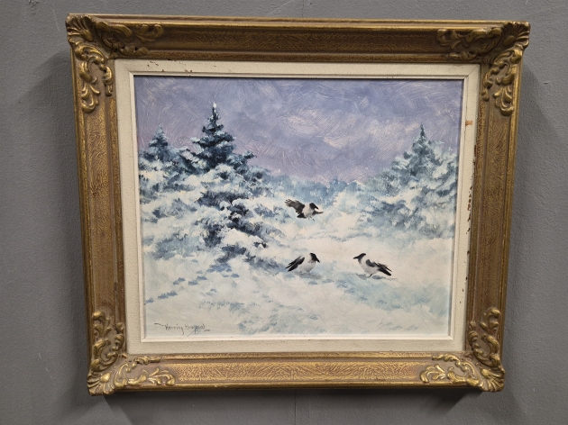 19411. Henning Hougaard olja på pannå, "Kråkor i vinter" mått 52 x 61 cm