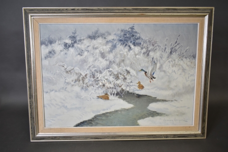 3893. Henning Huogaard olja på duk, "Änder vid vinterbäck", mått 110 x 81 cm