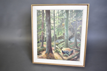 3608. Hennry Carlsson olja på duk, "Granskog", mått 52 x 59 cm