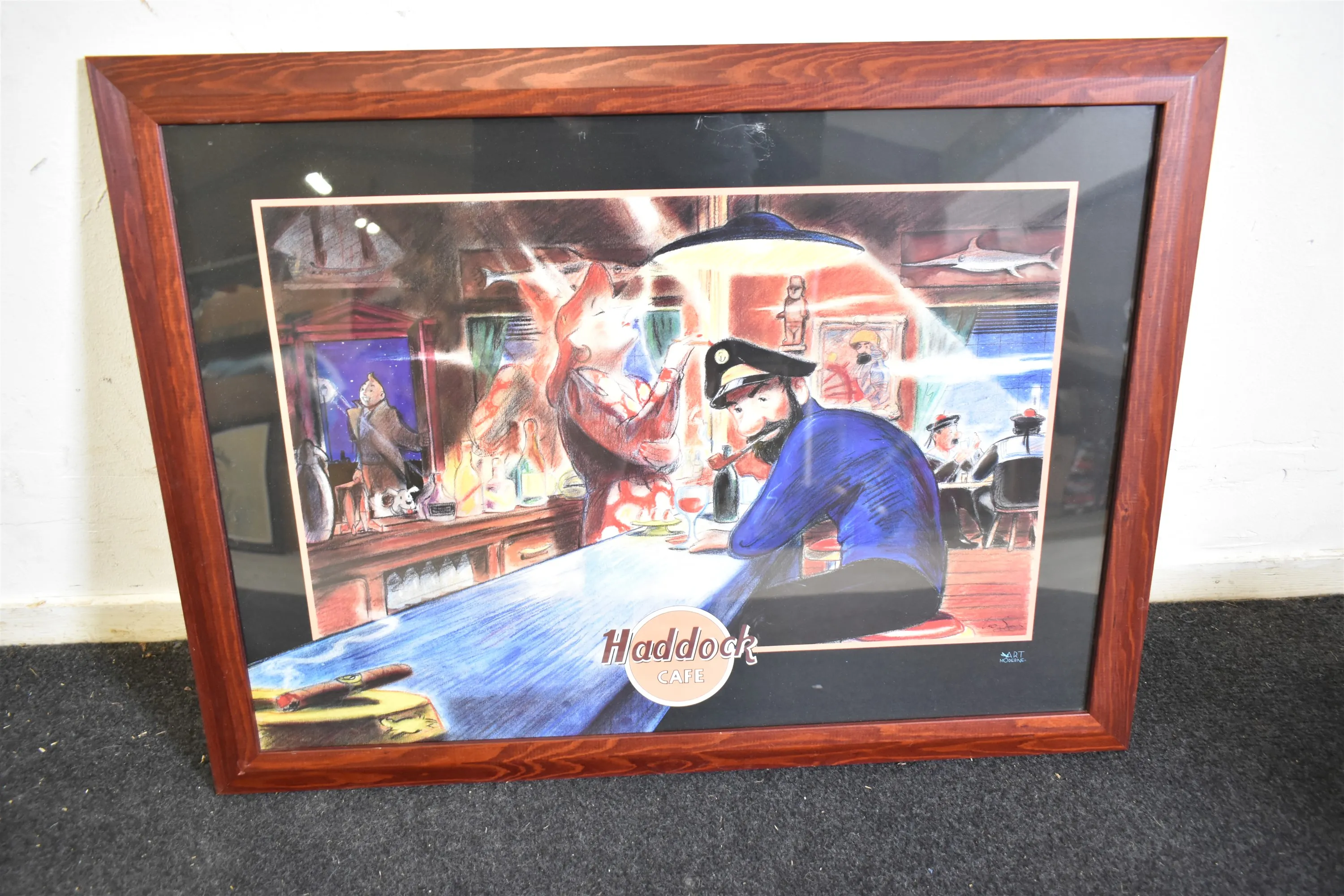 12020. Inramad affisch, Tin Tin Haddock Cafe, mått 78 x 58 cm