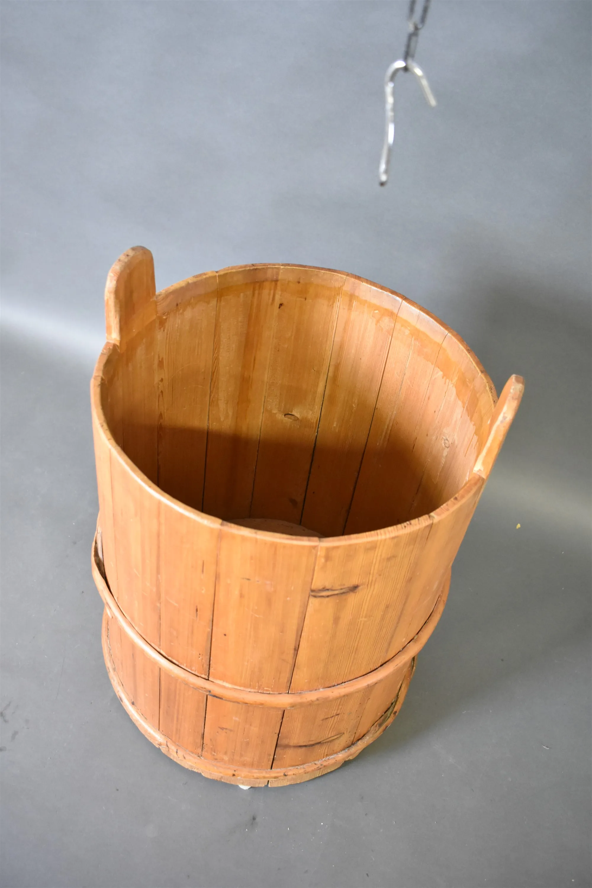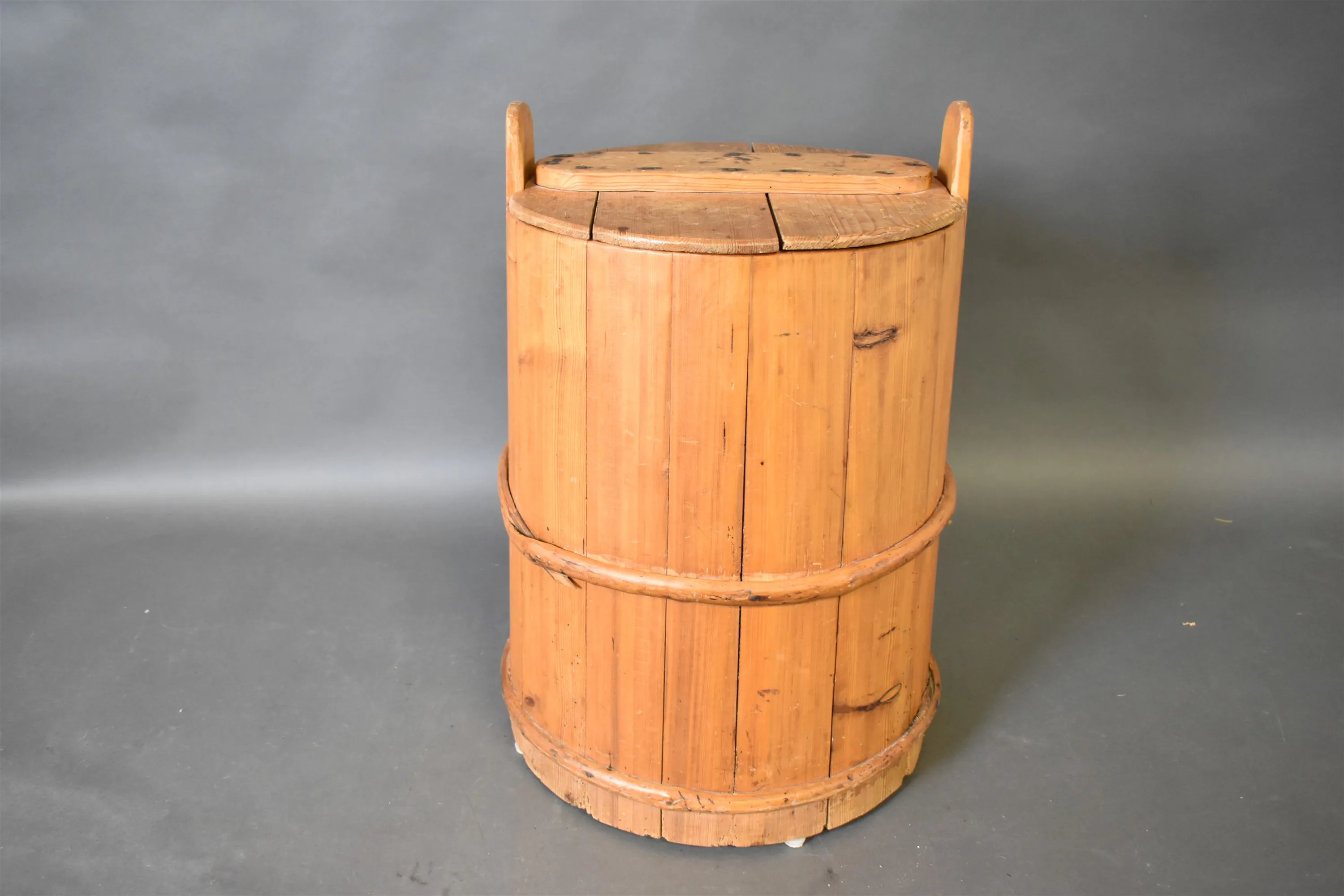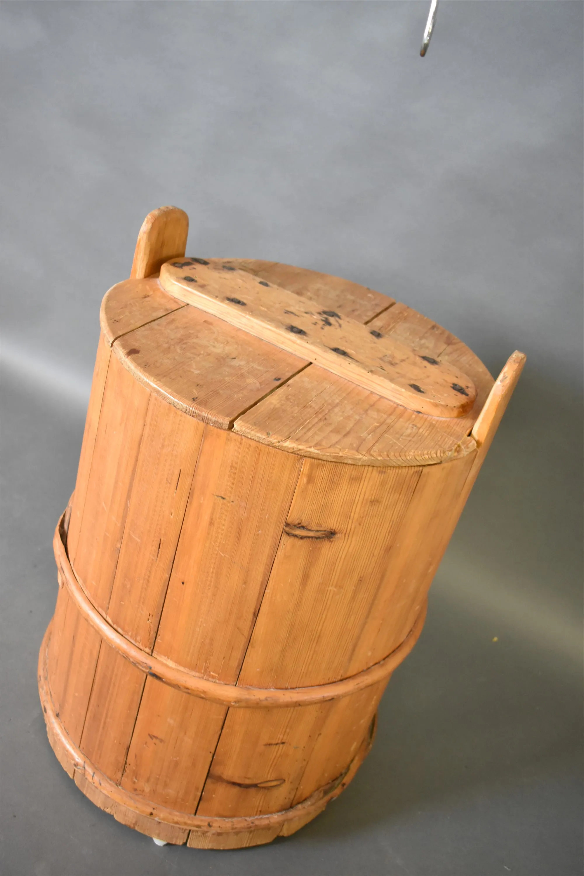16400. Kärl med lock, laggat, furu höjd 64 cm lagning finns på lock
