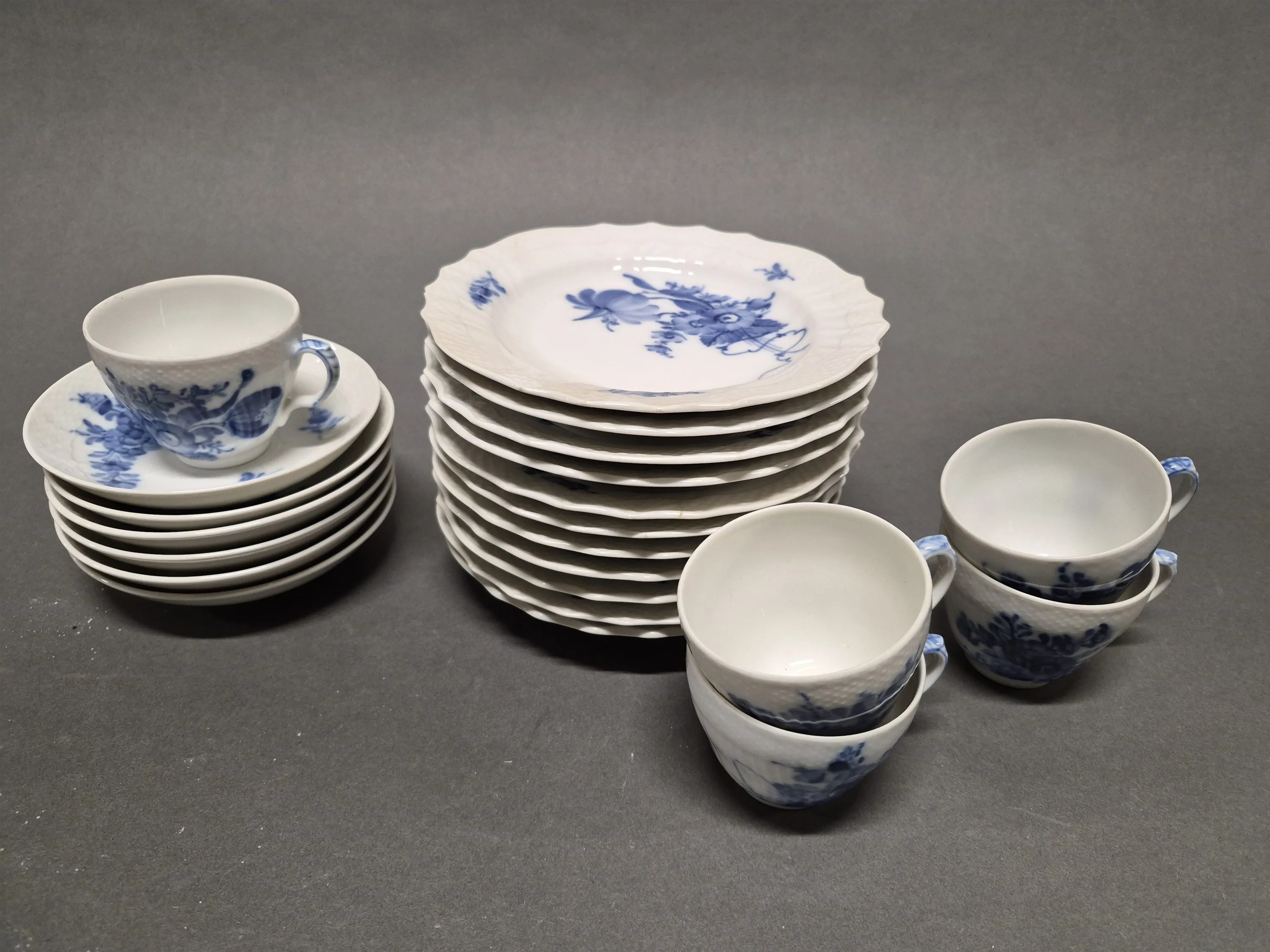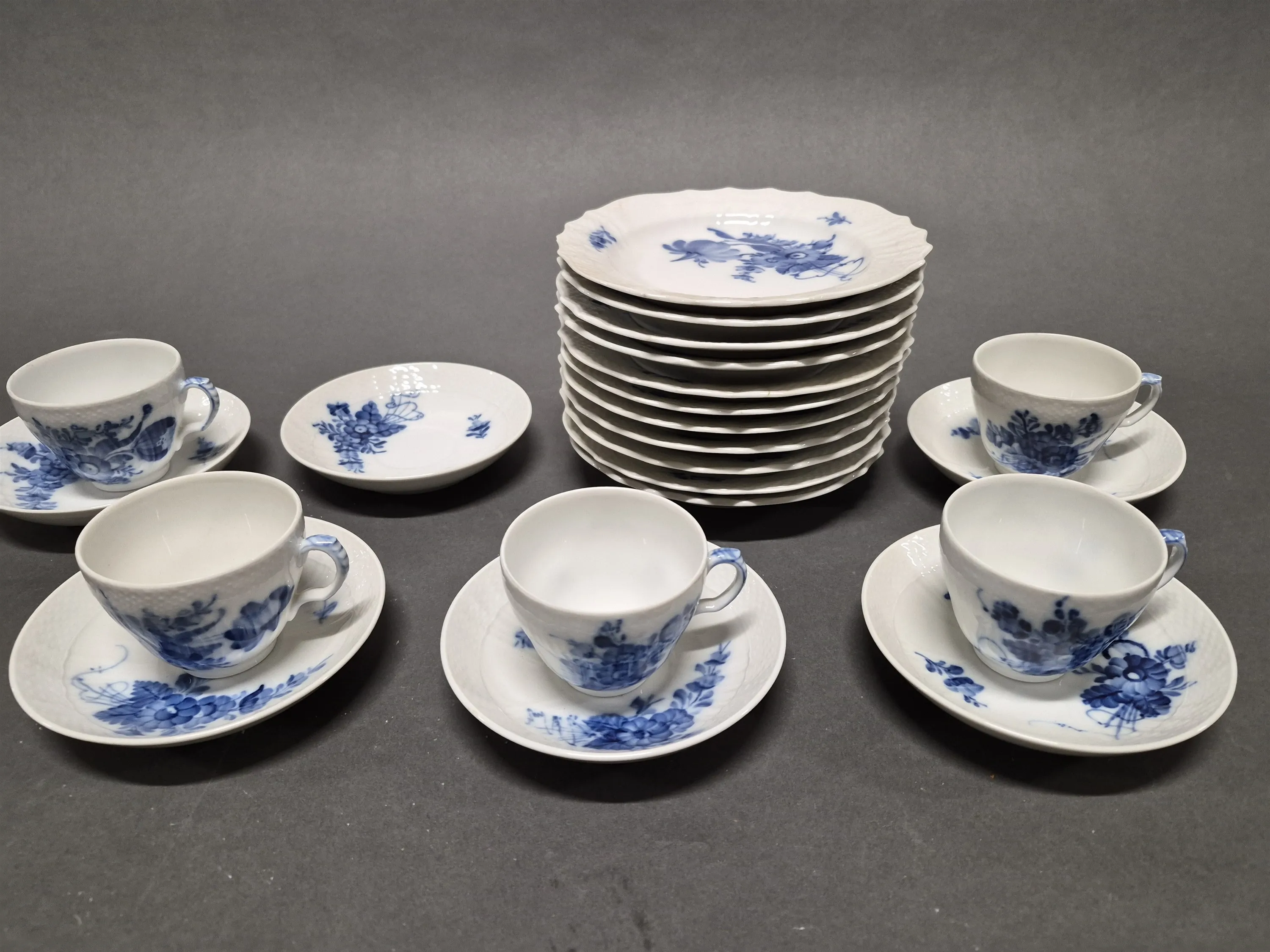 18138. Kaffegods Blåblomster Kunglig Dansk, största diameter 17 cm, små nagg på 5 assietter