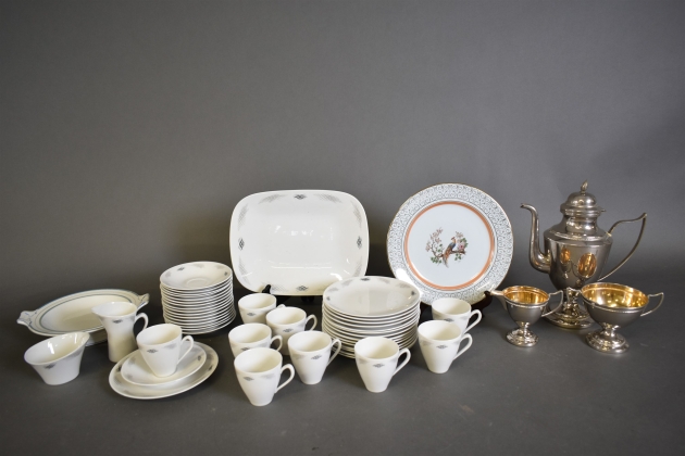 12916. Kaffeservis & fat Rörstrand och kaffekanna med tillbehör metall, högsta höjd 29 cm