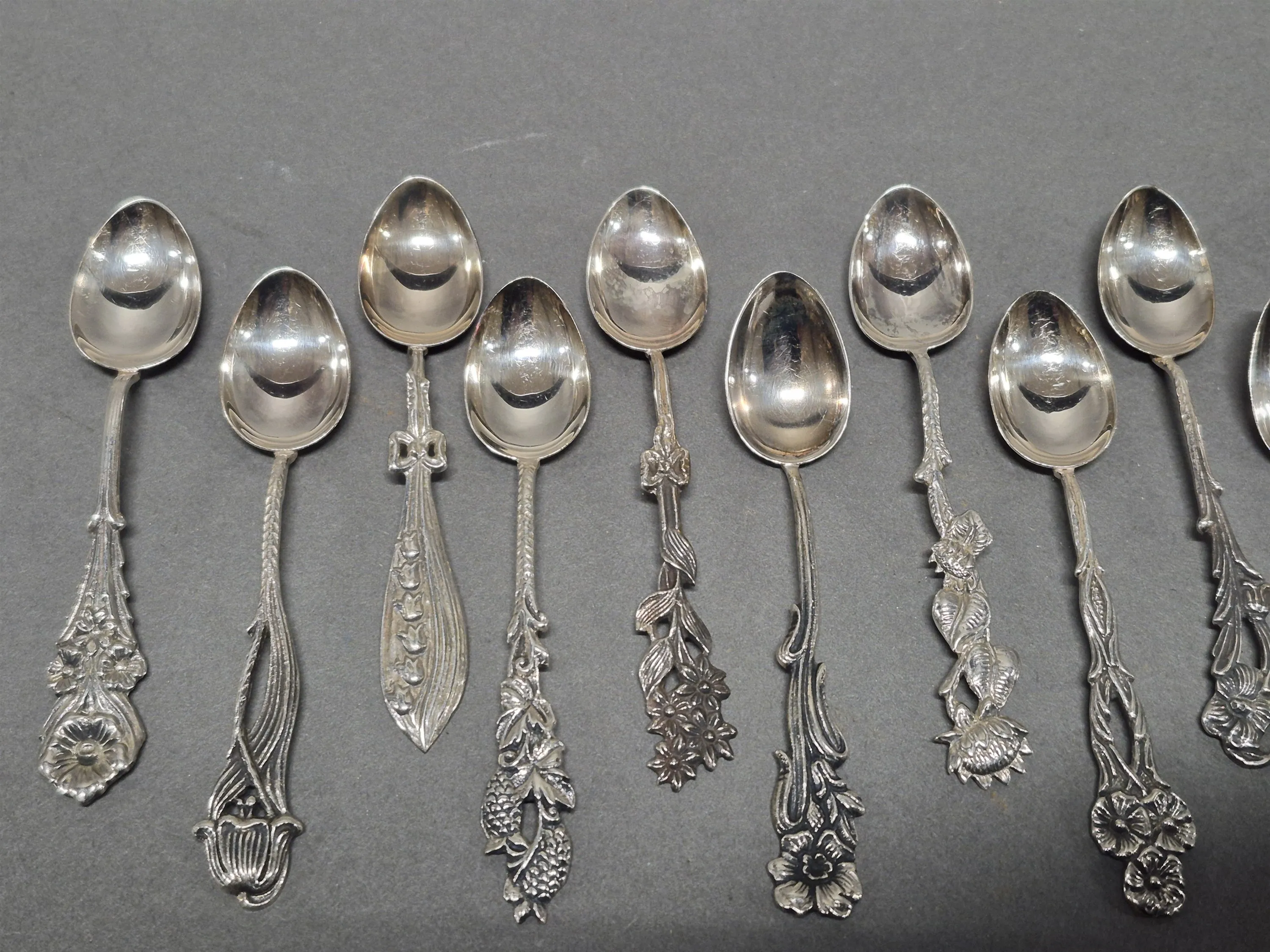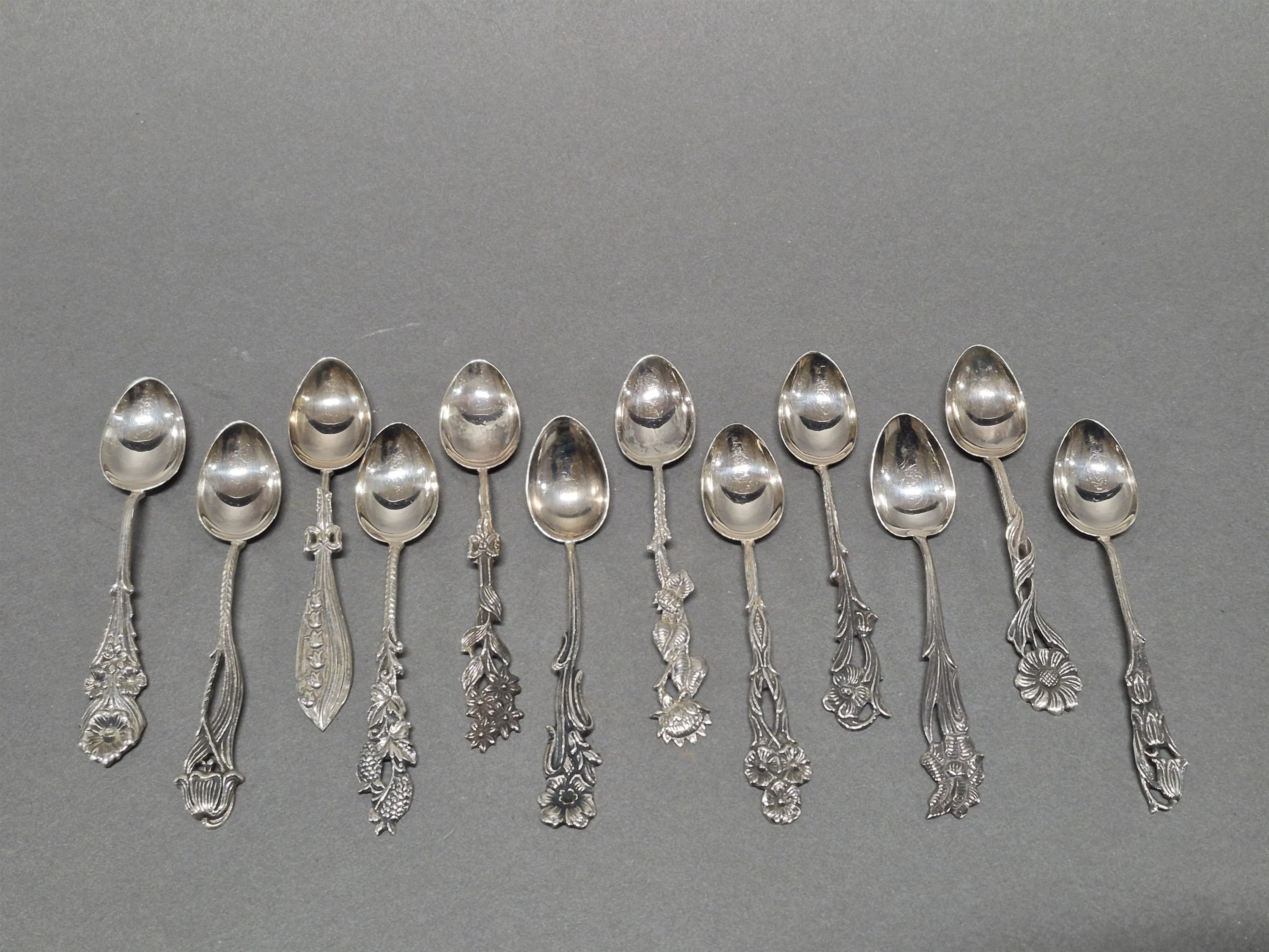 18454. Kaffeskedar 12 st i silver, kattfot, längd 9,5 cm, totalvikt 108 gram