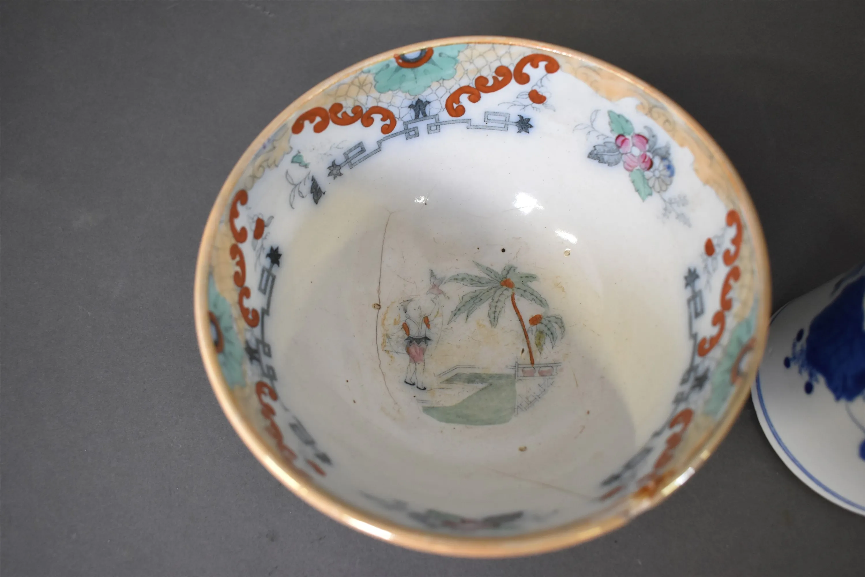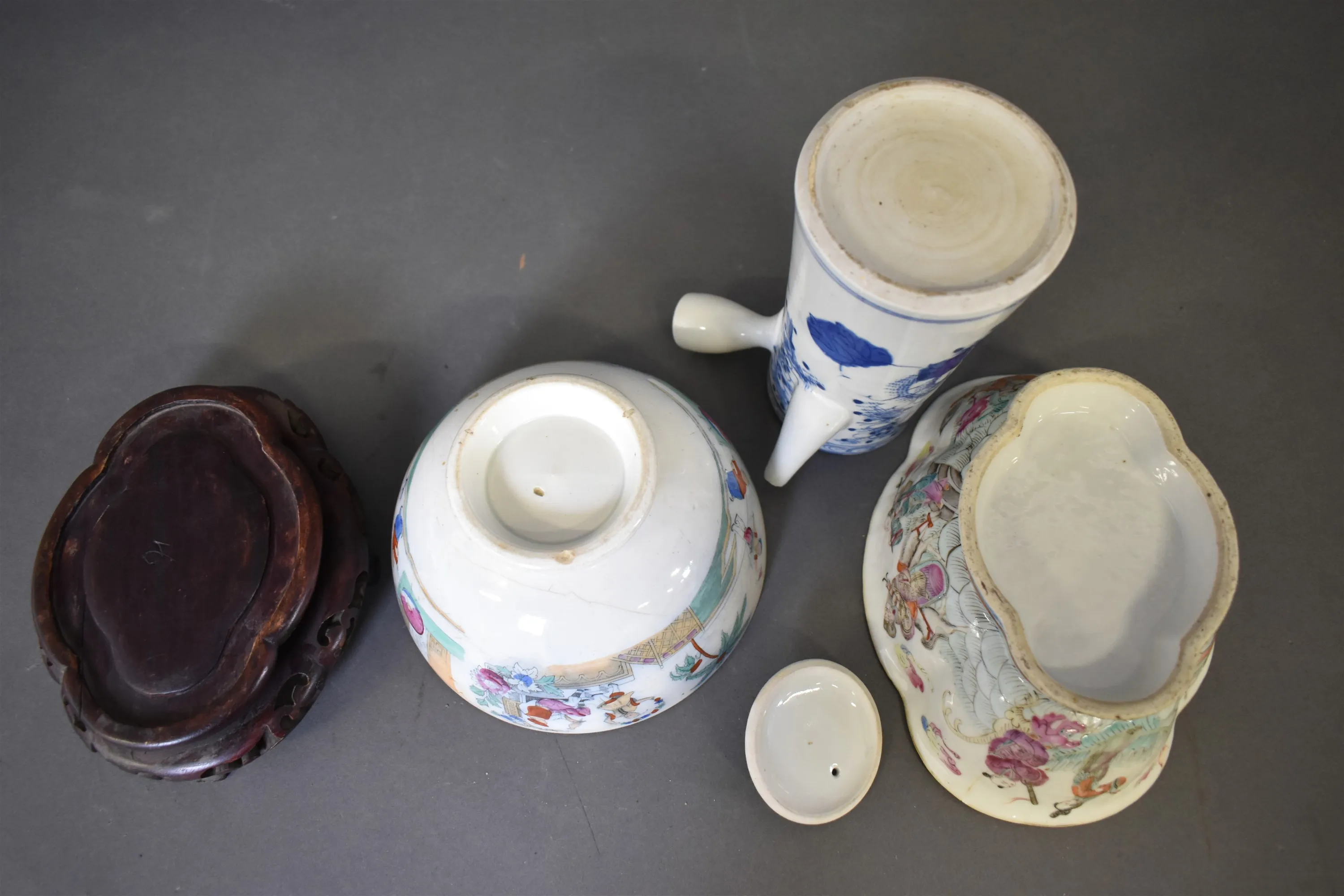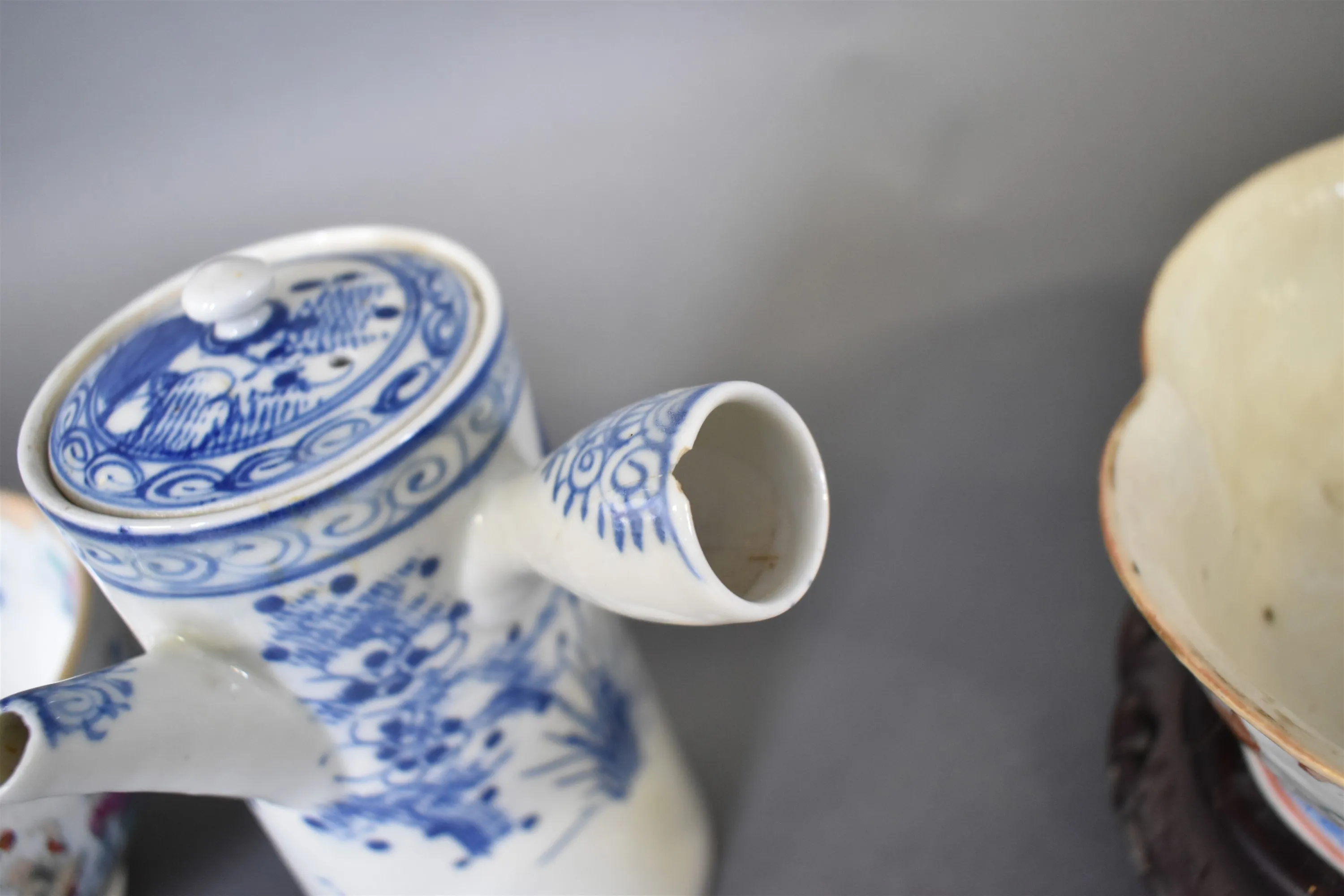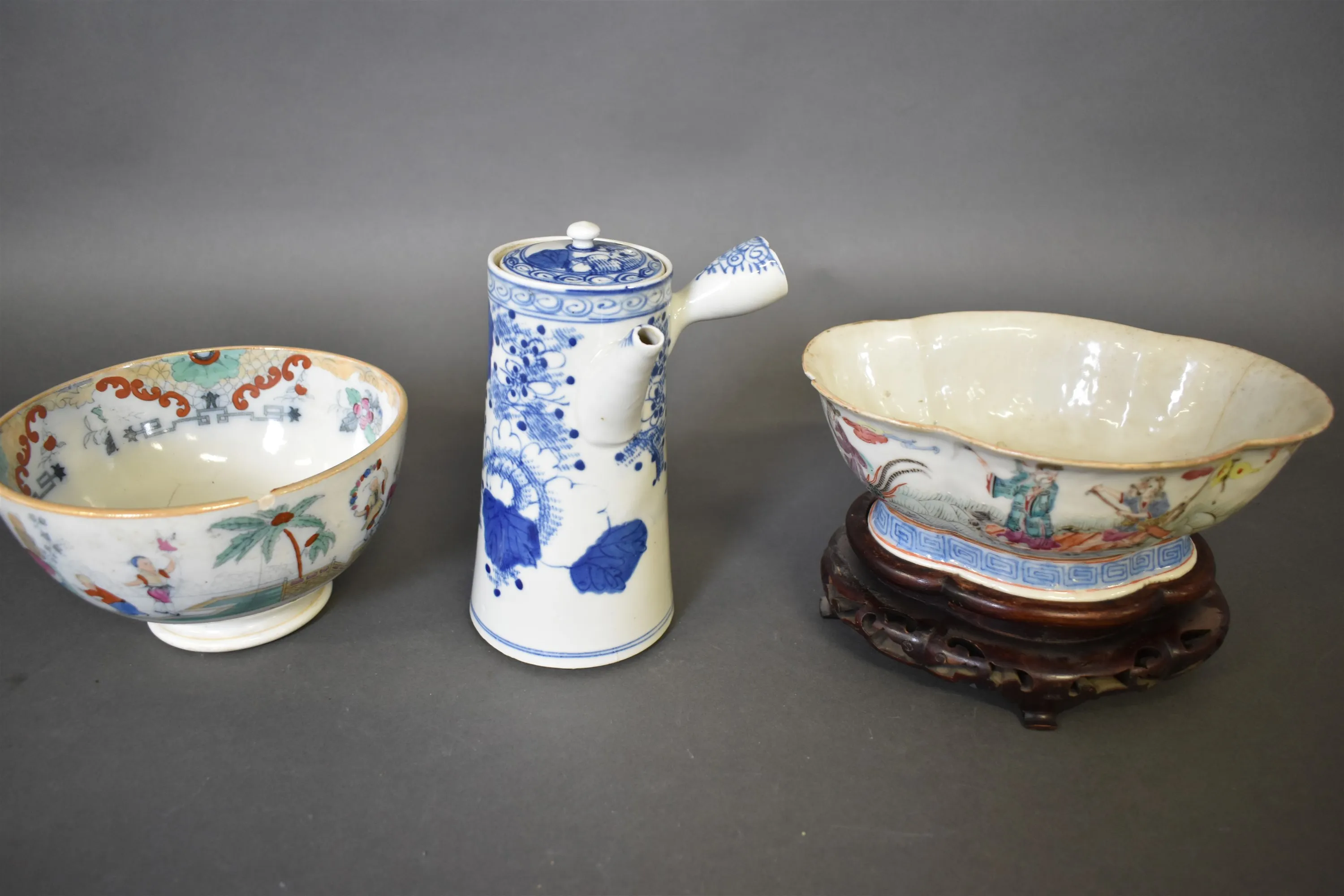 15535. Kanna & skålar 2 st Ostindisk dekor, defekter finns se bilder, högsta 20 cm