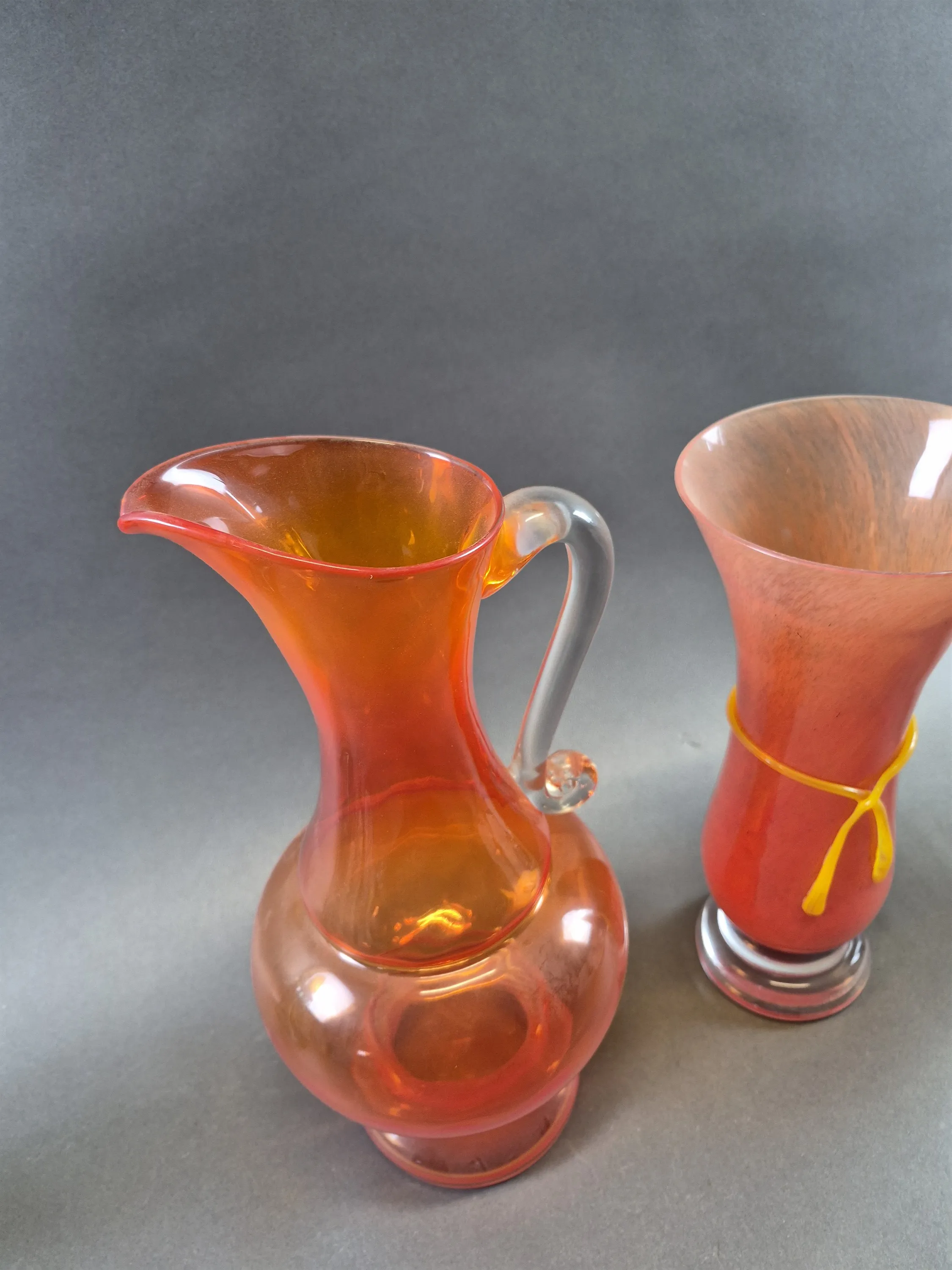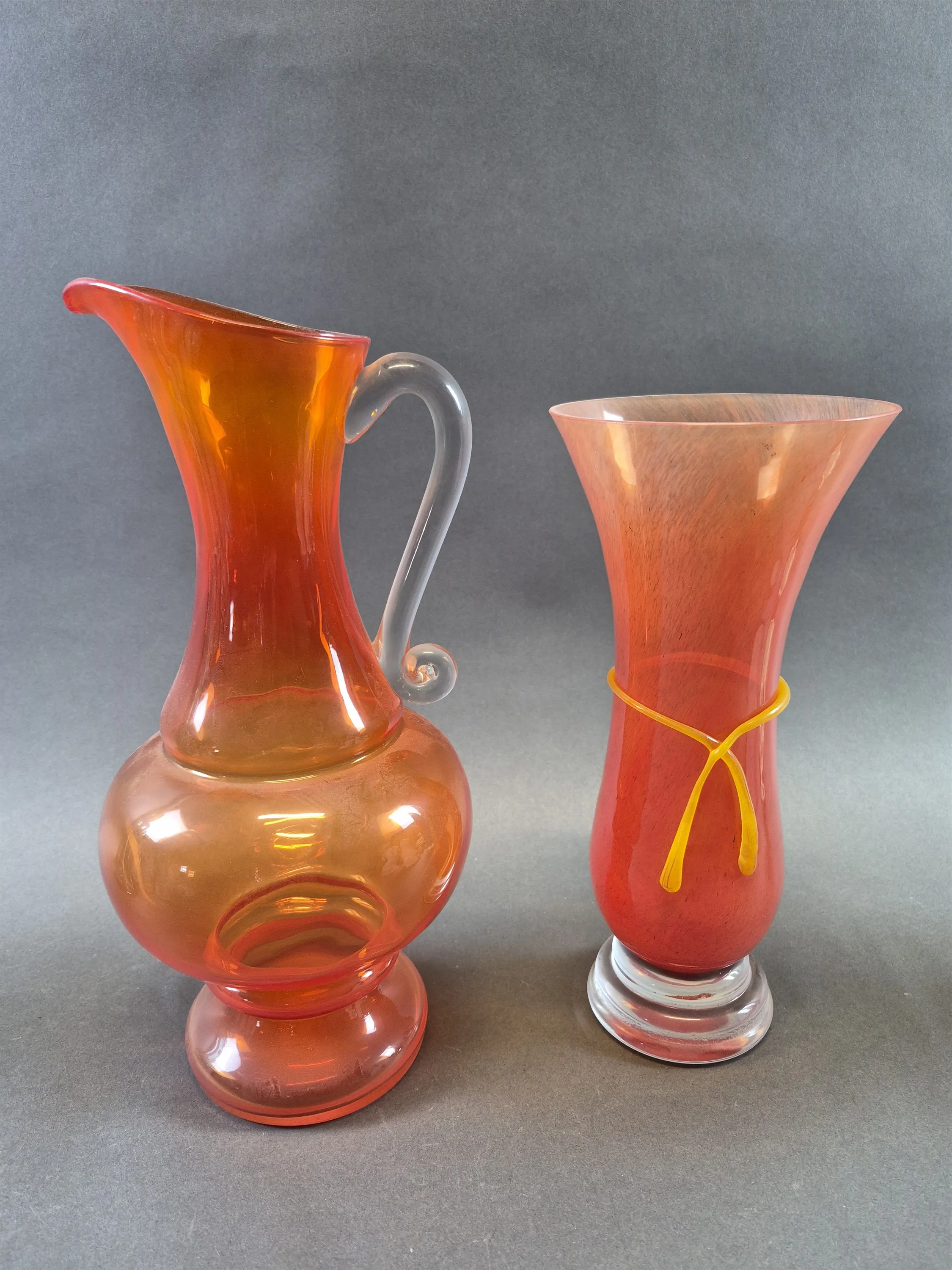 20455. Kanna och vas, orangetonat glas, högsta höjd 34 cm