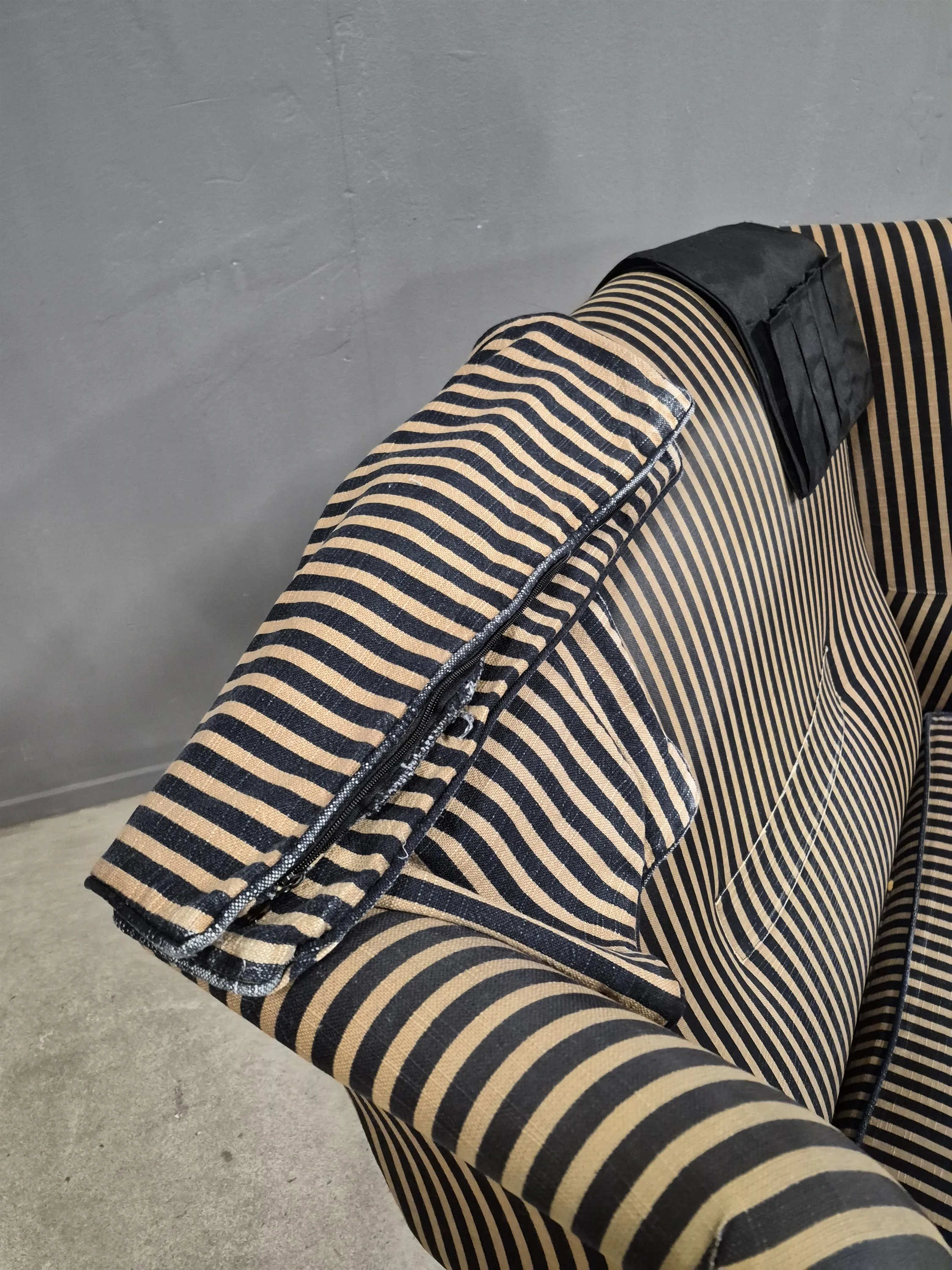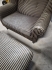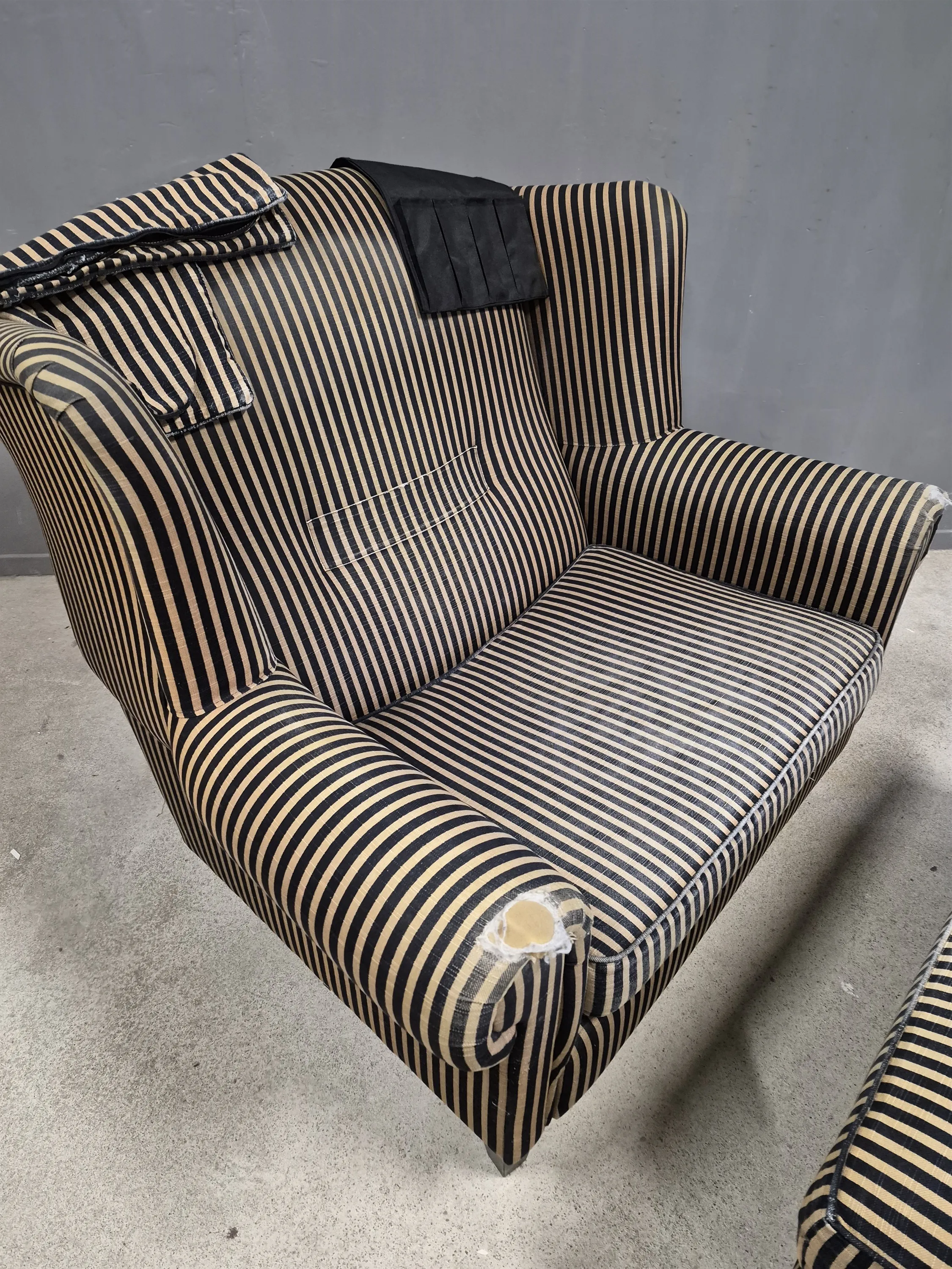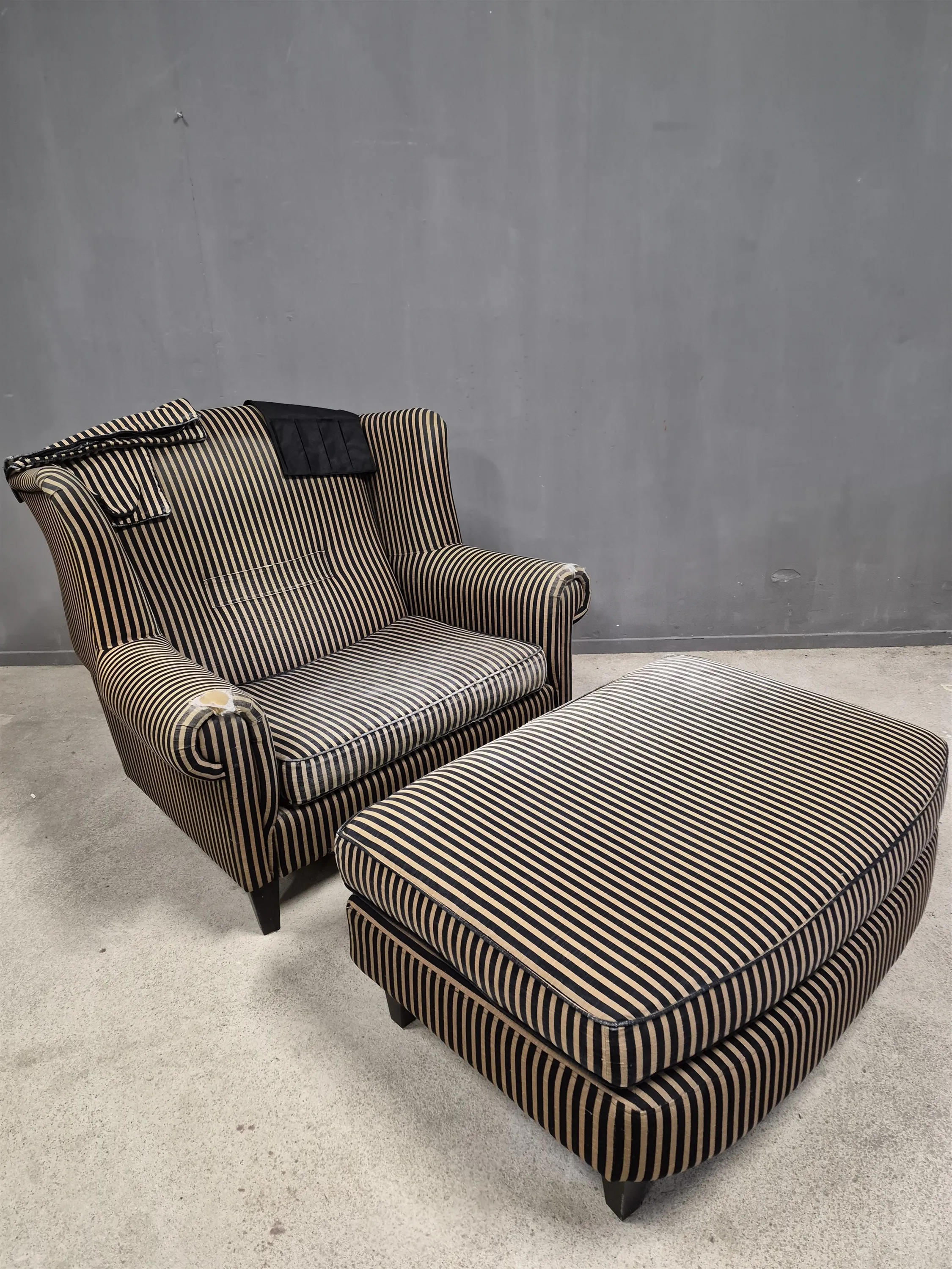 19483. Karmfåtölj med fotpall, slitage skador se bild, höjd 93 cm, bredd 105 cm, djup 87 cm