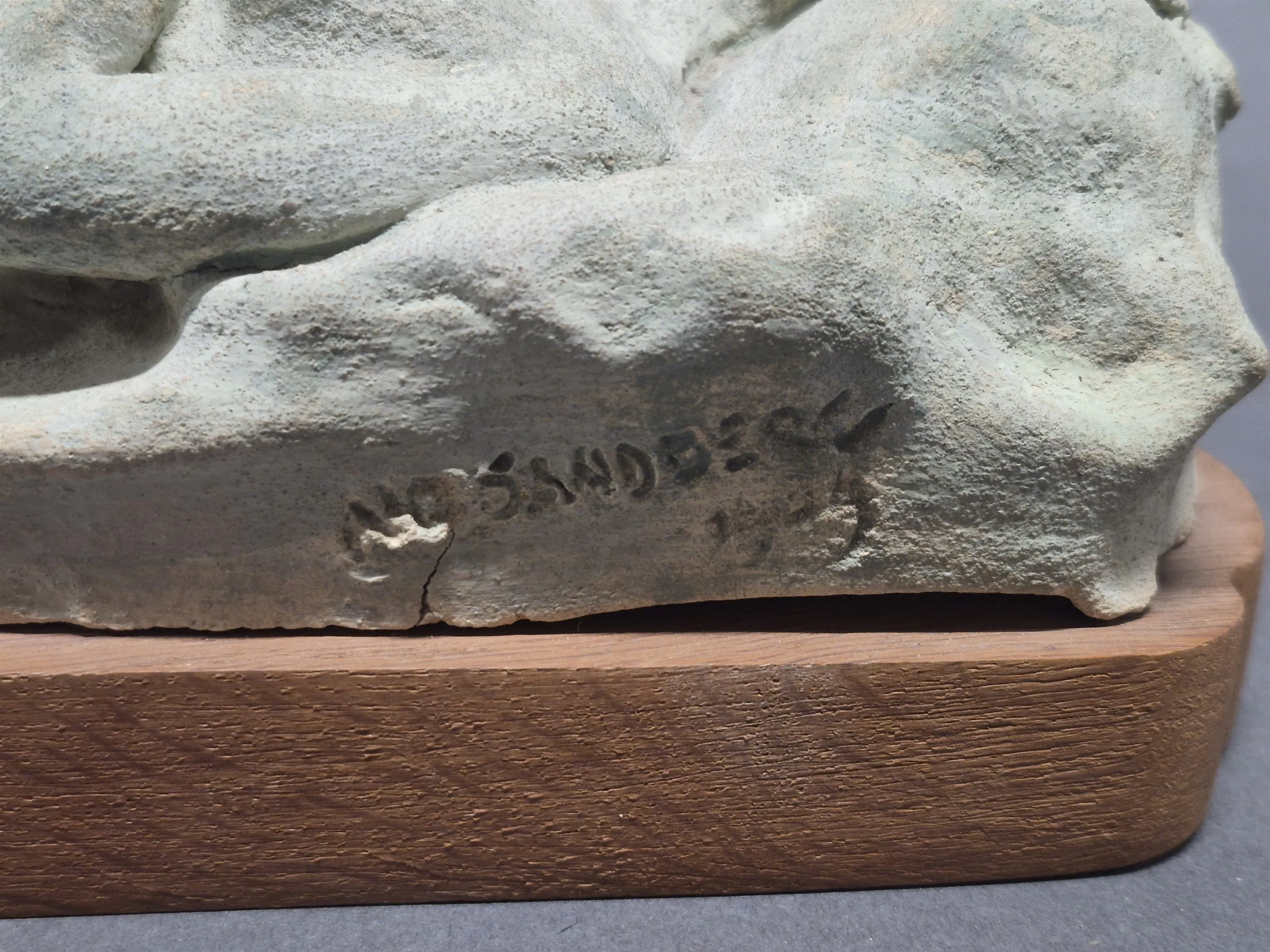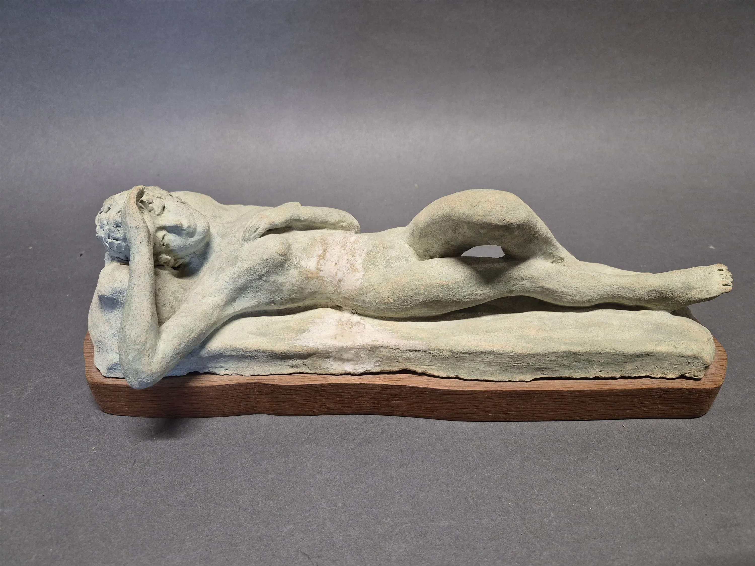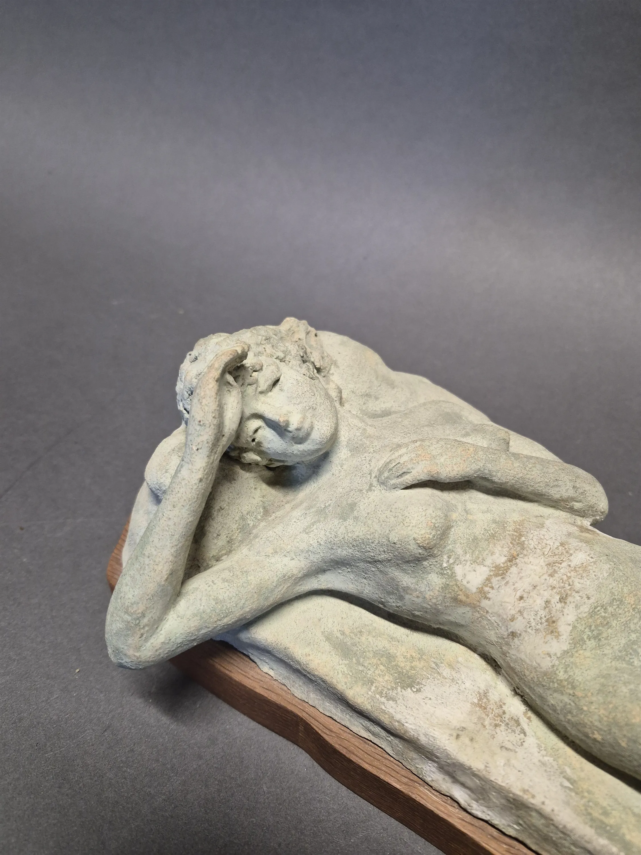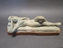 18065. Keramikfigur på träplatta, liggande kvinna, signerad N O Sandgren längd 35 cm