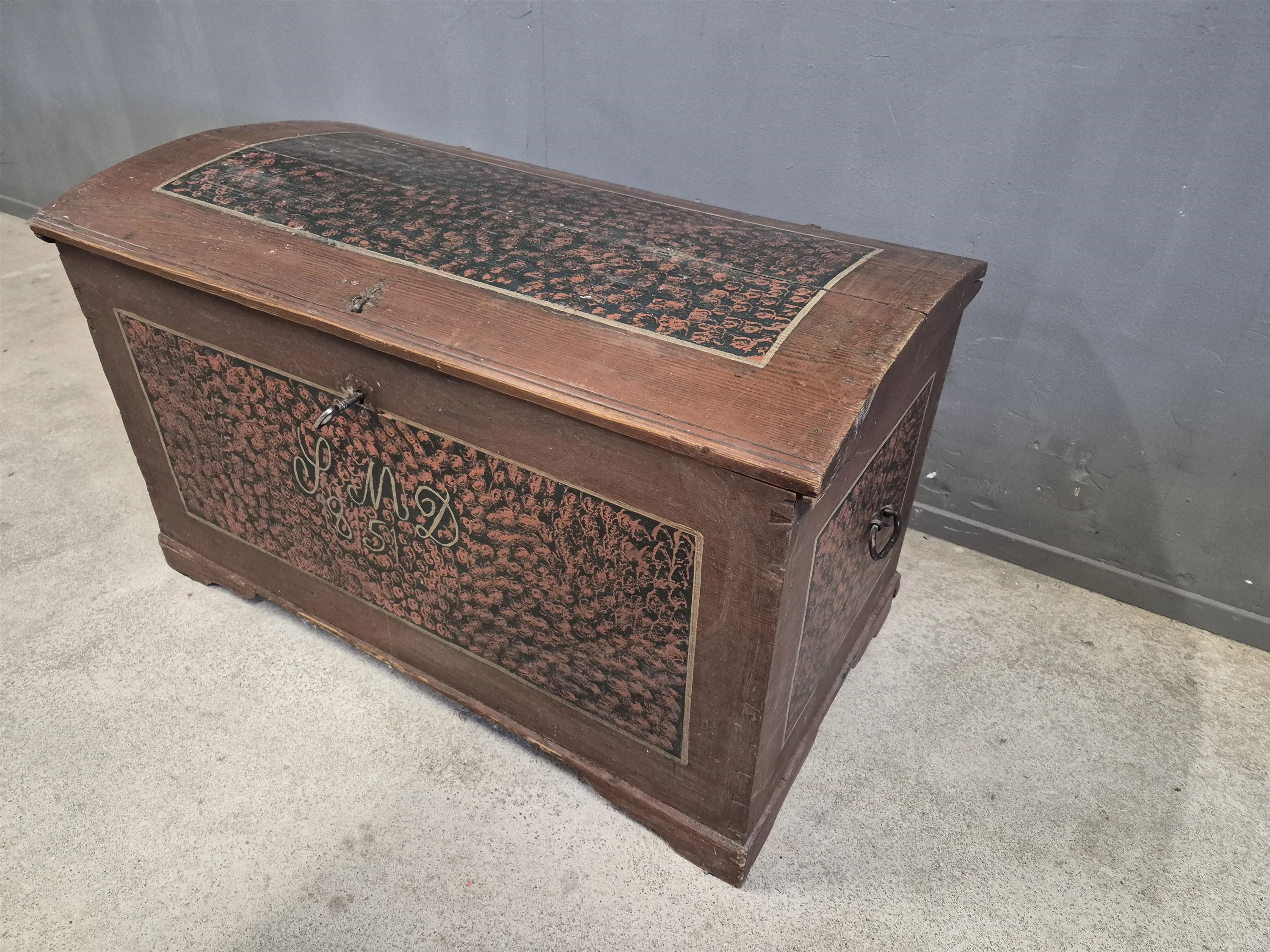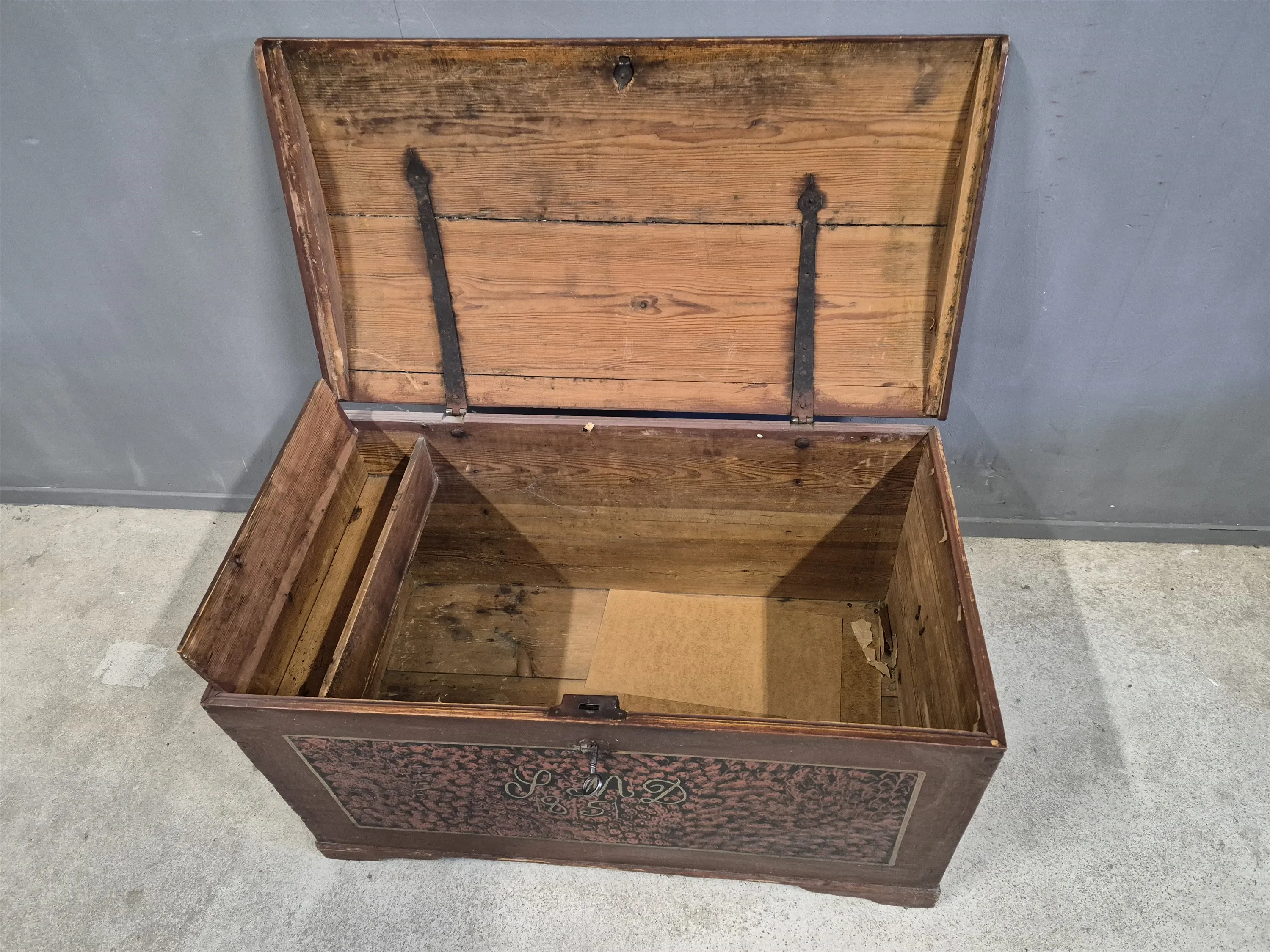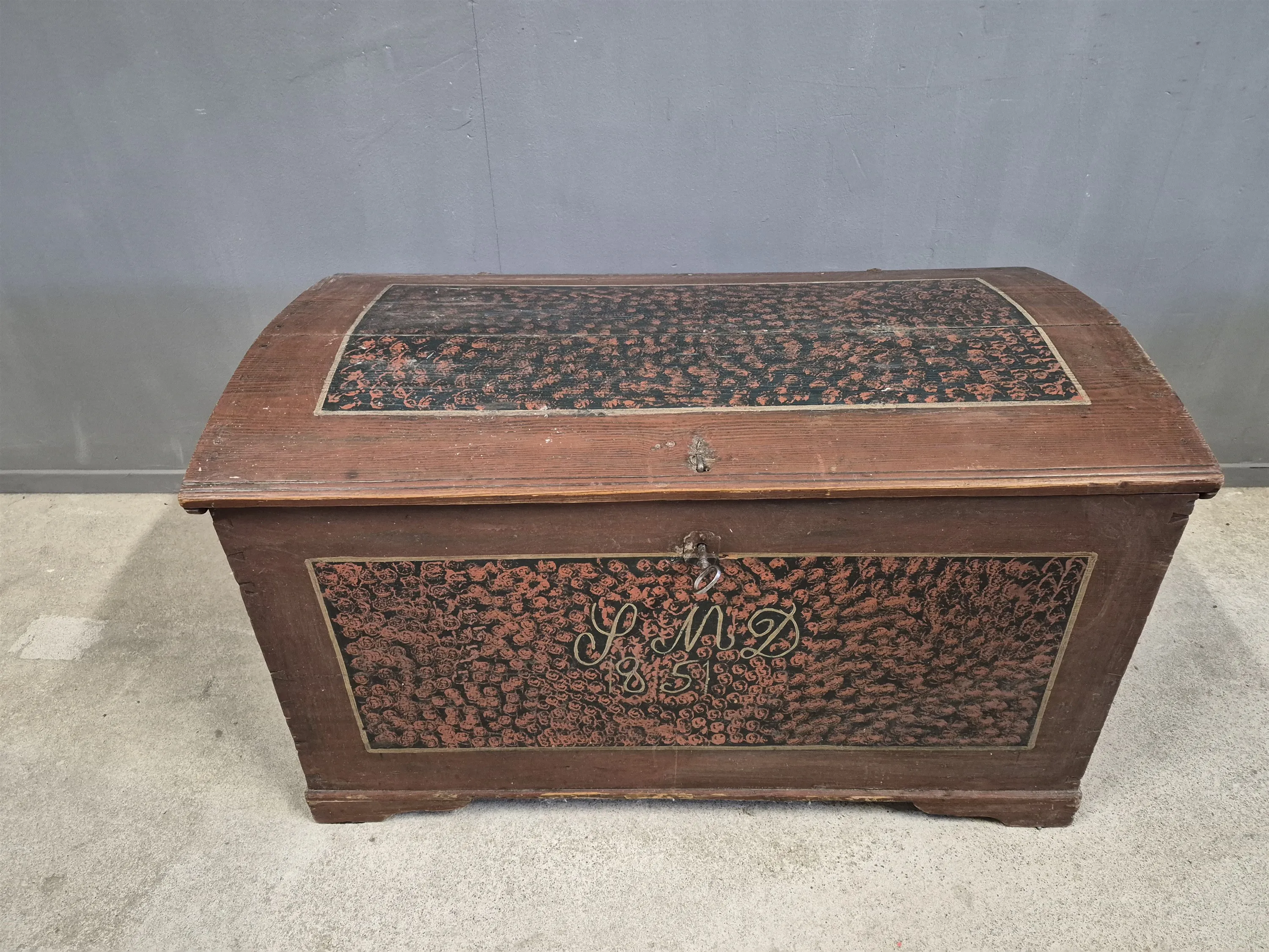 19296. Kista originalmålad 1851, furu,lås & nyckel fungerar, Höjd 66 cm, längd 110 cm, djup 59 cm