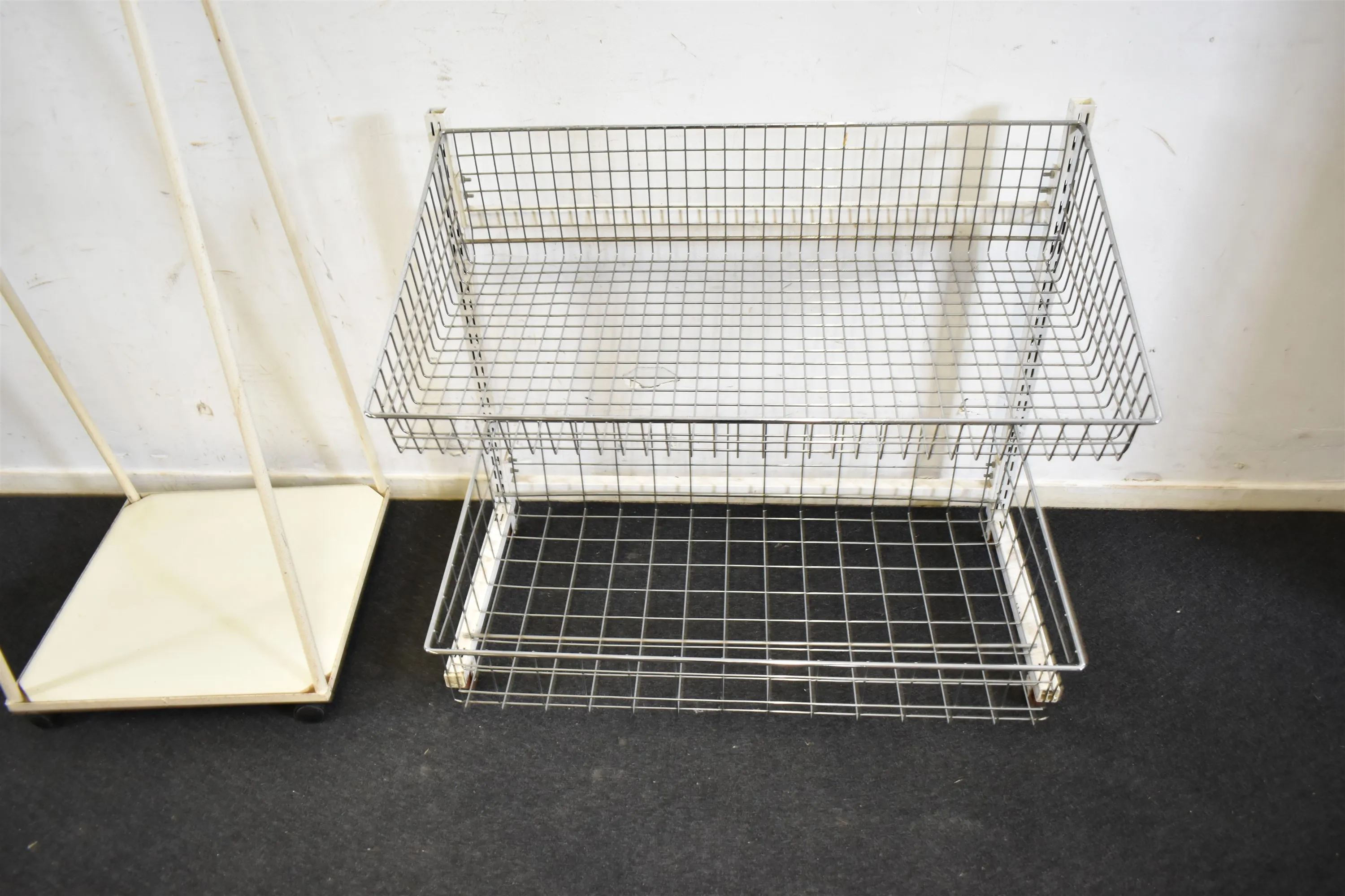 14699. Klädhängare 2 st och butiksvagn med korgar, mått på vagn 89x50 cm