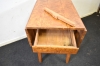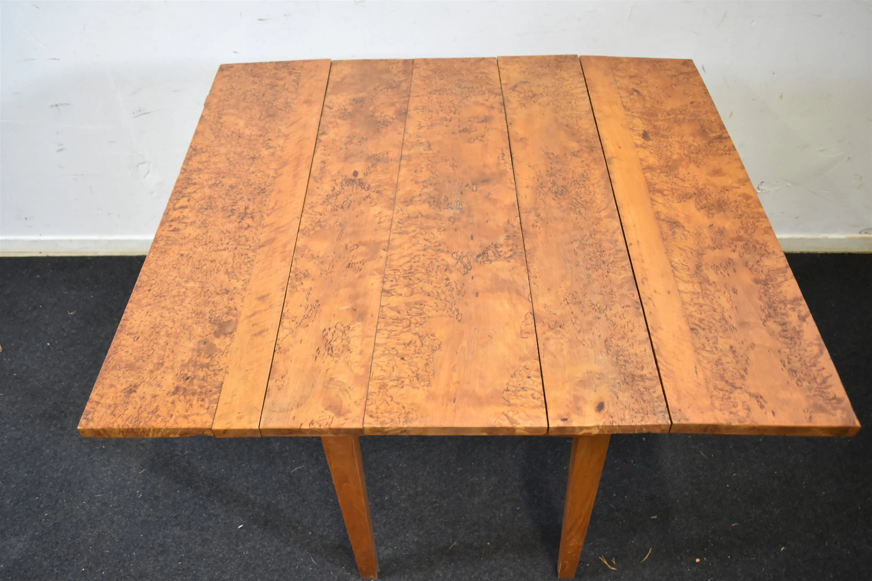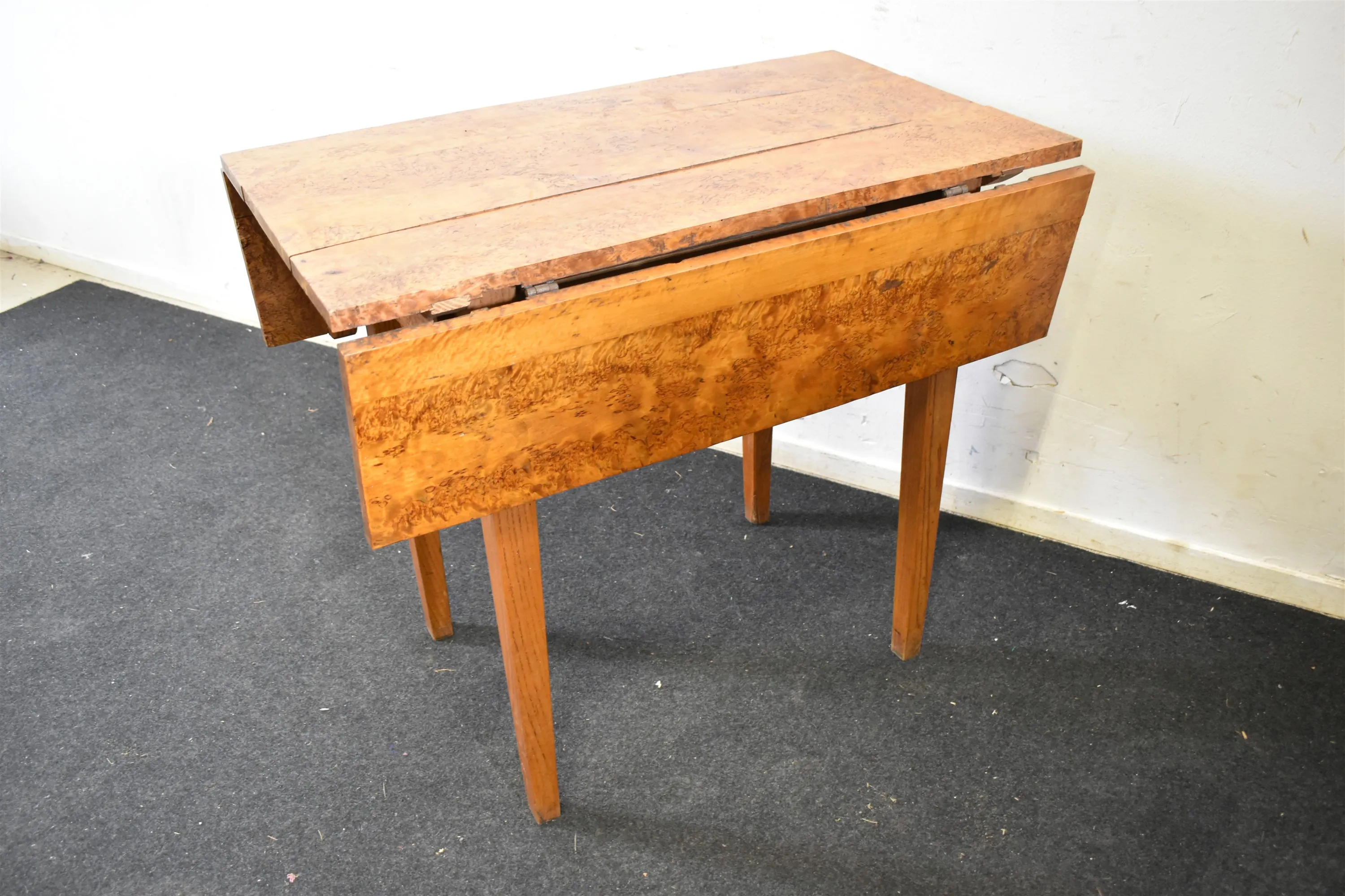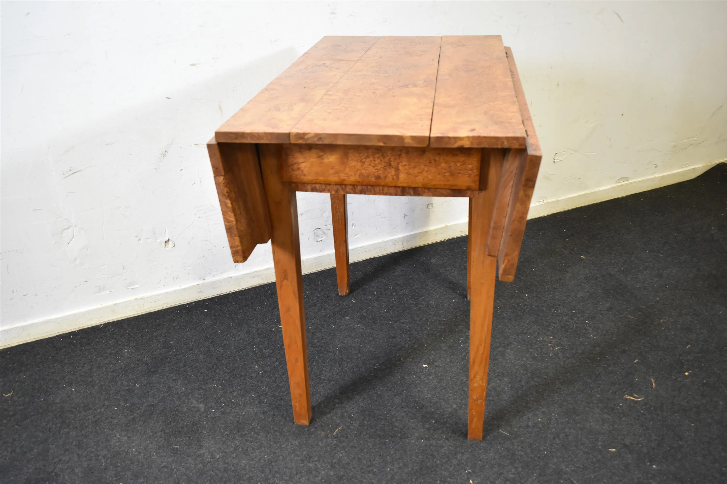 14025. Klaffbord med låda 1800-tal, masurbjörk höjd 78 cm, bredd 89 cm, längd 50 cm utfällt 95 cm