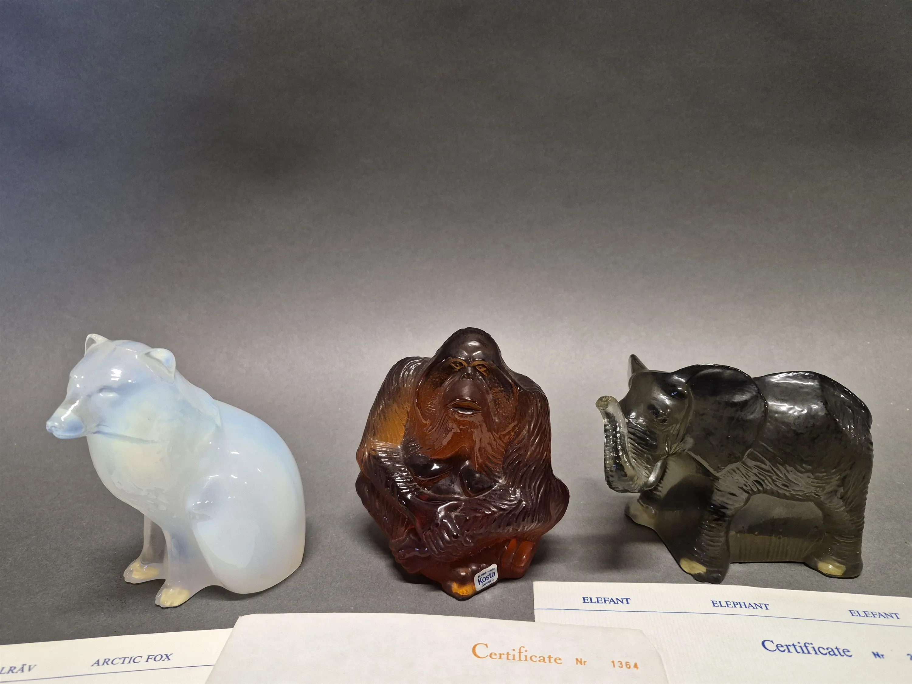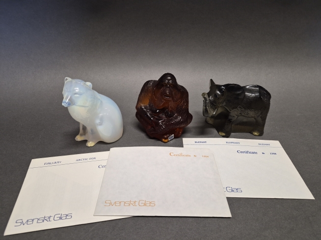 18751. Konstglas 3 st Kosta K. Engman & P.Hoff, fjällräv, orangutang och elefant, limited edition för WWF, högsta höjd 12 cm