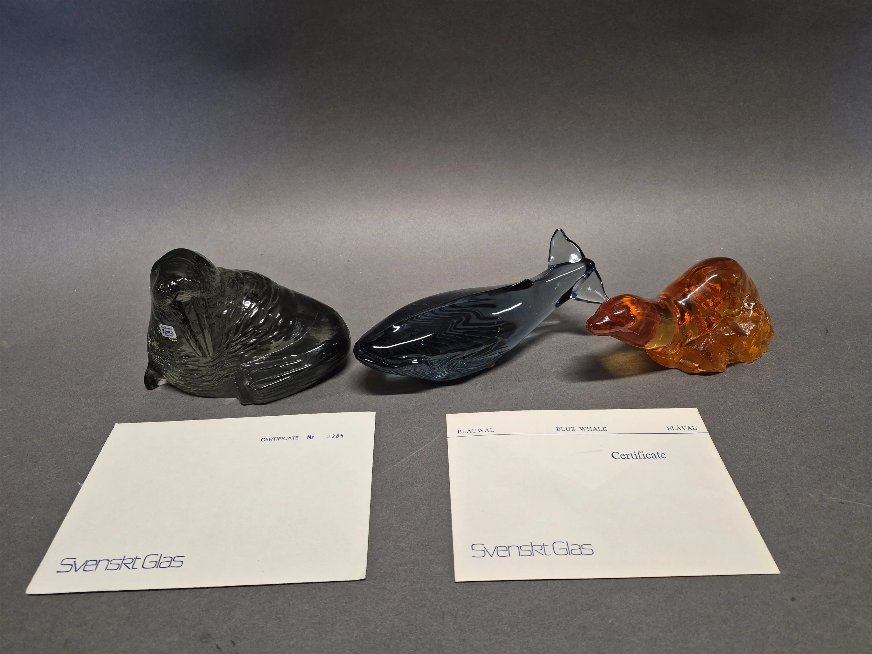 18753. Konstglas 3 st Kosta och Orrefors O. Alberius & P.Hoff, valross, blåval och utter, limited edition för WWF, längsta mått19 cm