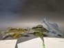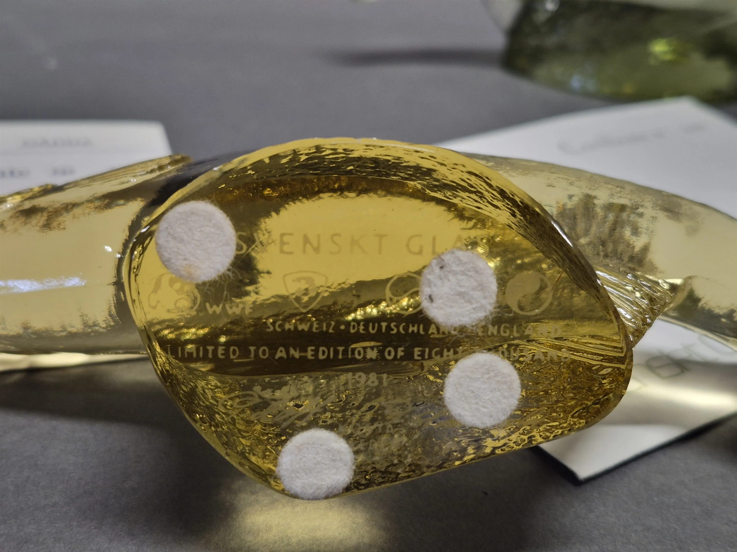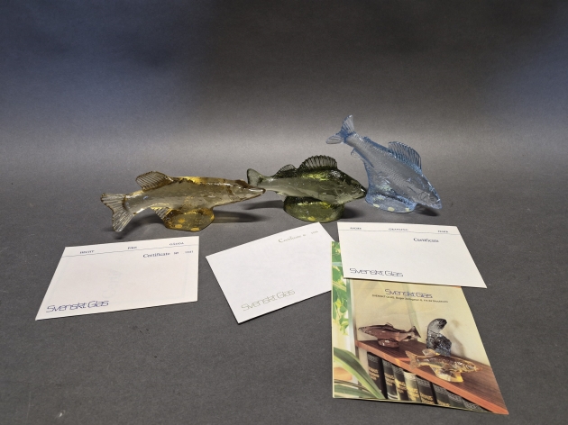 18748. Konstglas Kosta 3 st fiskar P. Slominski & P.Hoff, gädda, aborre och harr limited edition för WWF, längsta mått 22 cm