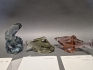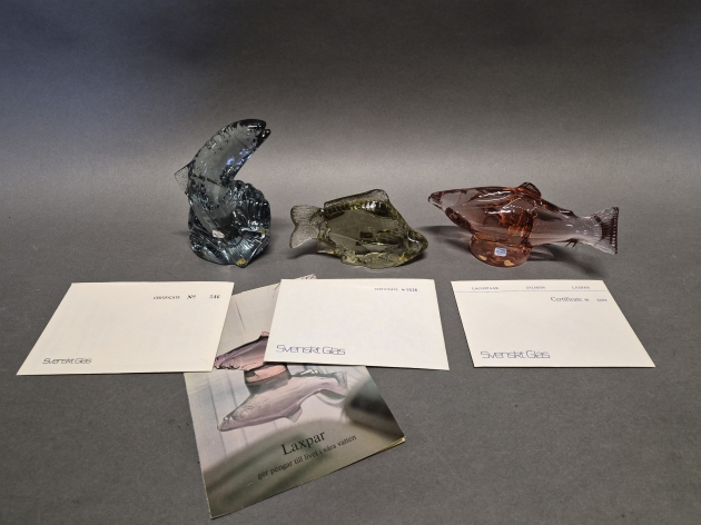 18747. Konstglas Kosta 3 st fiskar P. Slominski & P.Hoff, lax karp och öring limited edition för WWF, högsta höjd 16 cm