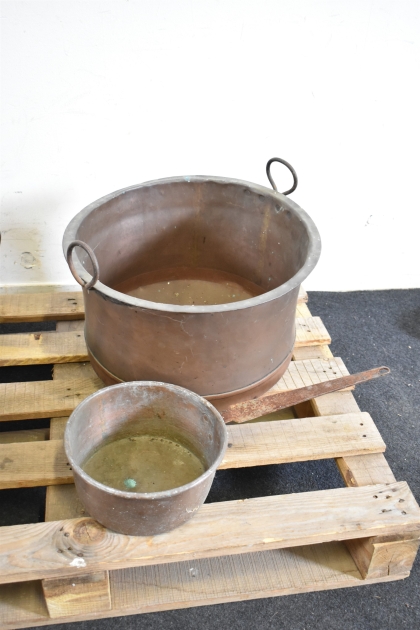 13404. Koppargryta och kastrull, mått på gryta höjd 43 cm, diameter 48 cm