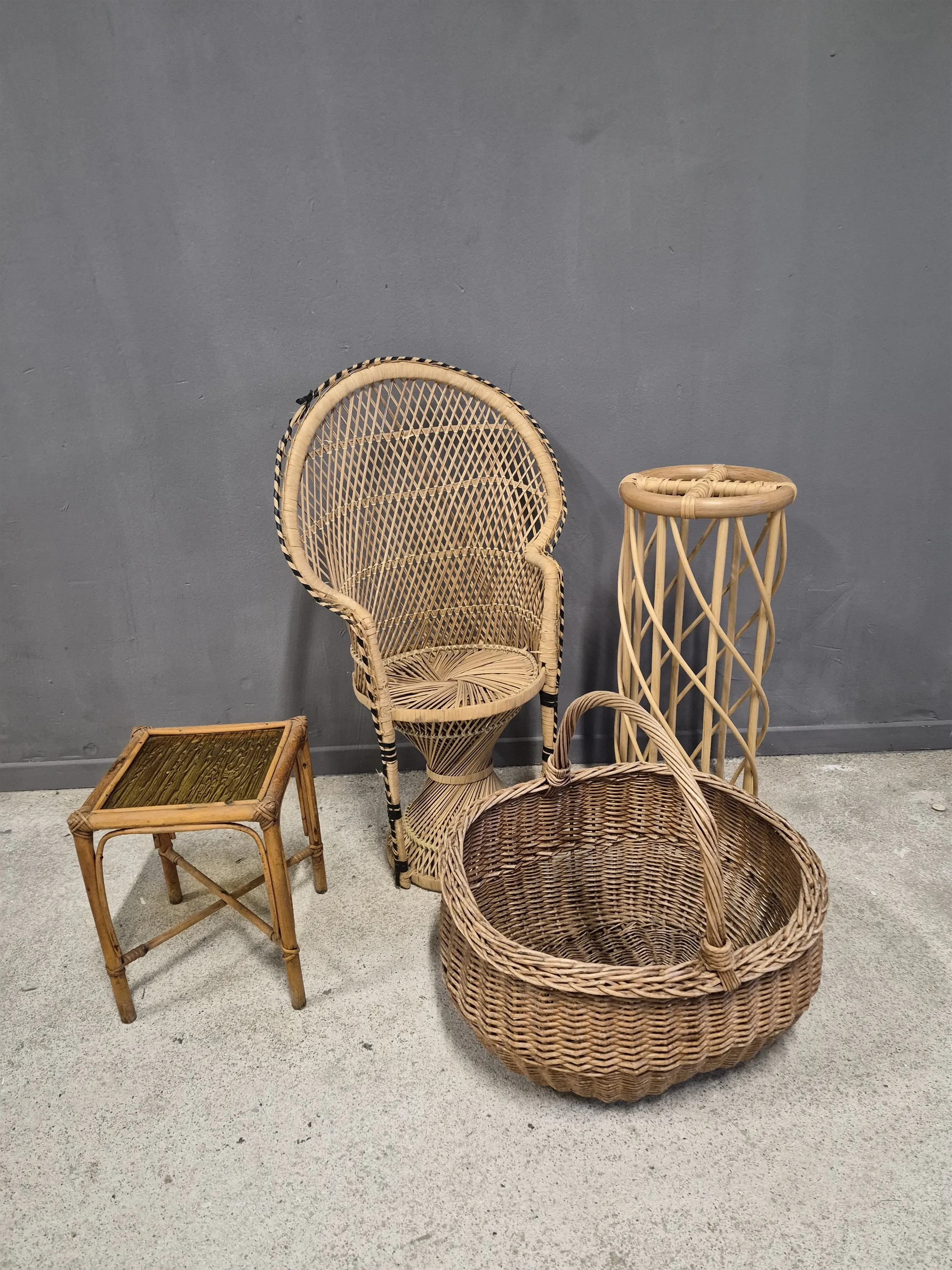 17111. Korgföremål 4 st; piedestaler, stol och korg, högsta höjd 78 cm