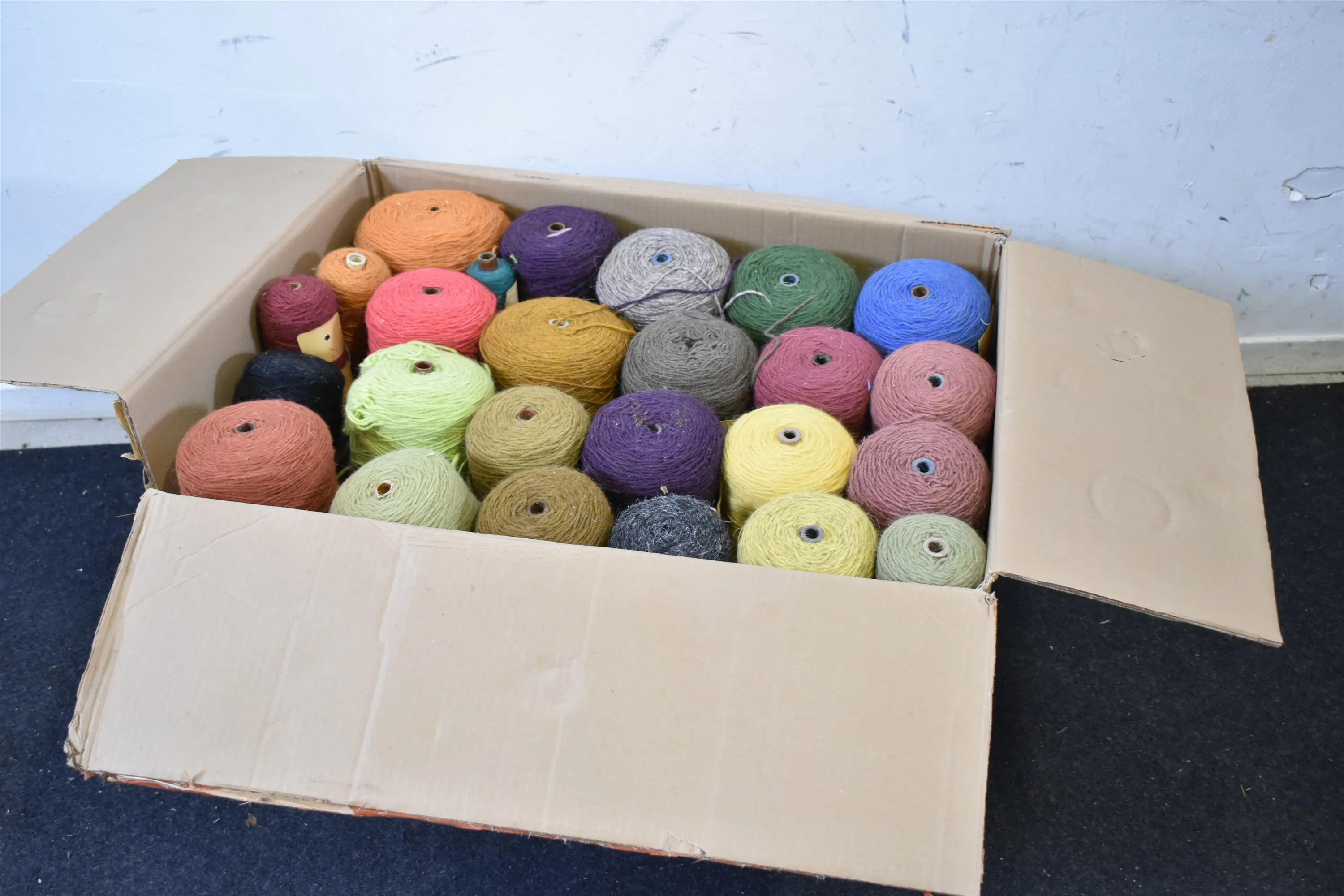 14297. Låda med garner, mått på låda längd 68 cm, bredd 47 cm