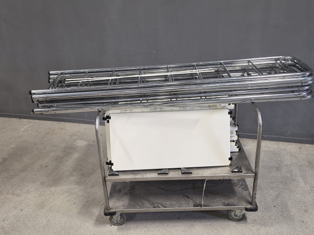 20290. Lagerhylla, 6 gavlar höjd 182 cm, bredd 42 cm, längd hyllplan 85 cm, några hyllblan böjda