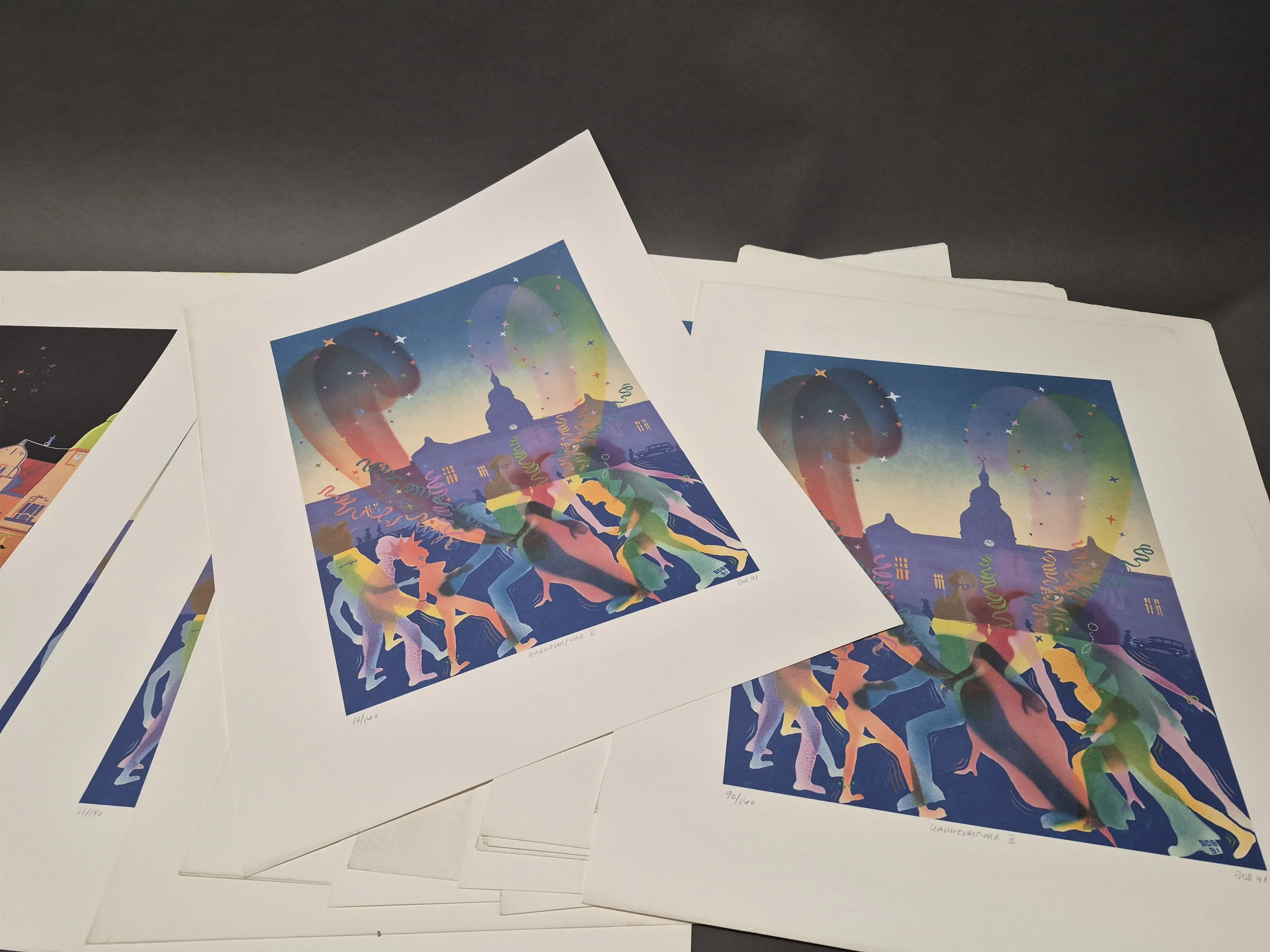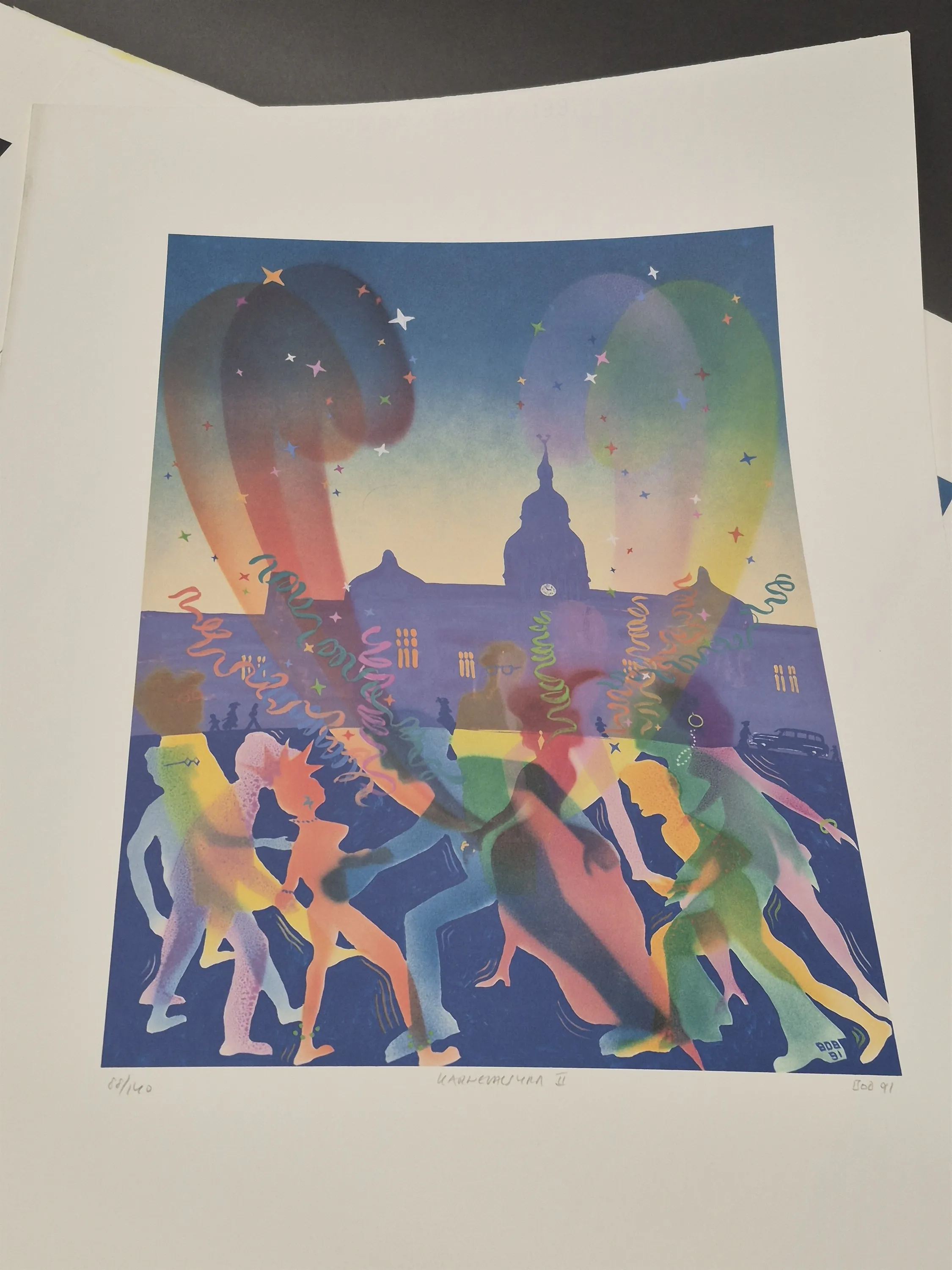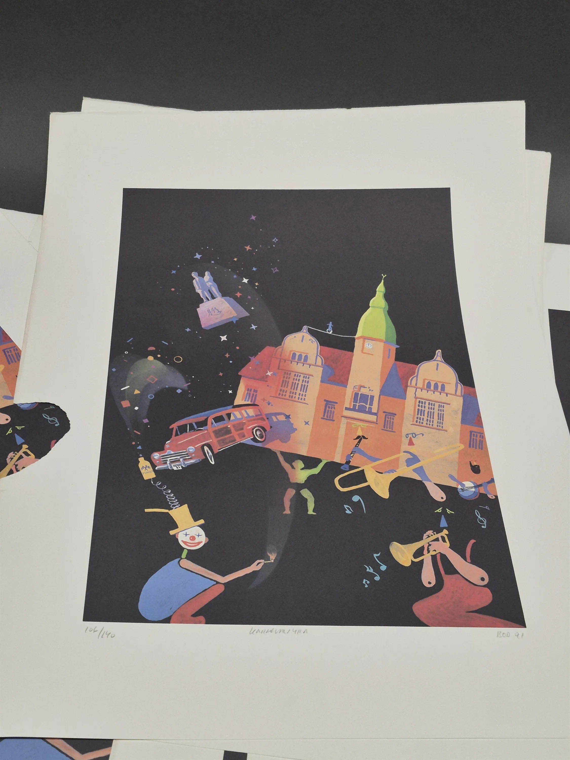 18103. Litografiblad "Karnevalyra" 12 st och "Karnevalyra II" 24 st, defekta blad finns, Karlshamns motiv mått 62,5x47,5 cm