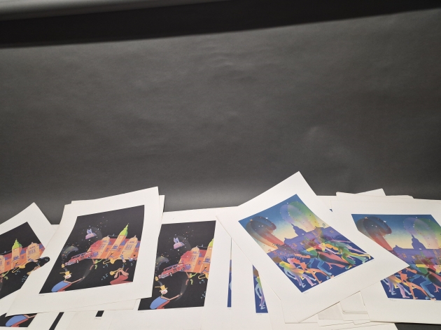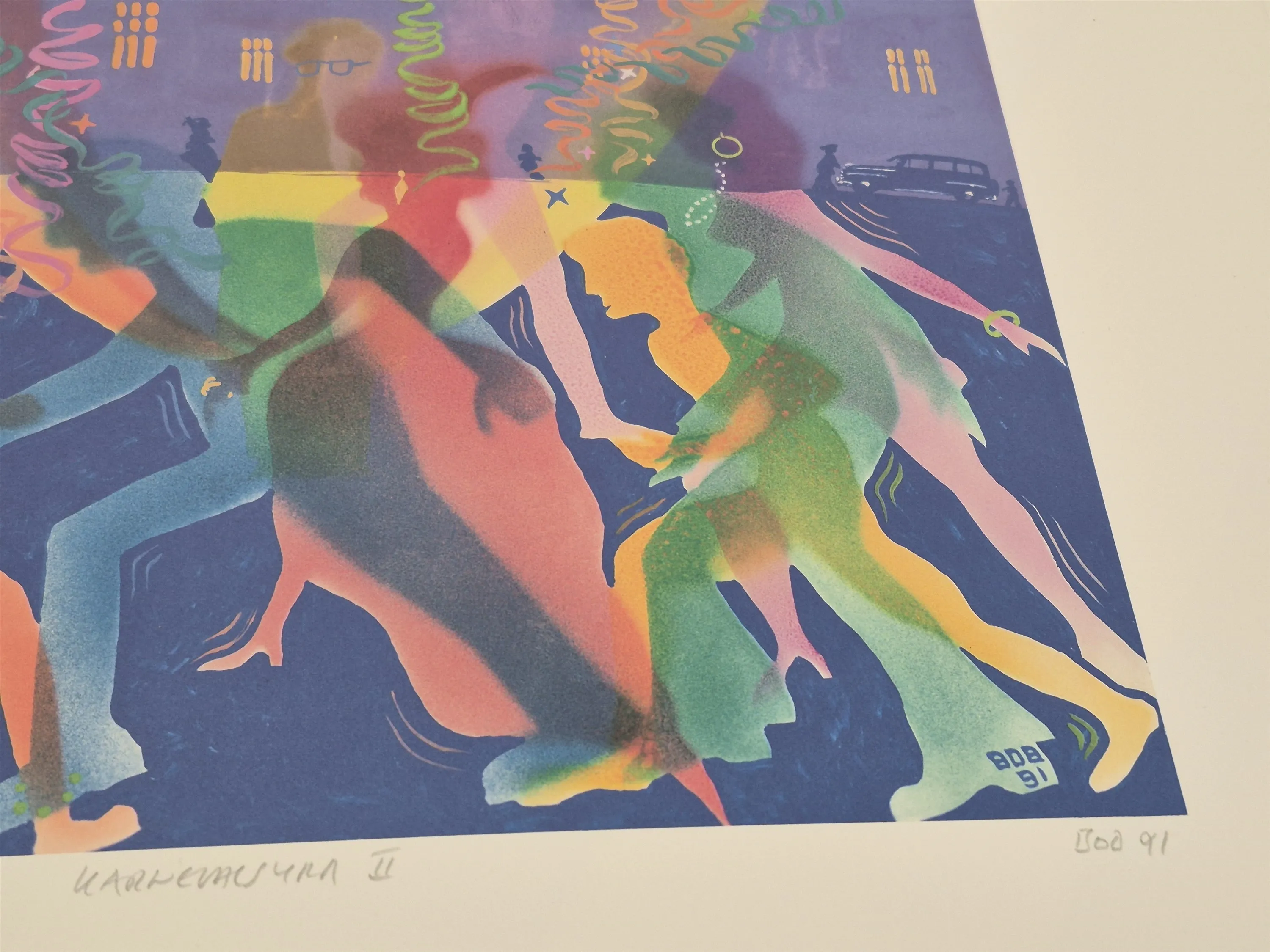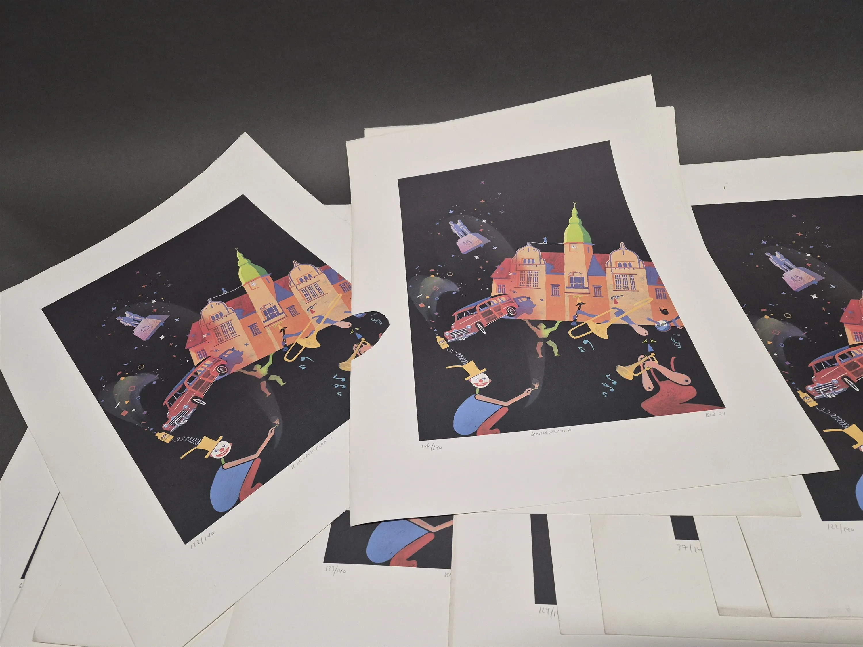 18103. Litografiblad "Karnevalyra" 12 st och "Karnevalyra II" 24 st, defekta blad finns, Karlshamns motiv mått 62,5x47,5 cm
