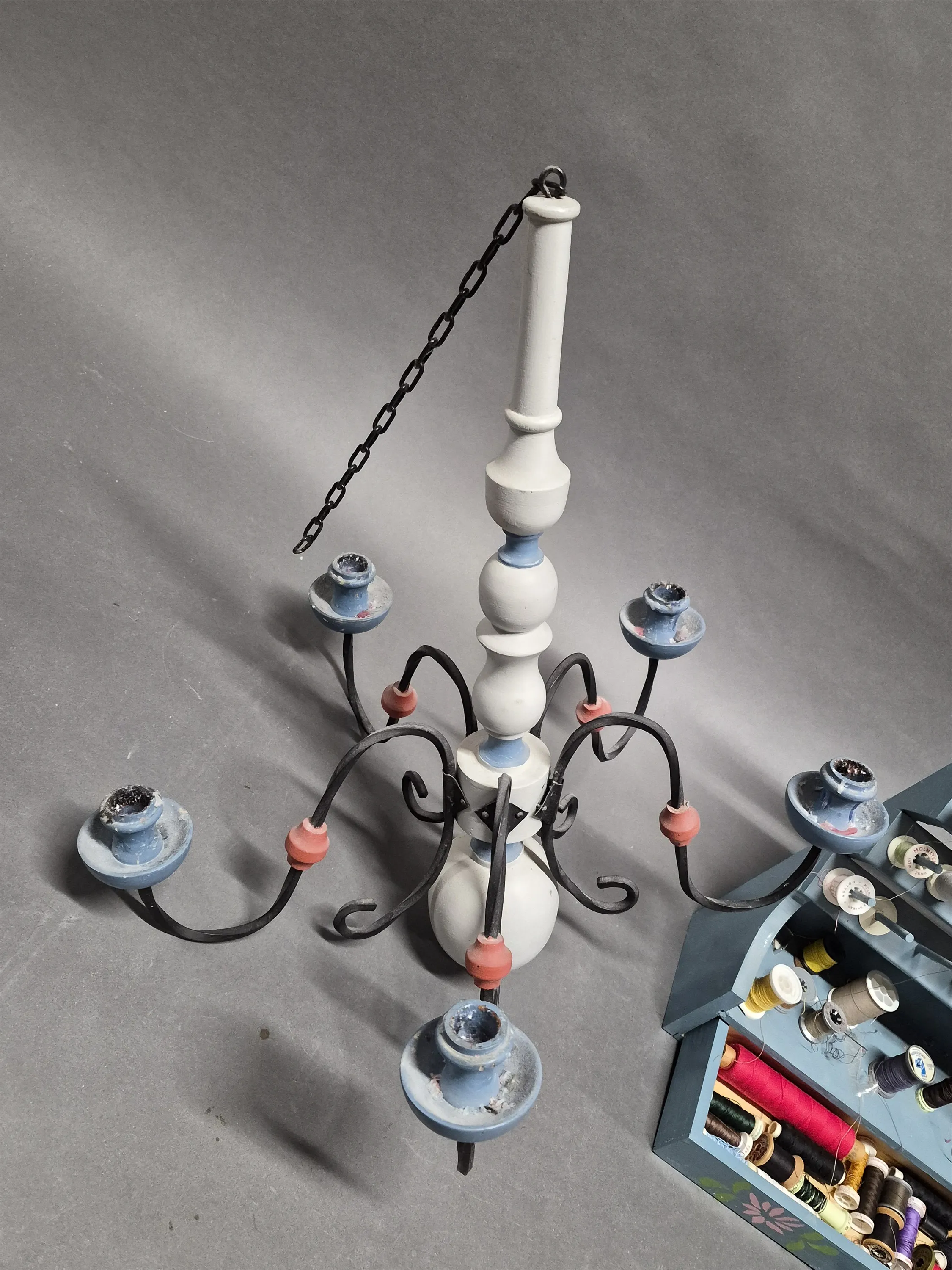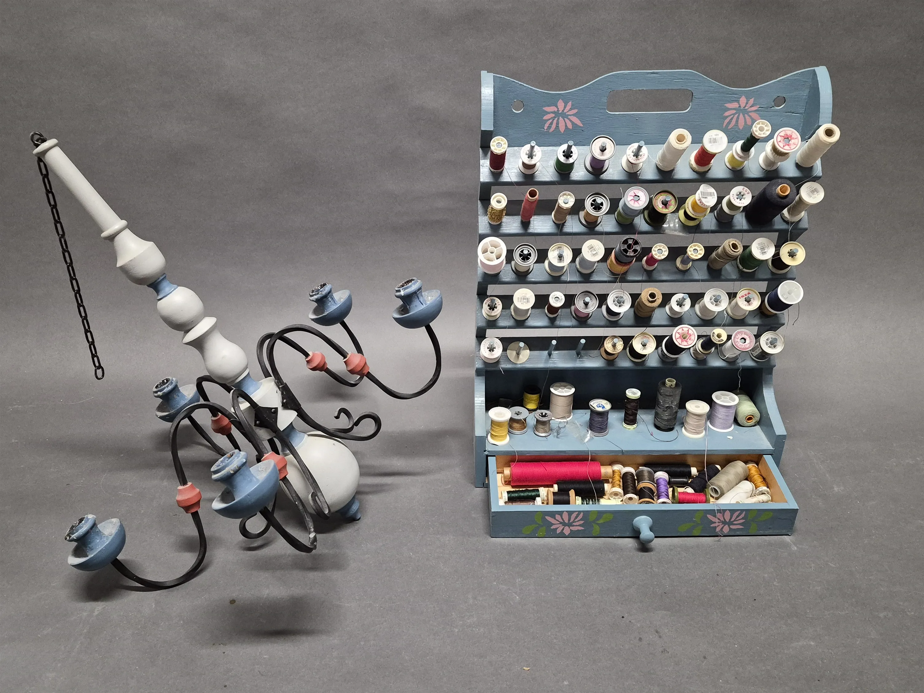 19117. Ljuskrona trä/metall & hylla för trådrullar höjd 53 cm