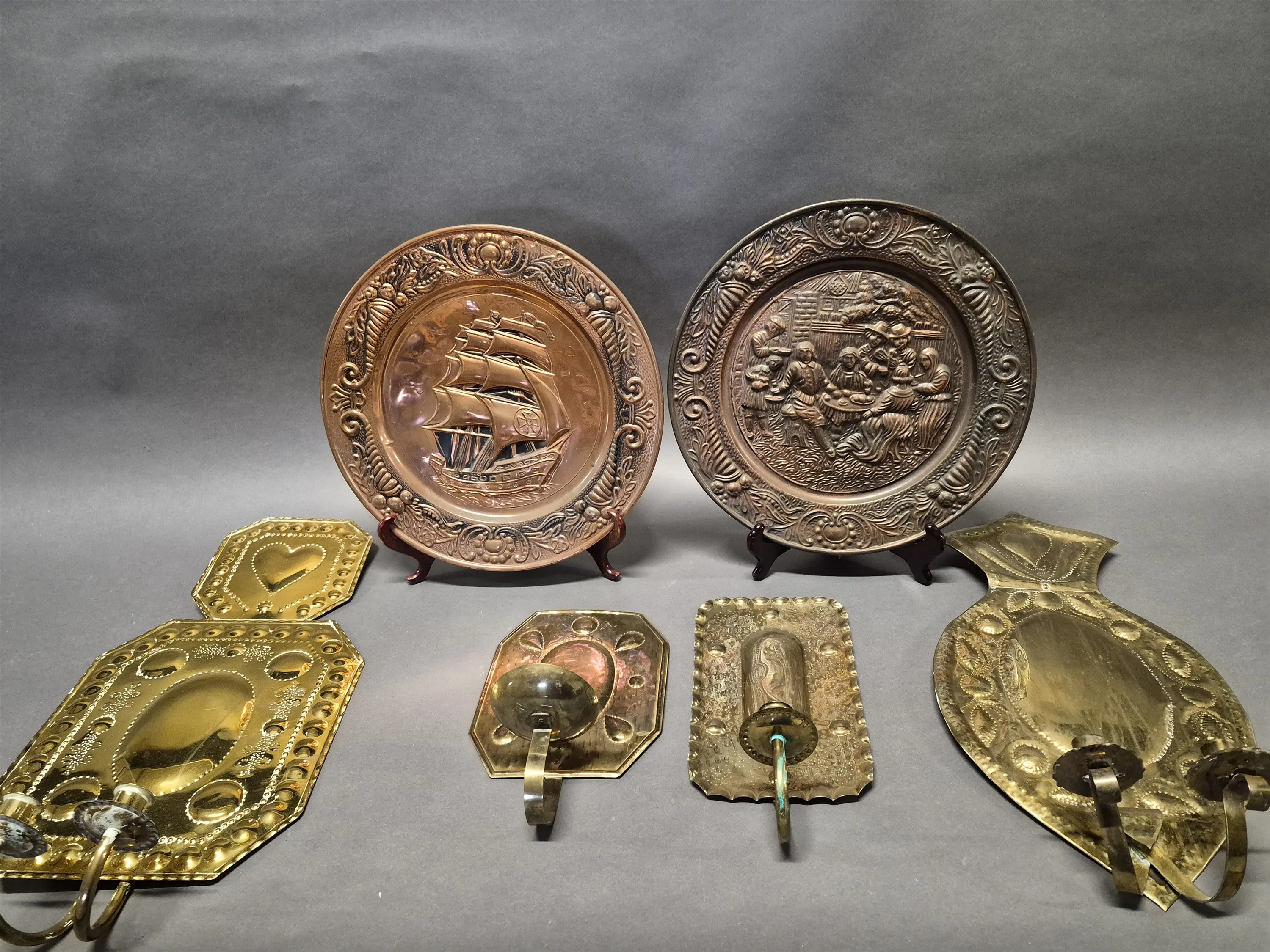 19365. Ljusplåtar och fat, mässing och koppar, längsta mått 54 cm
