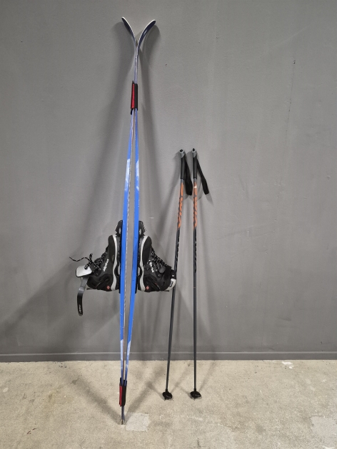 16887. Längdskidor 200 cm, stavar 140 cm, pjäxor Alpina troligen 41