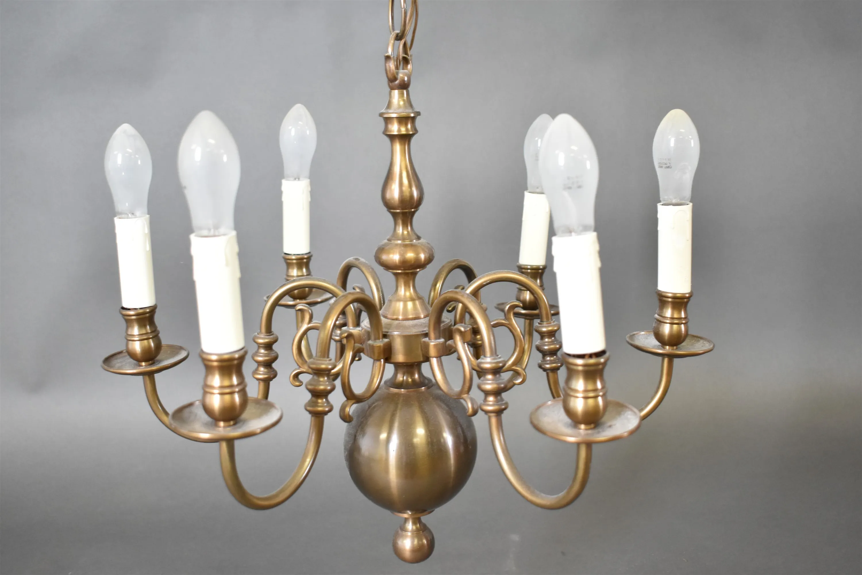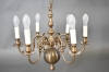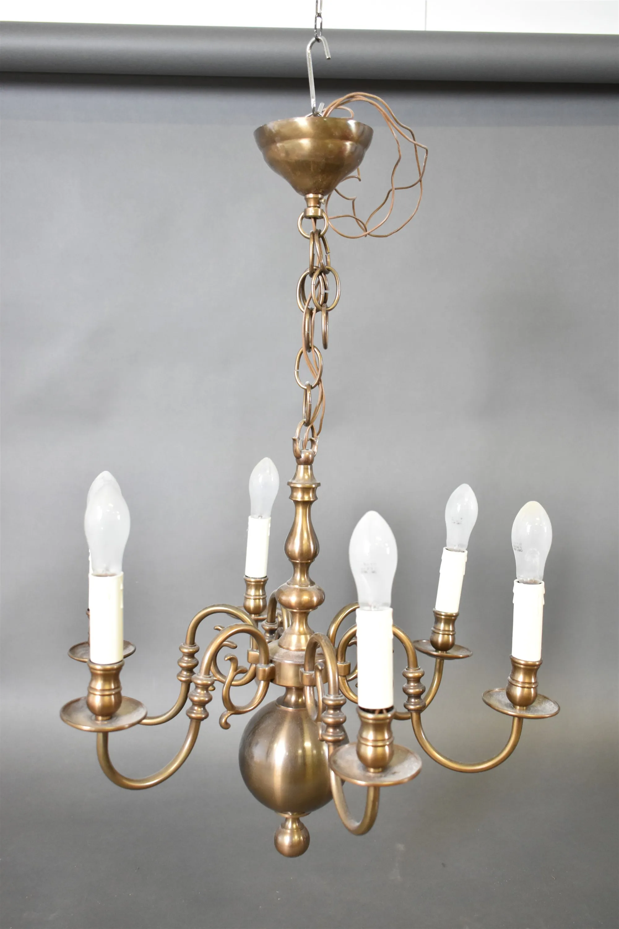 12513. Mässingskrona, 6 armad, skärmar finns, höjd 70 cm, diameter 50 cm