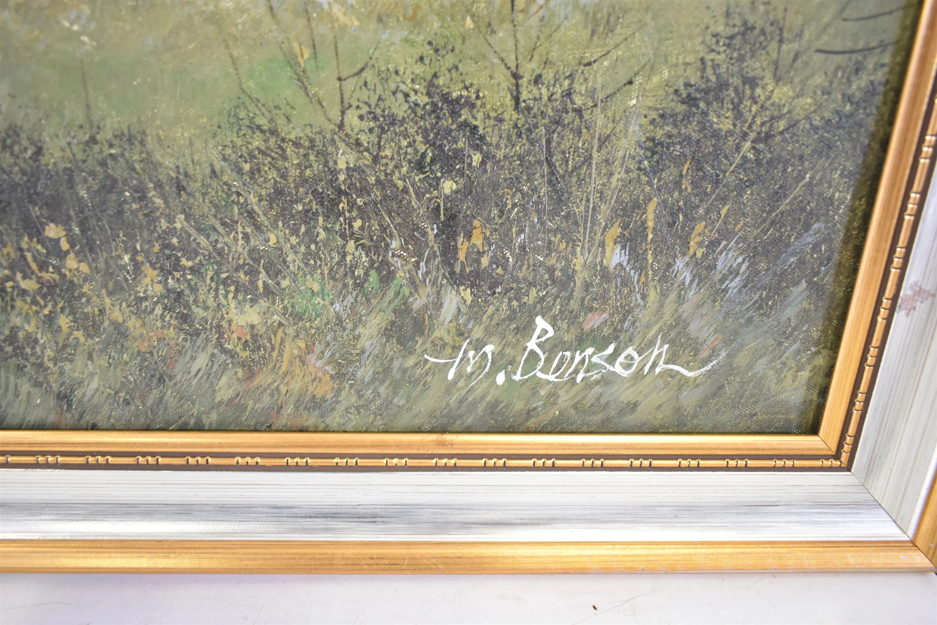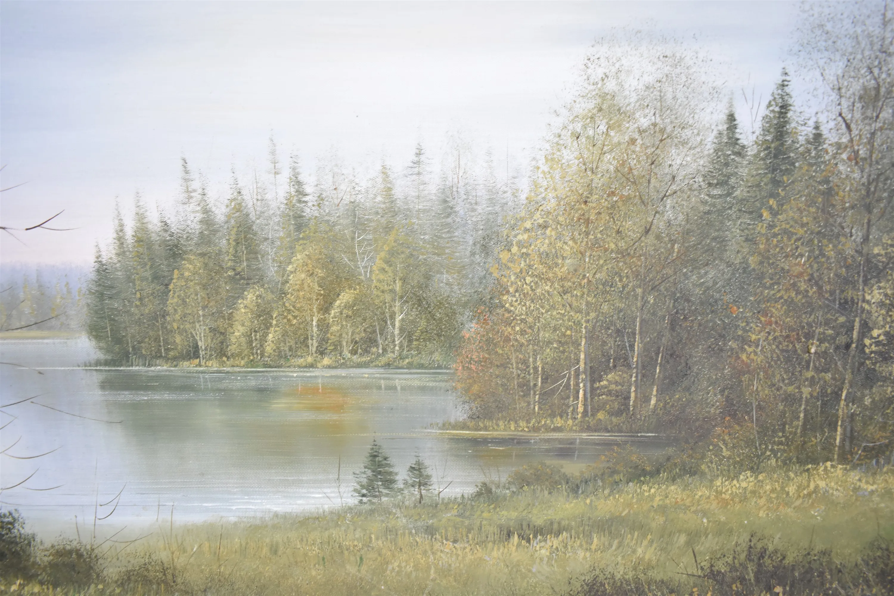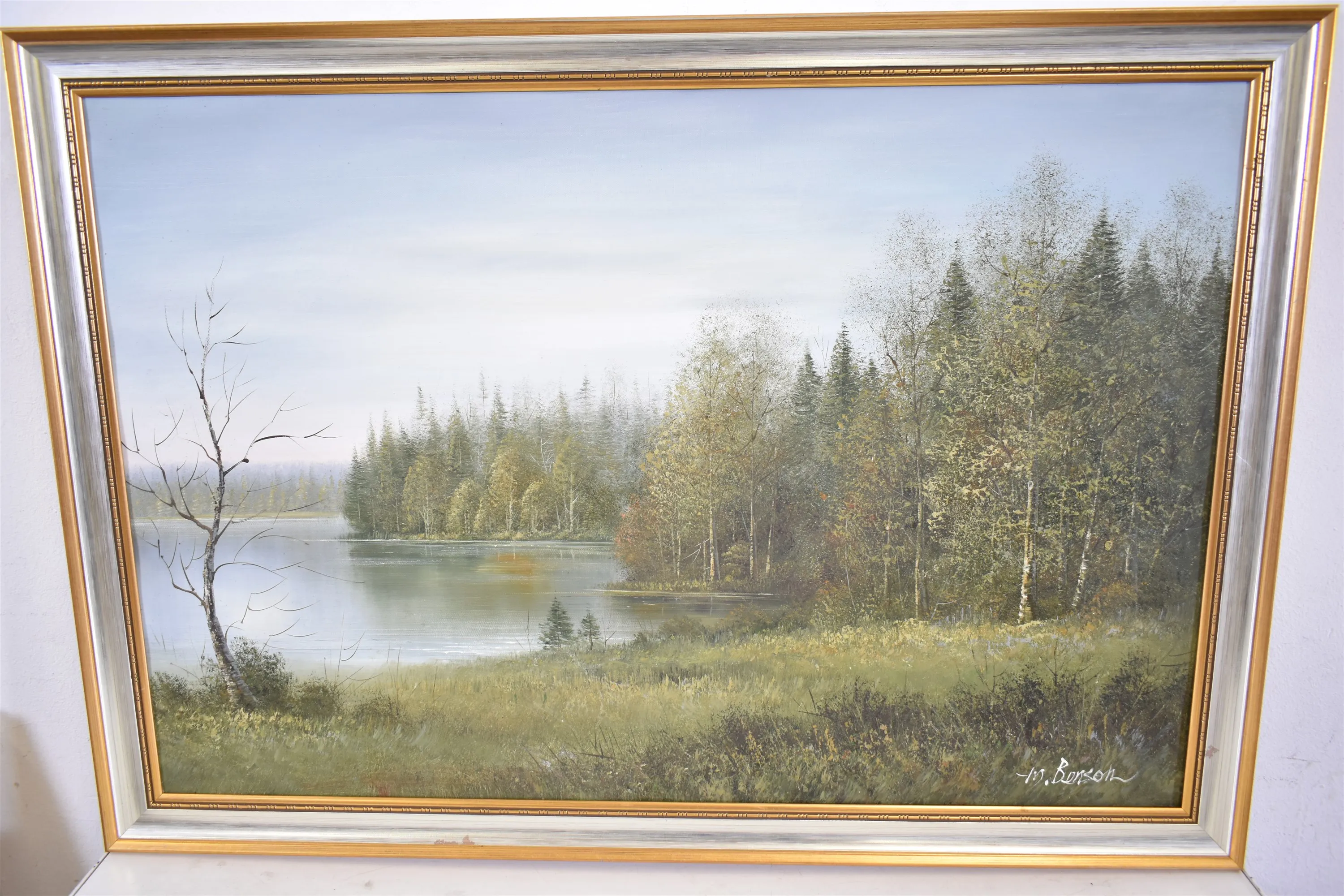 15091. M.Benson olja på duk, "Skog vid sjö", mått 69 x 100 cm