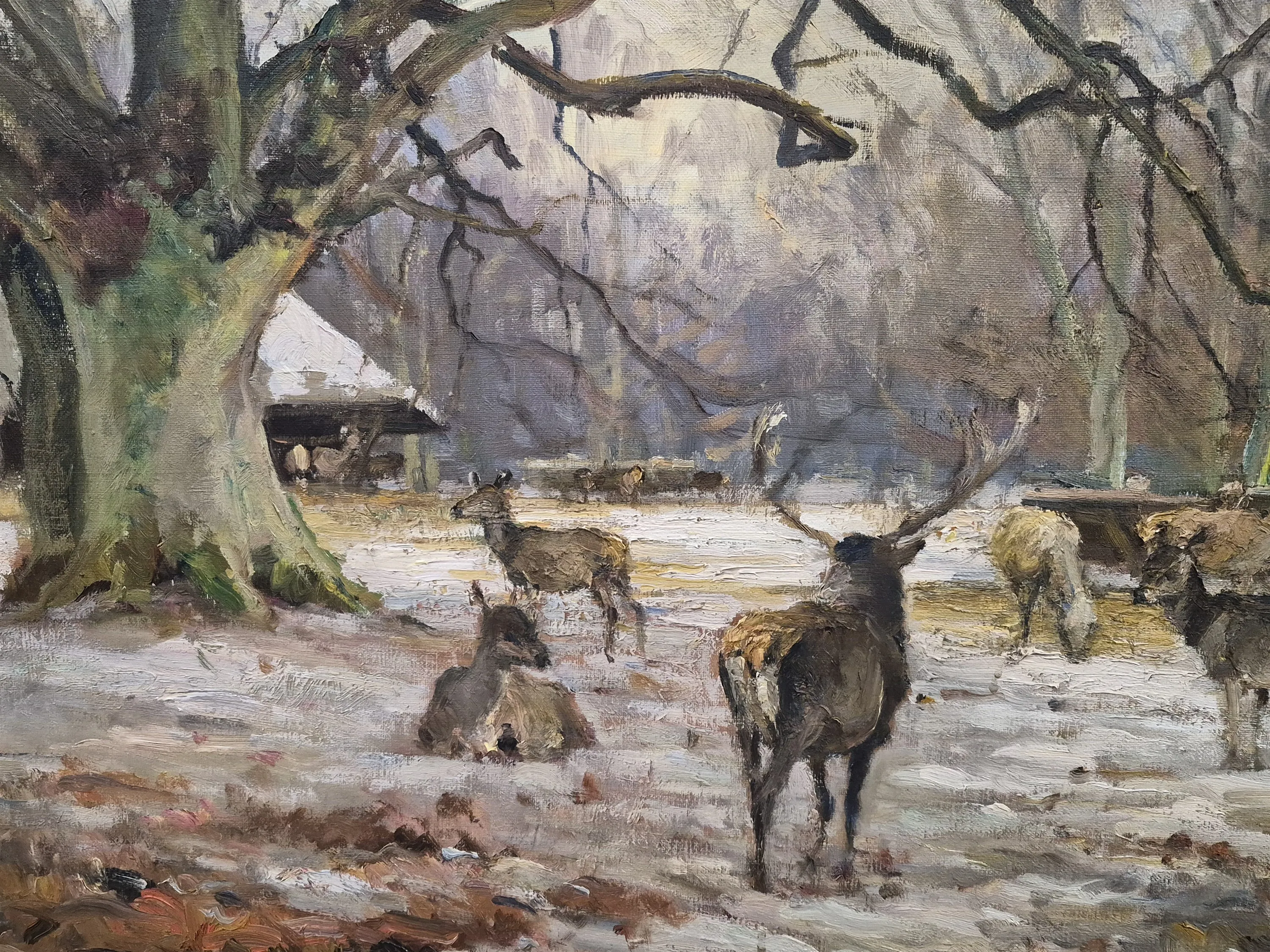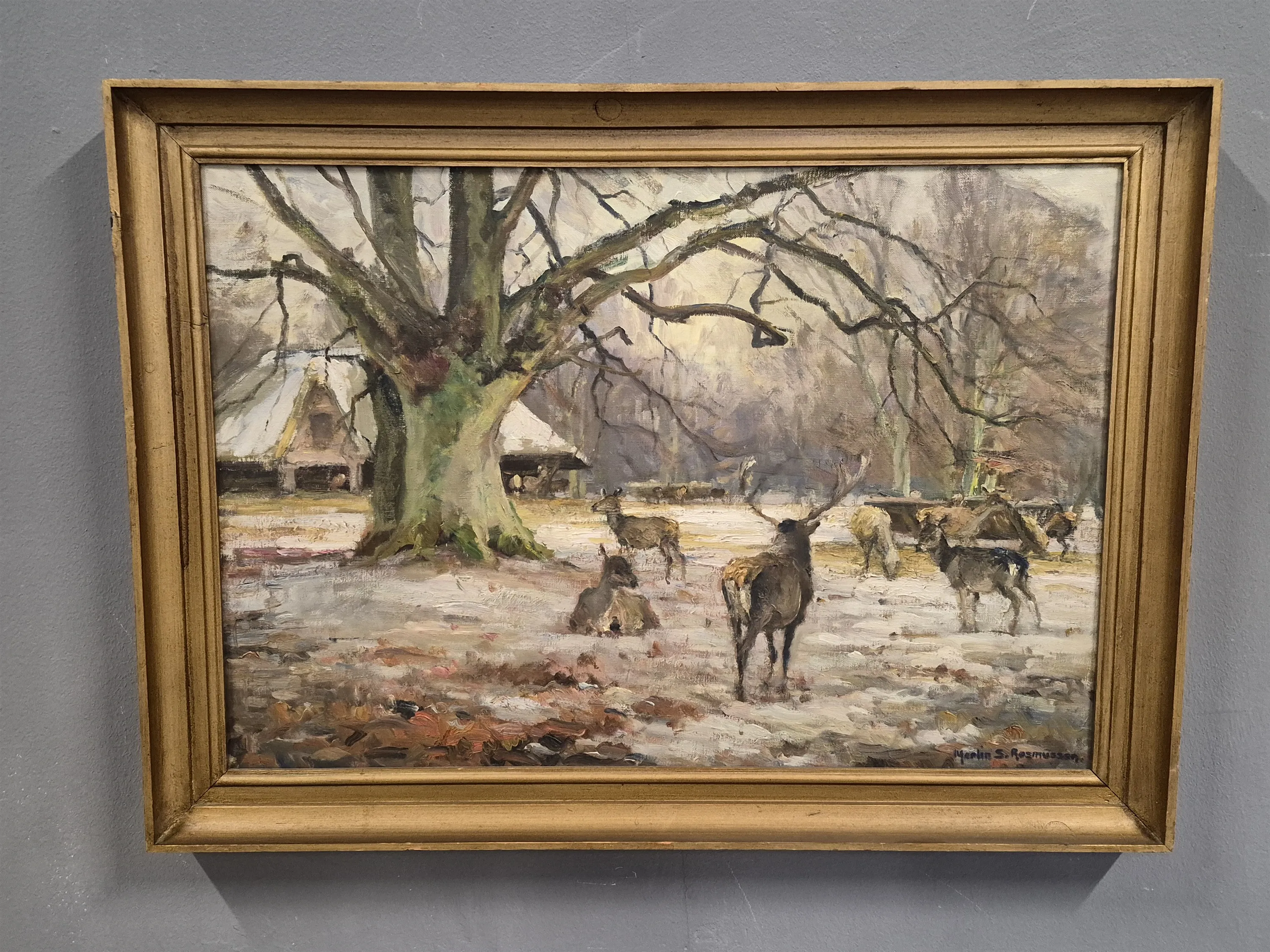 20464. Martin S. Rasmusson olja på duk, "Hjortar vid hus", mått 84 x 61 cm