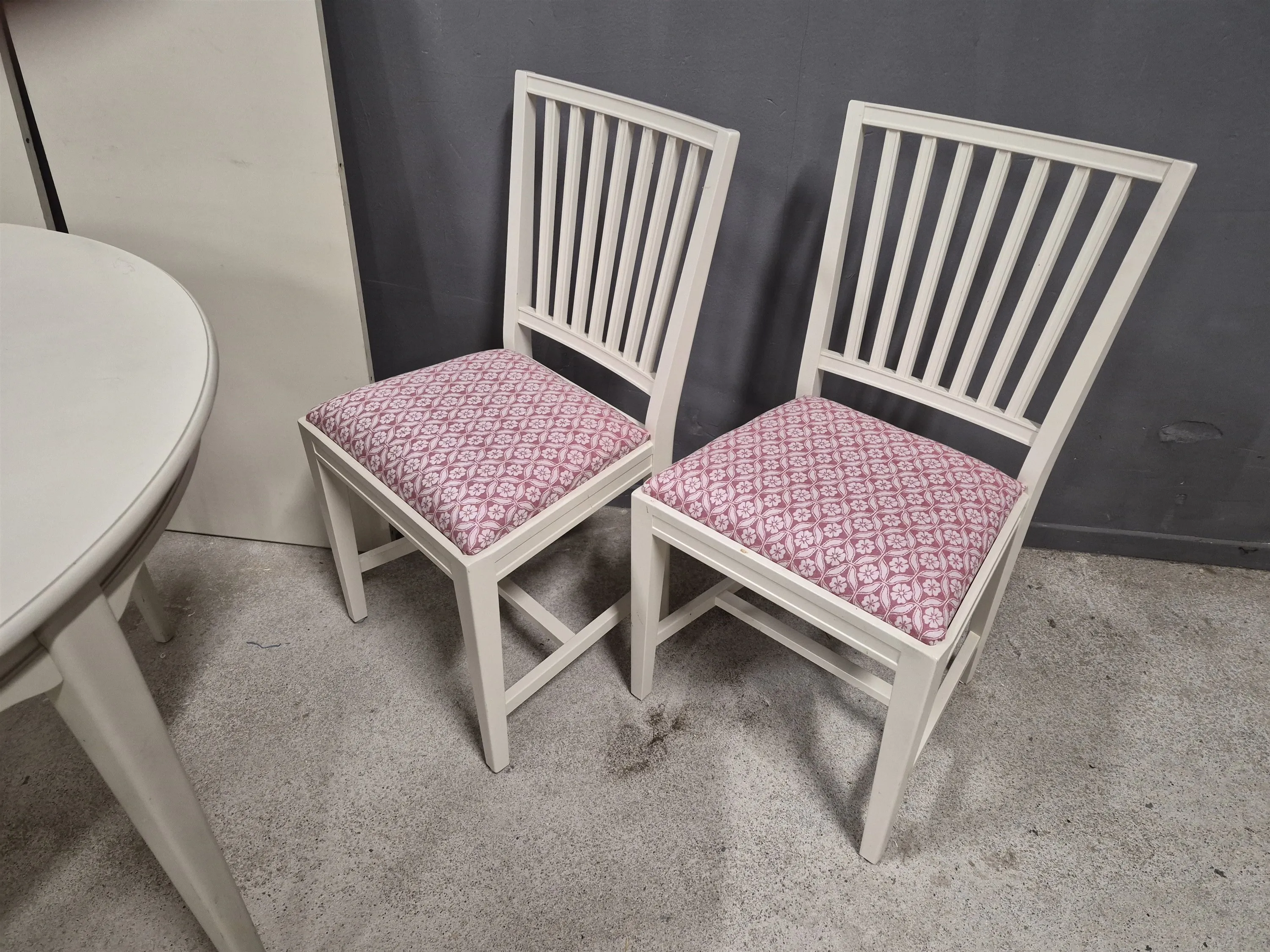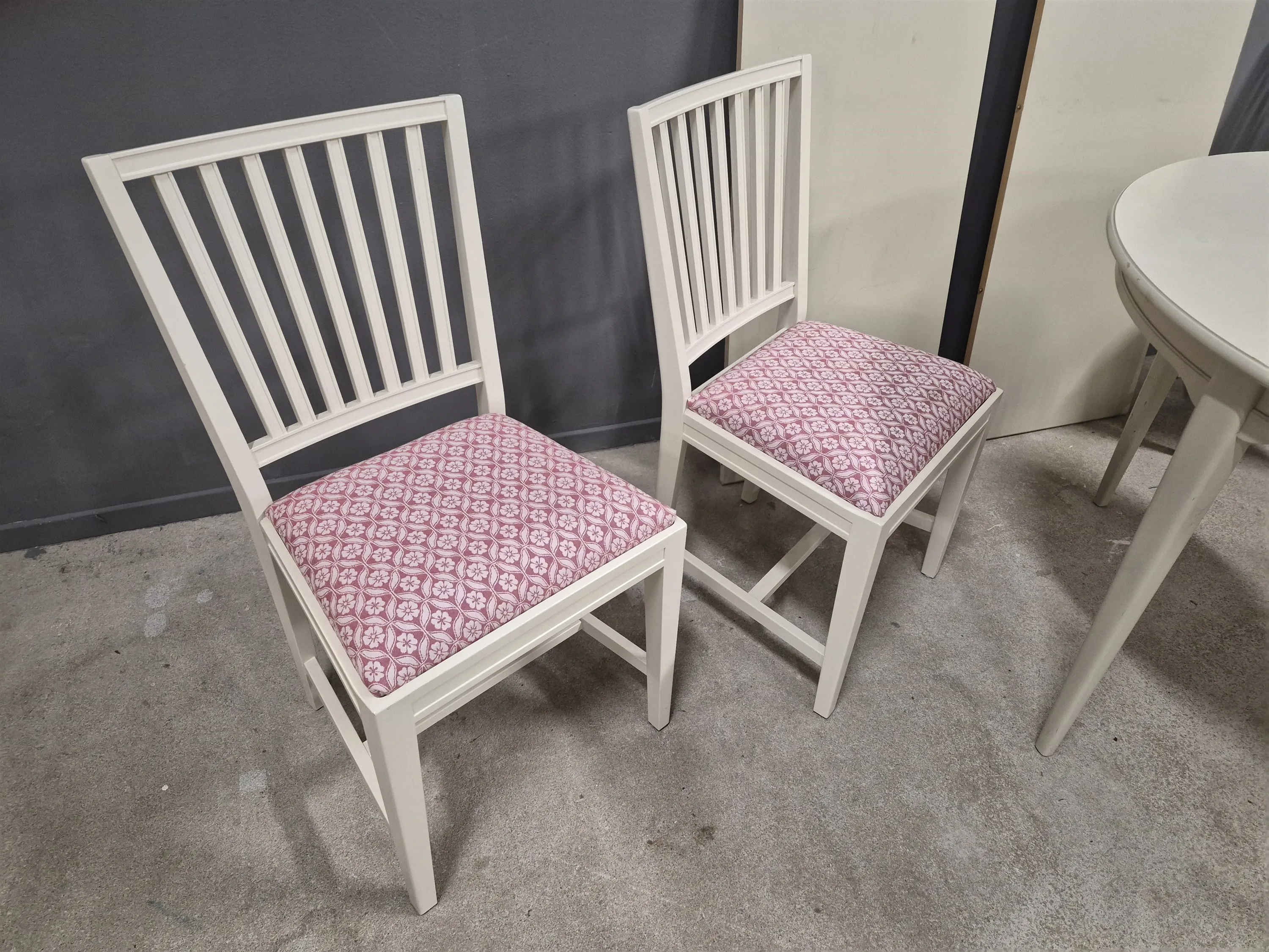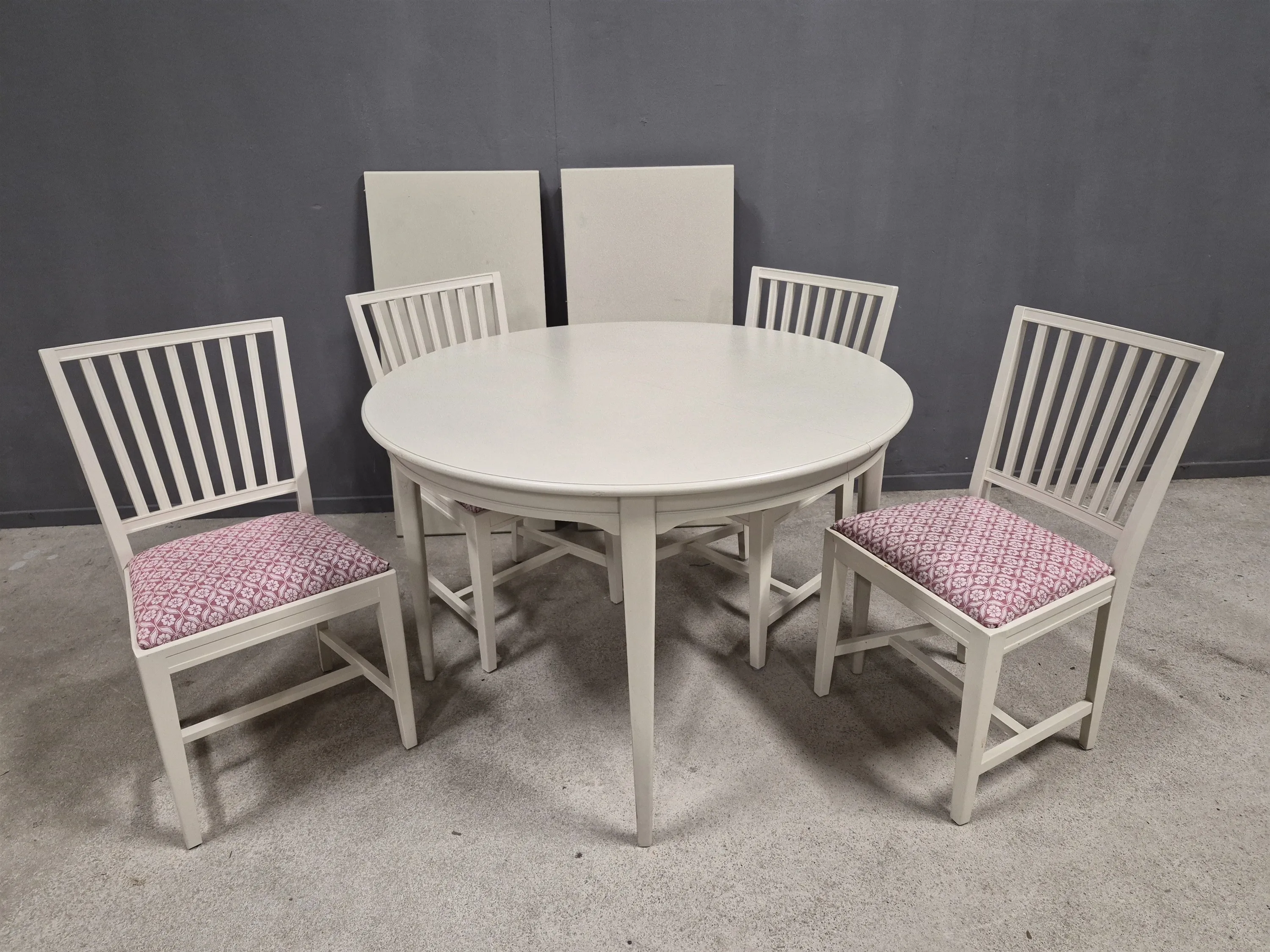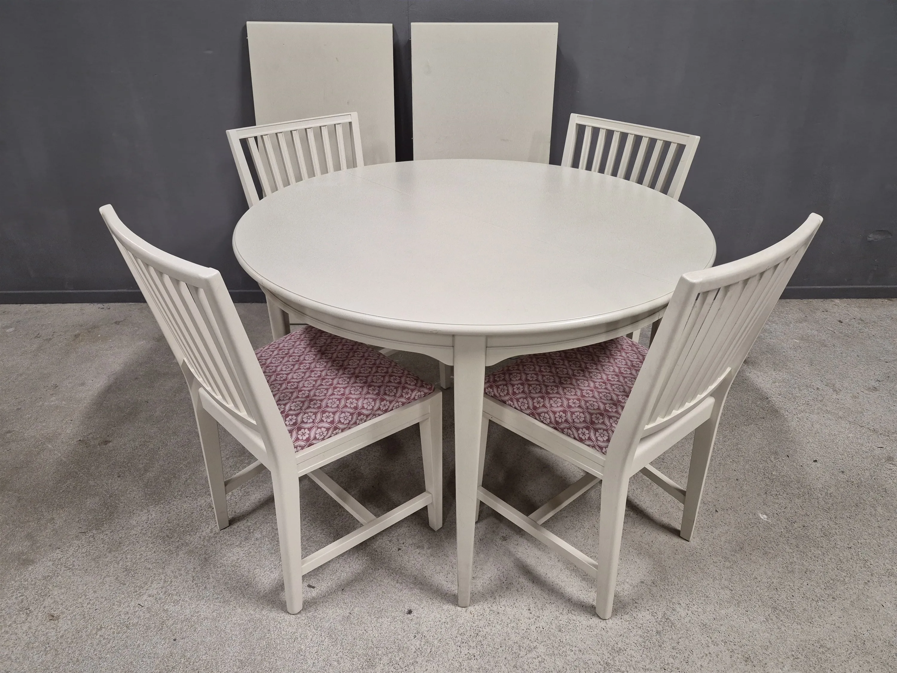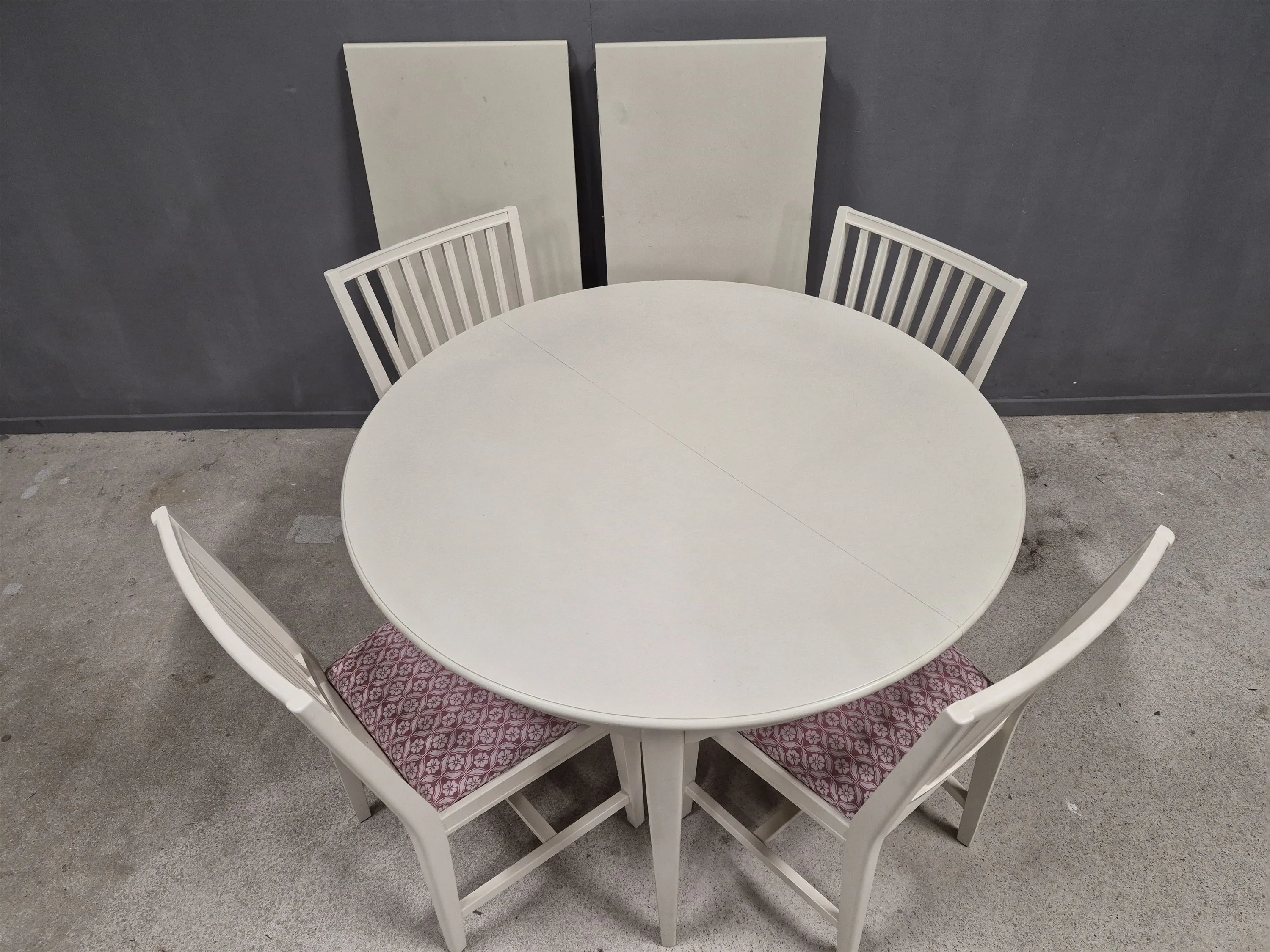 18030. Matgrupp 5 del med 2 iläggsskivor, Höjd bord 74 cm, diameter 110 cm, höjd stolar 86 cm