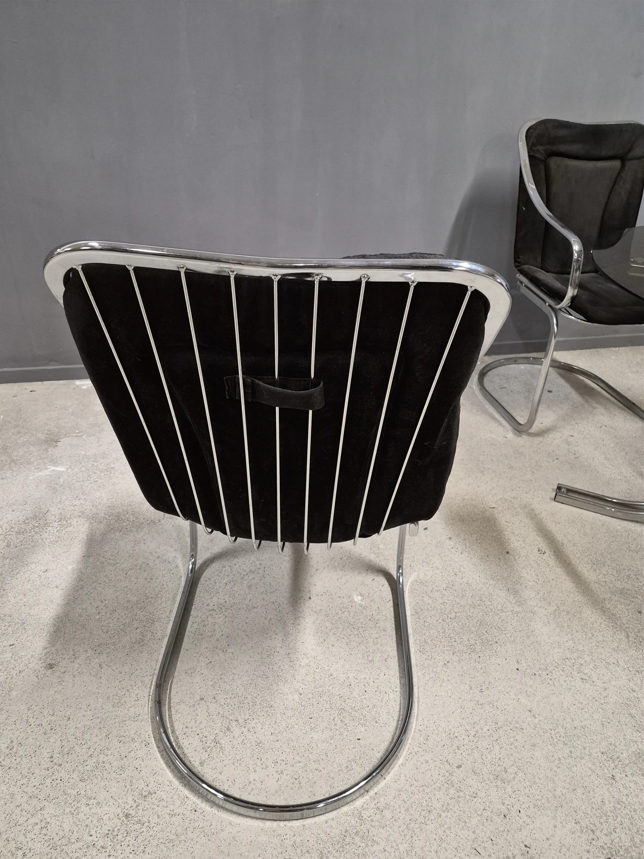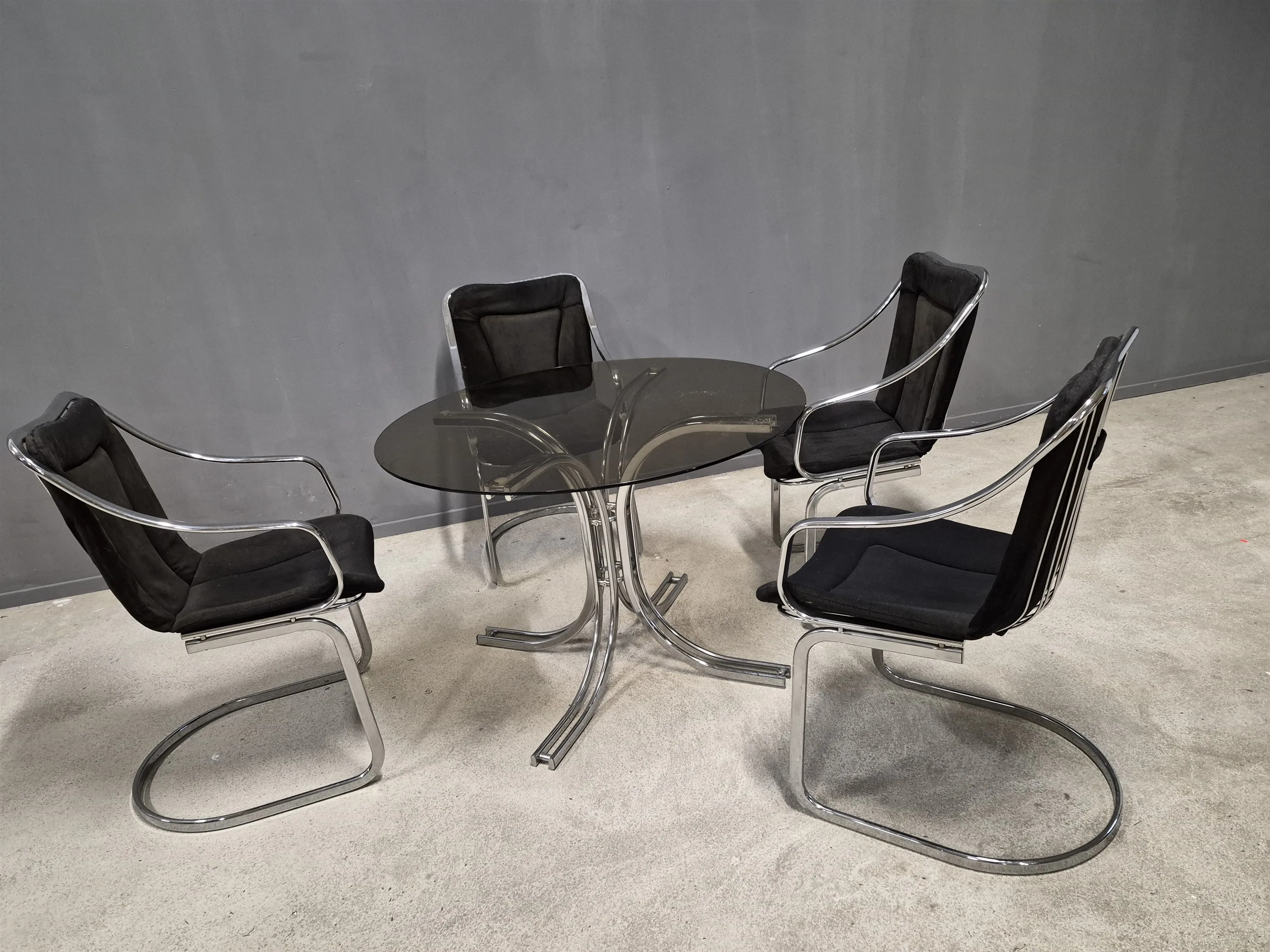 17163. Matgrupp 5 delar Gastone Rinaldi, Italien, klädsel smutsig, 1 gummiplopp saknas till bord, höjd på bord 73 cm, diameter 108 cm