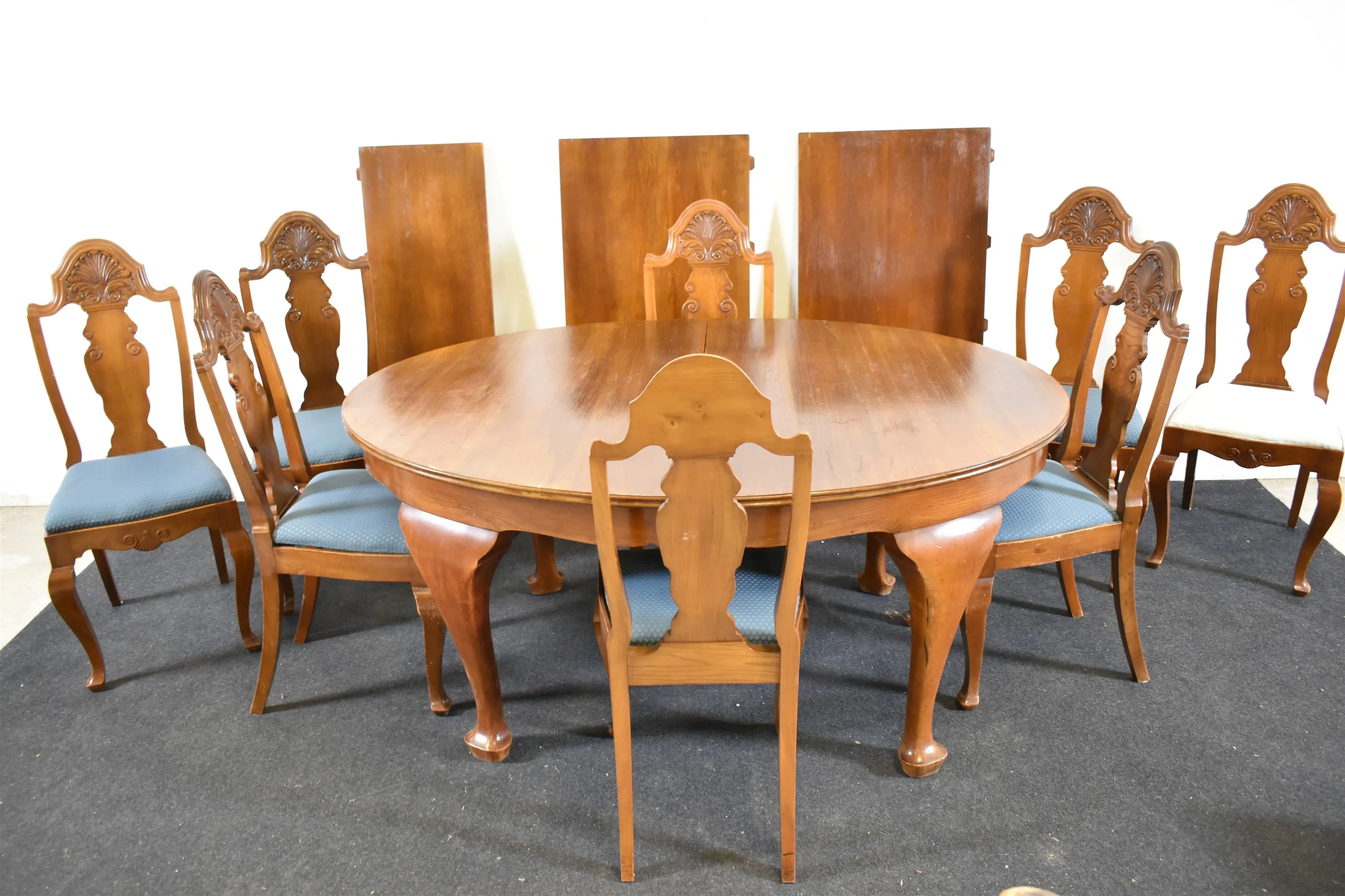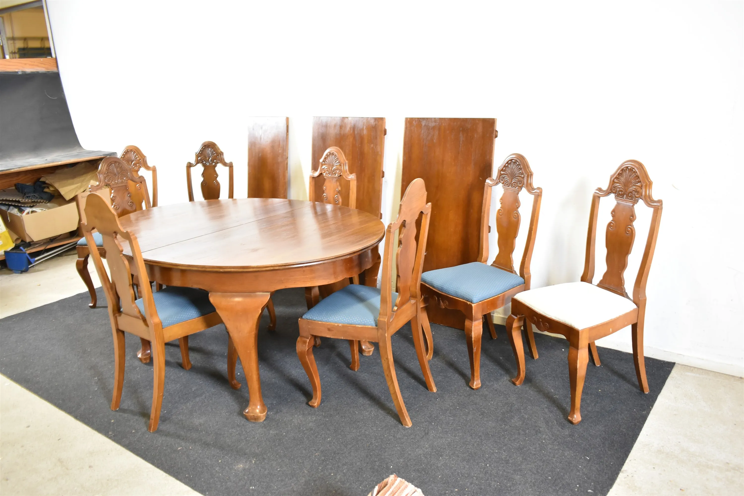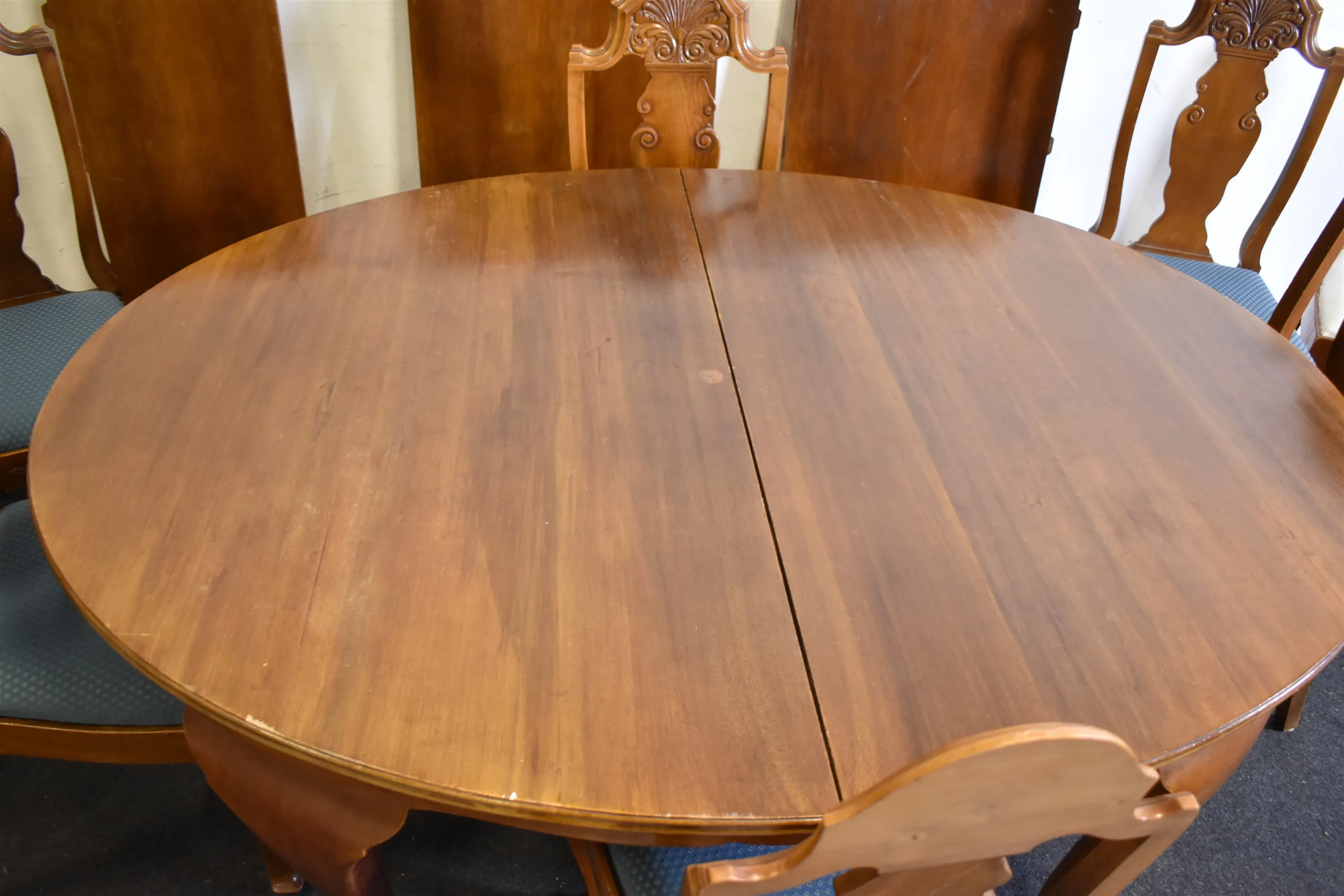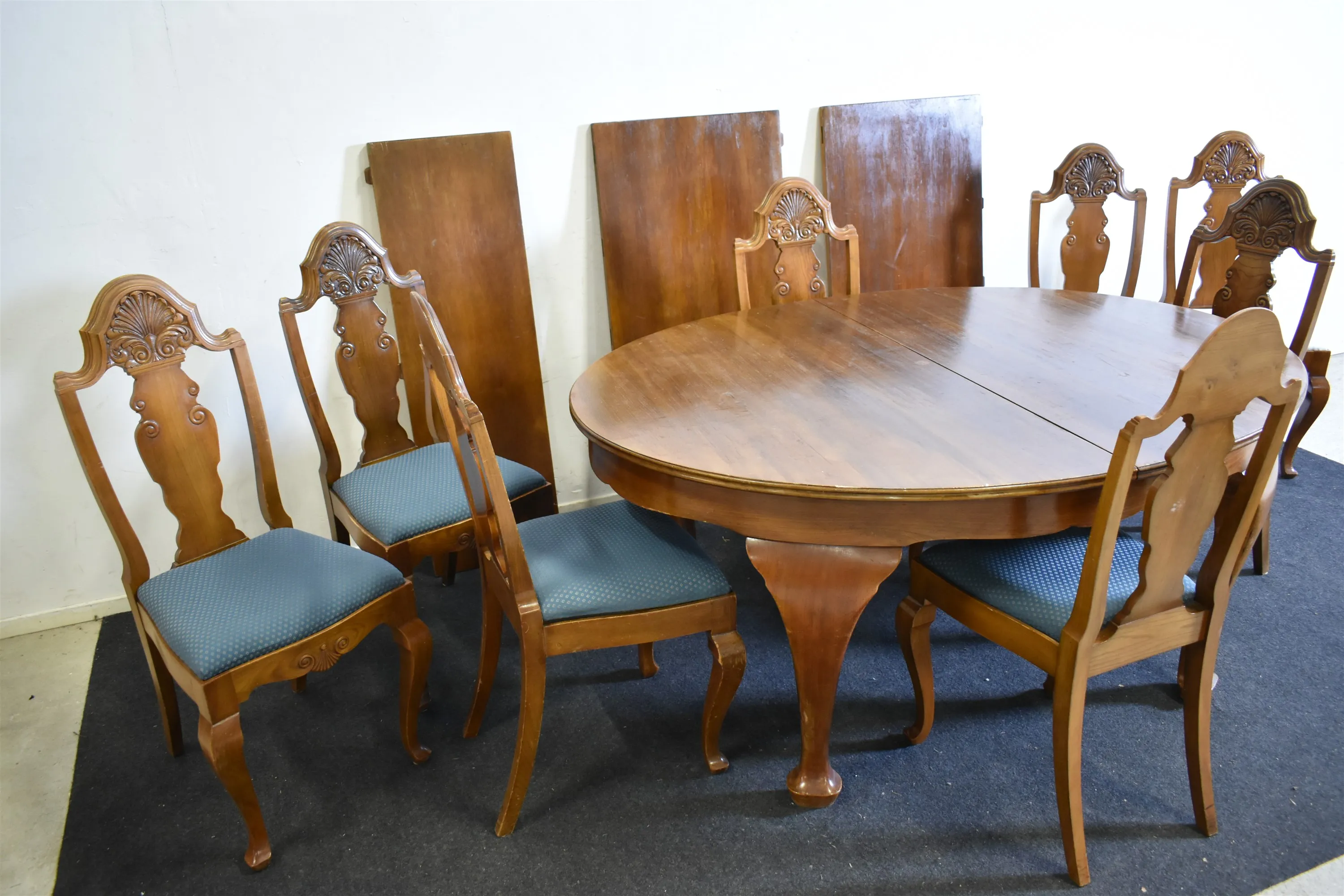 16185. Matgrupp, 9 delar Rokokostil, höjd stolar 110 cm, bord 78 cm, längd bord 170 cm, bredd 125 cm