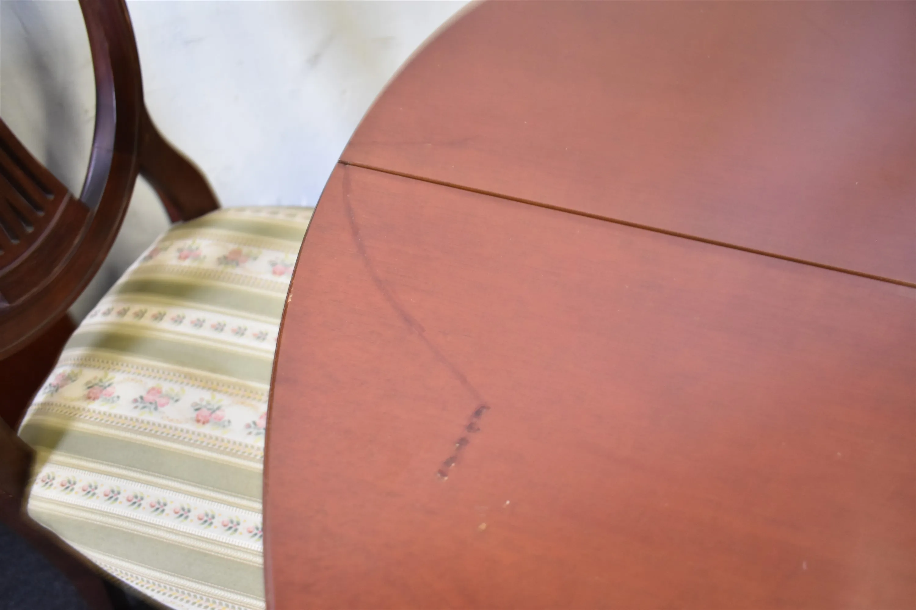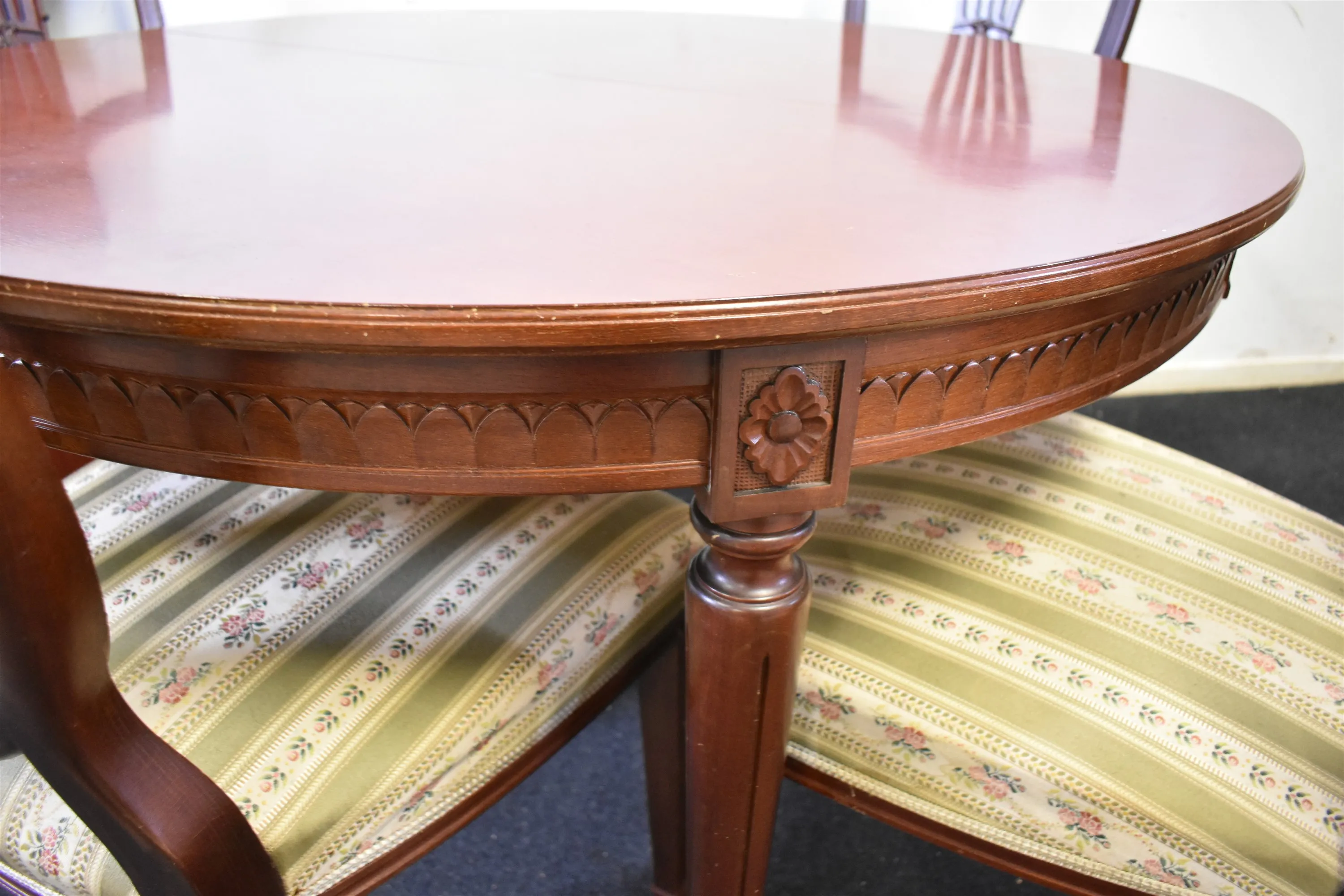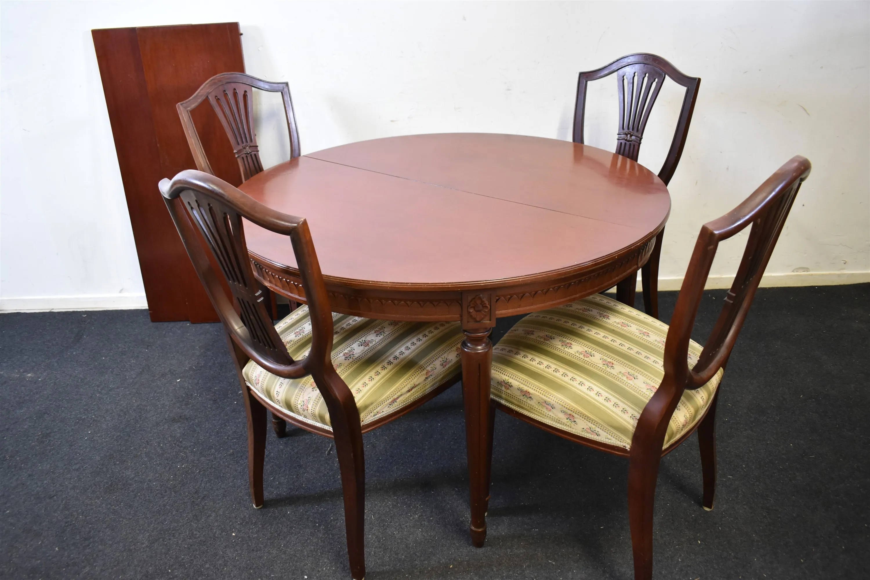 13759. Matgrupp gustaviansk stil 5 delar plus iläggsskivor 2 st, mahogny, höjd på stol 96 cm, höjd på bord 75 cm, diameter 110 cm längd på extra skivor 35 cm x 2
