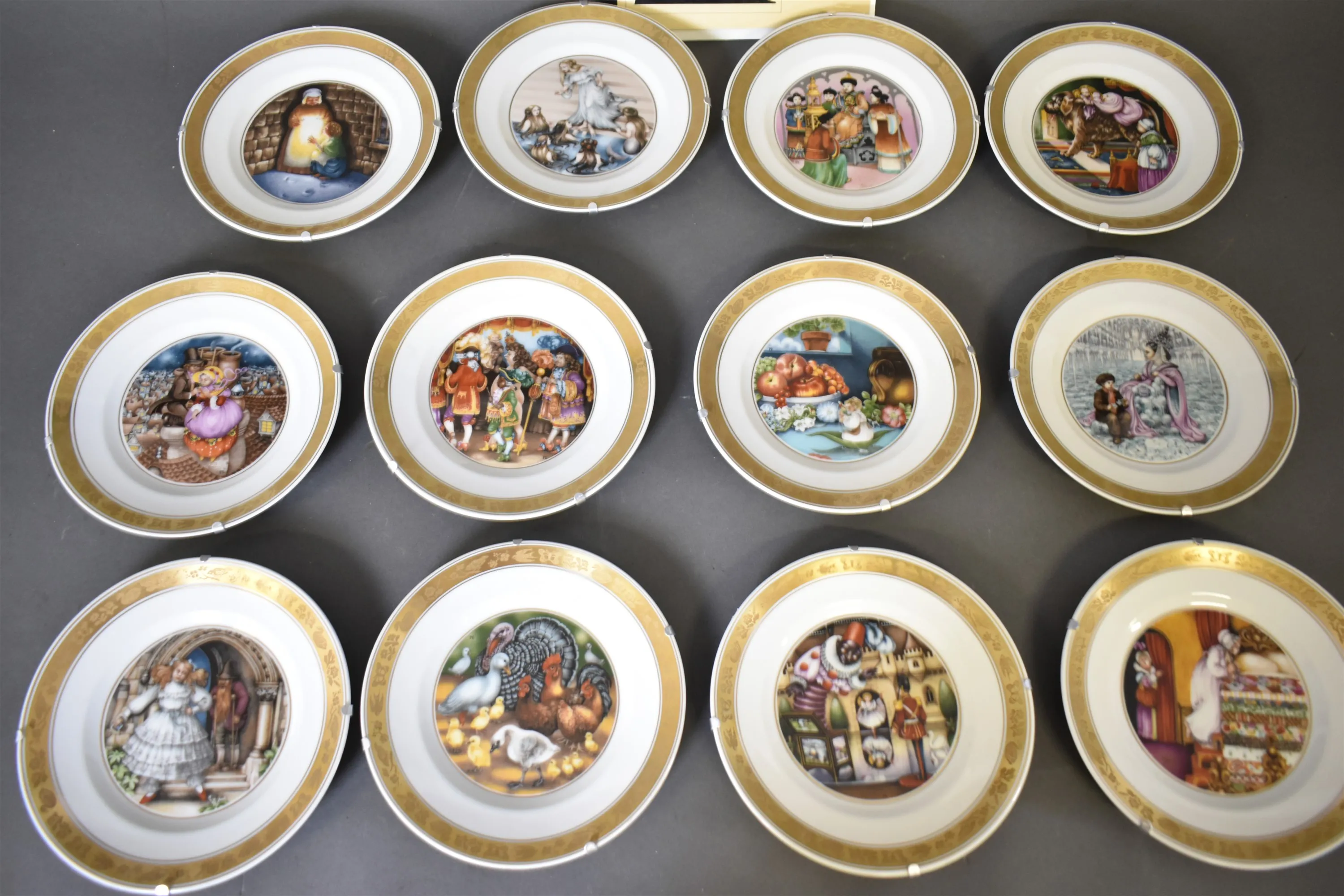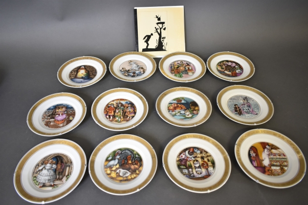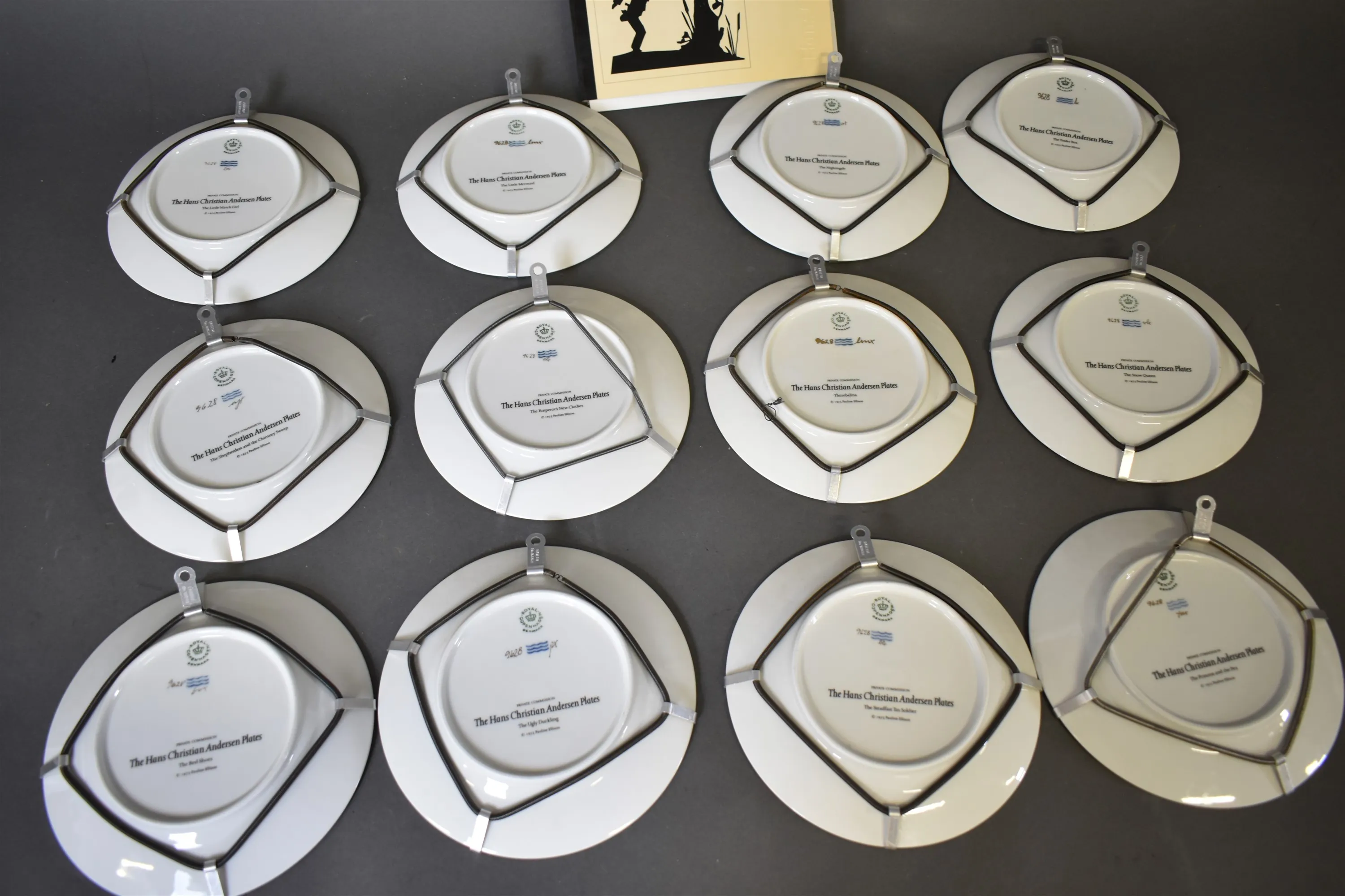 13286. Minnestallrikar, 12 st med intyg & handbok, Sagomotiv H.C.Andersen Kunglig Dansk, diameter tallrikar 19 cm