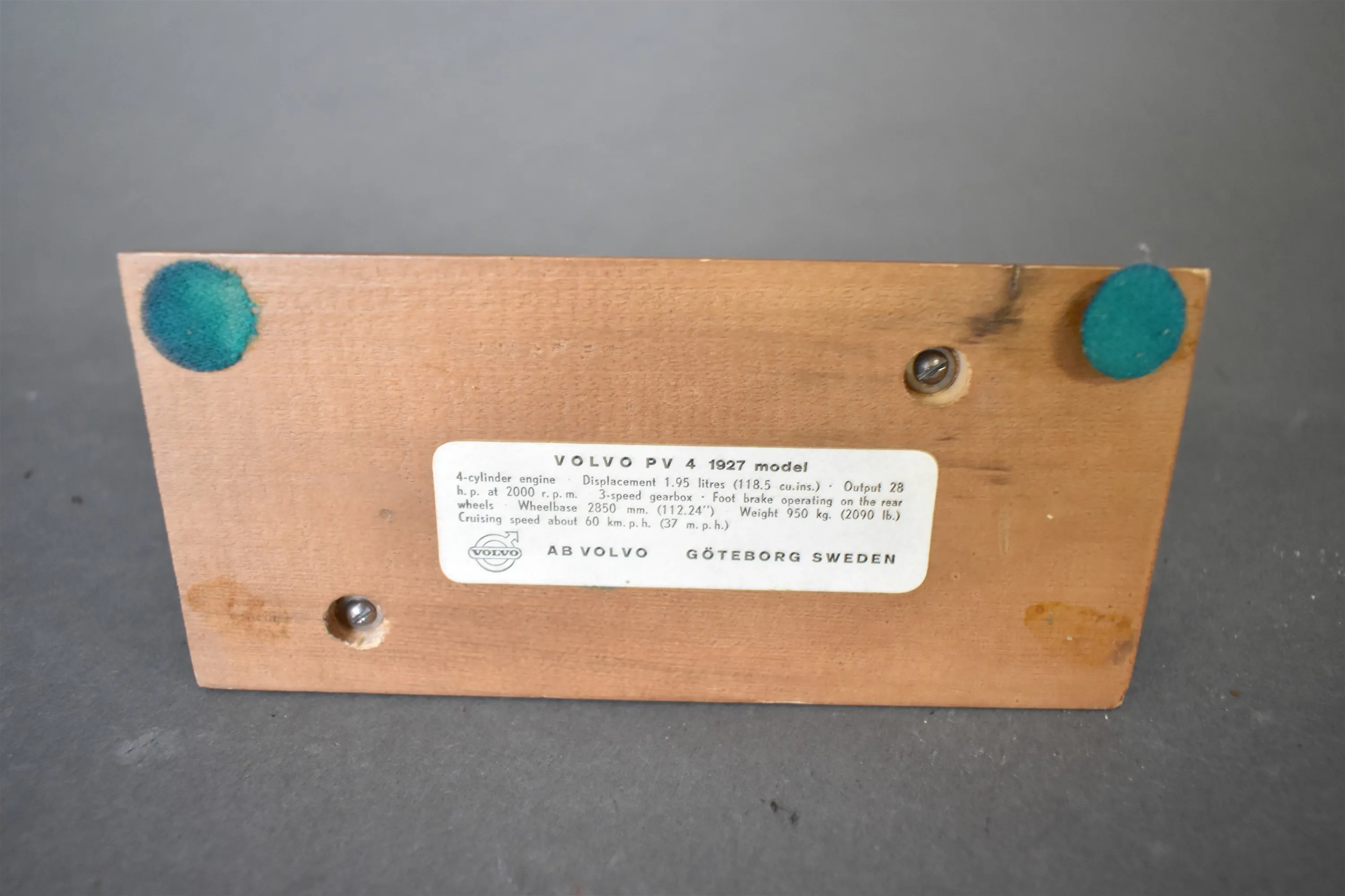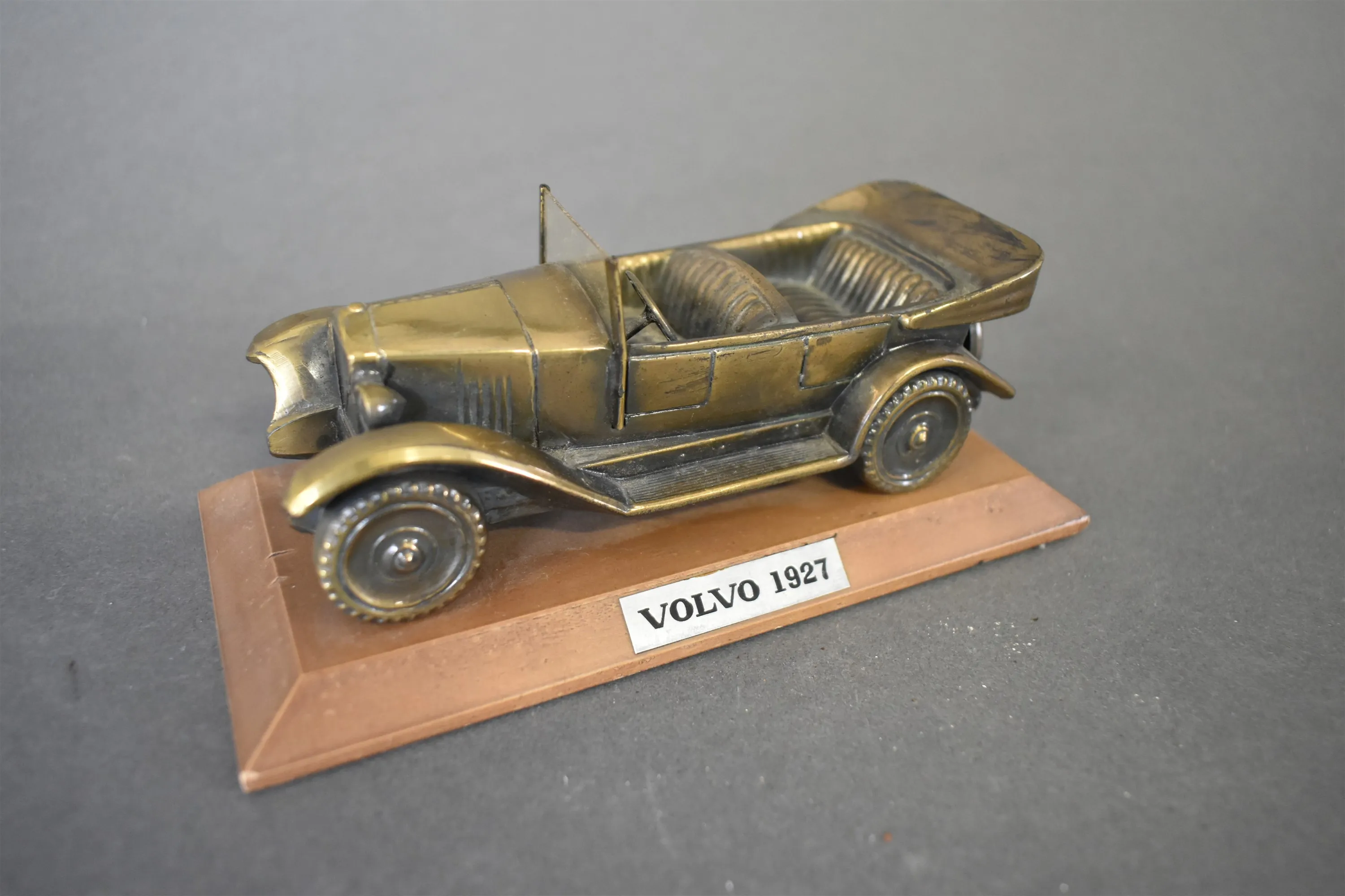 10489. Modellbil, Volvo model PV 4 1927, metall på träsockel, längd 16 cm