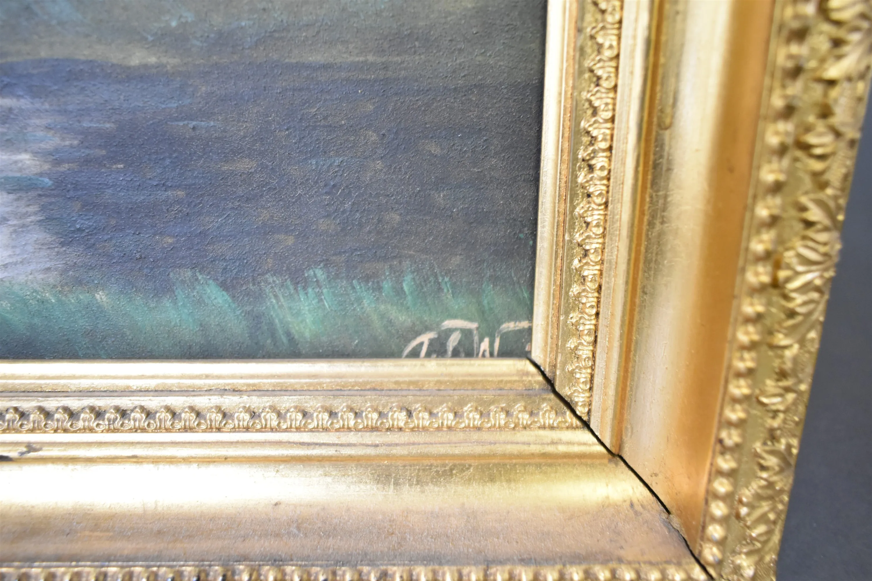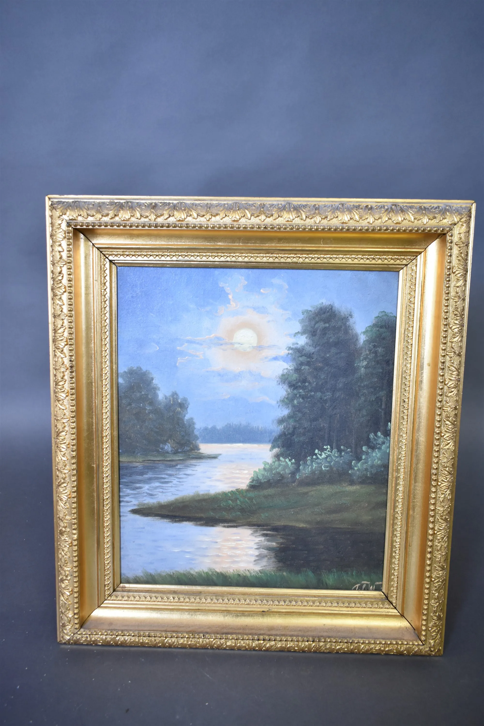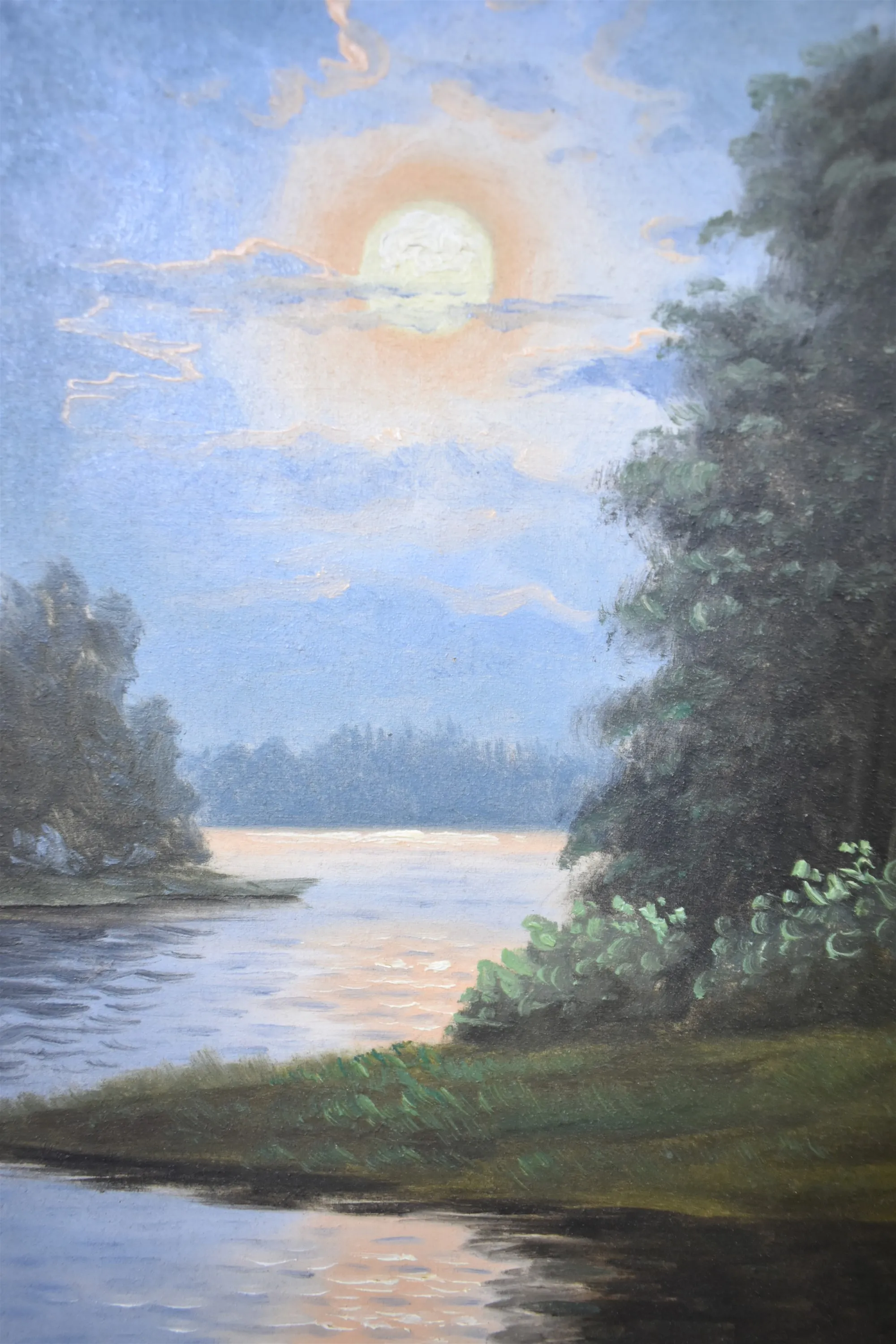 15047. Monogramsignerad olja på pannå/trä, "Månsken över sjö", mått 42 x 49 cm