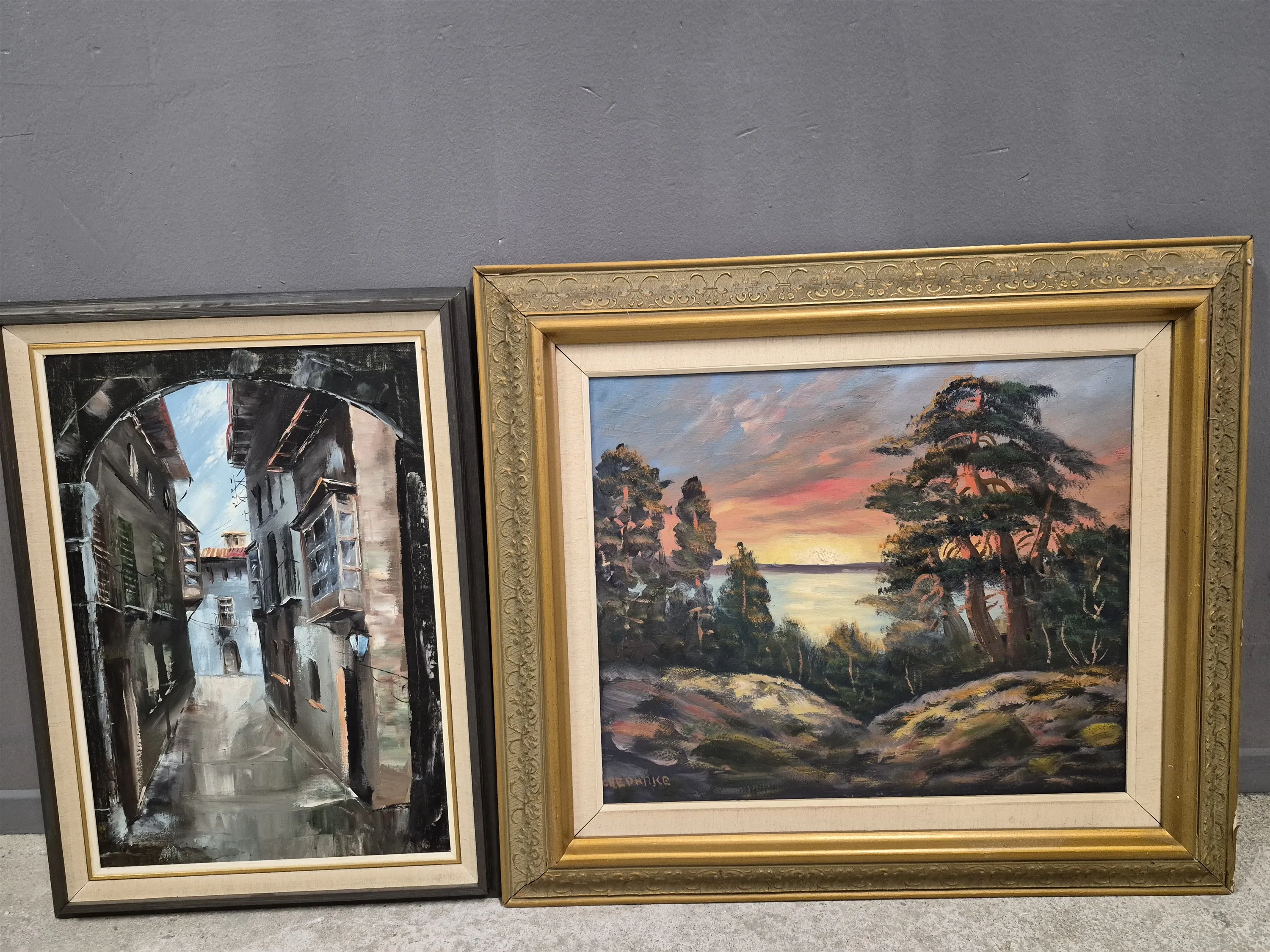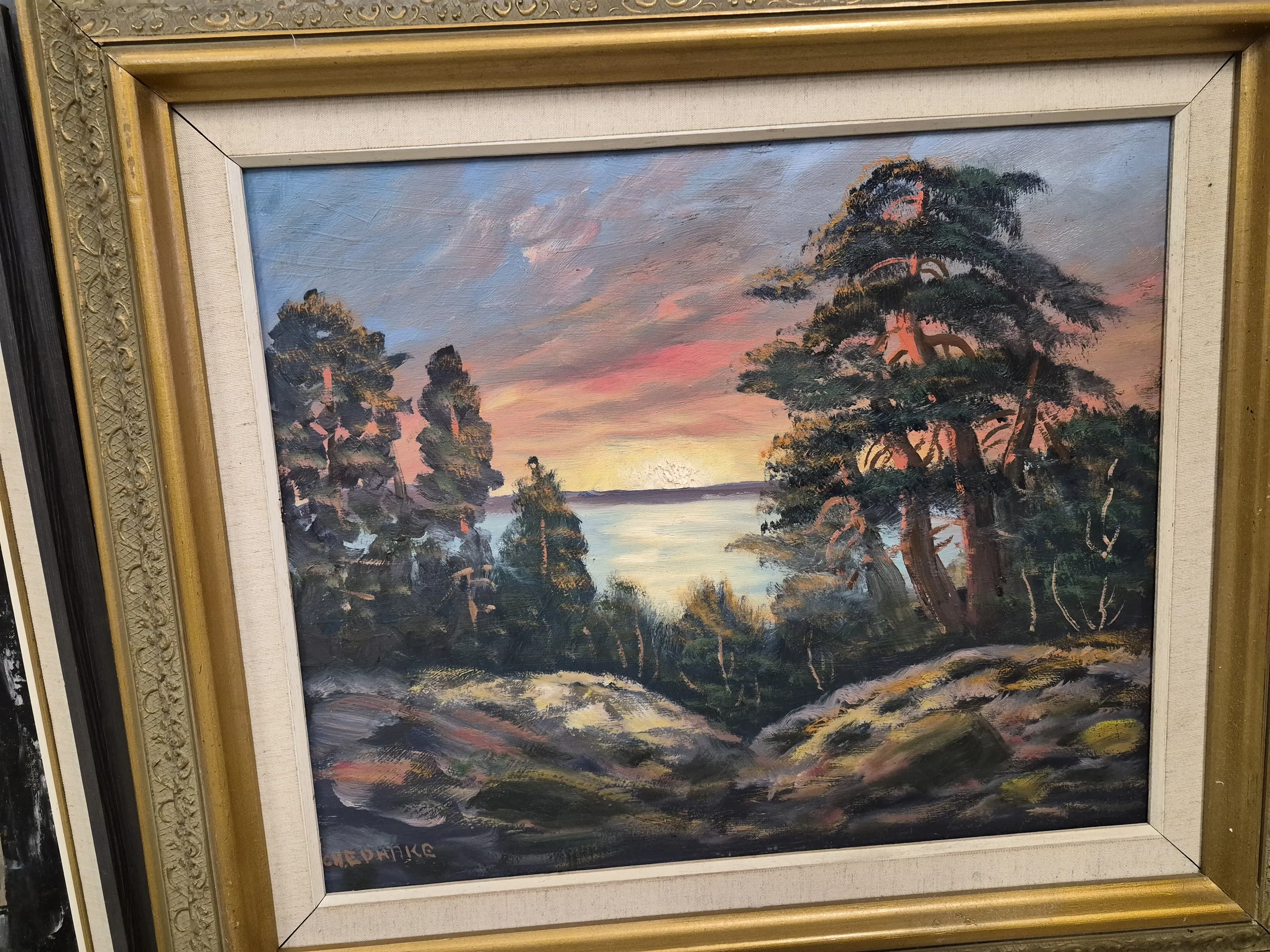 16860. Olja på duk 2 st bla solnedgång, största mått 76x68 cm
