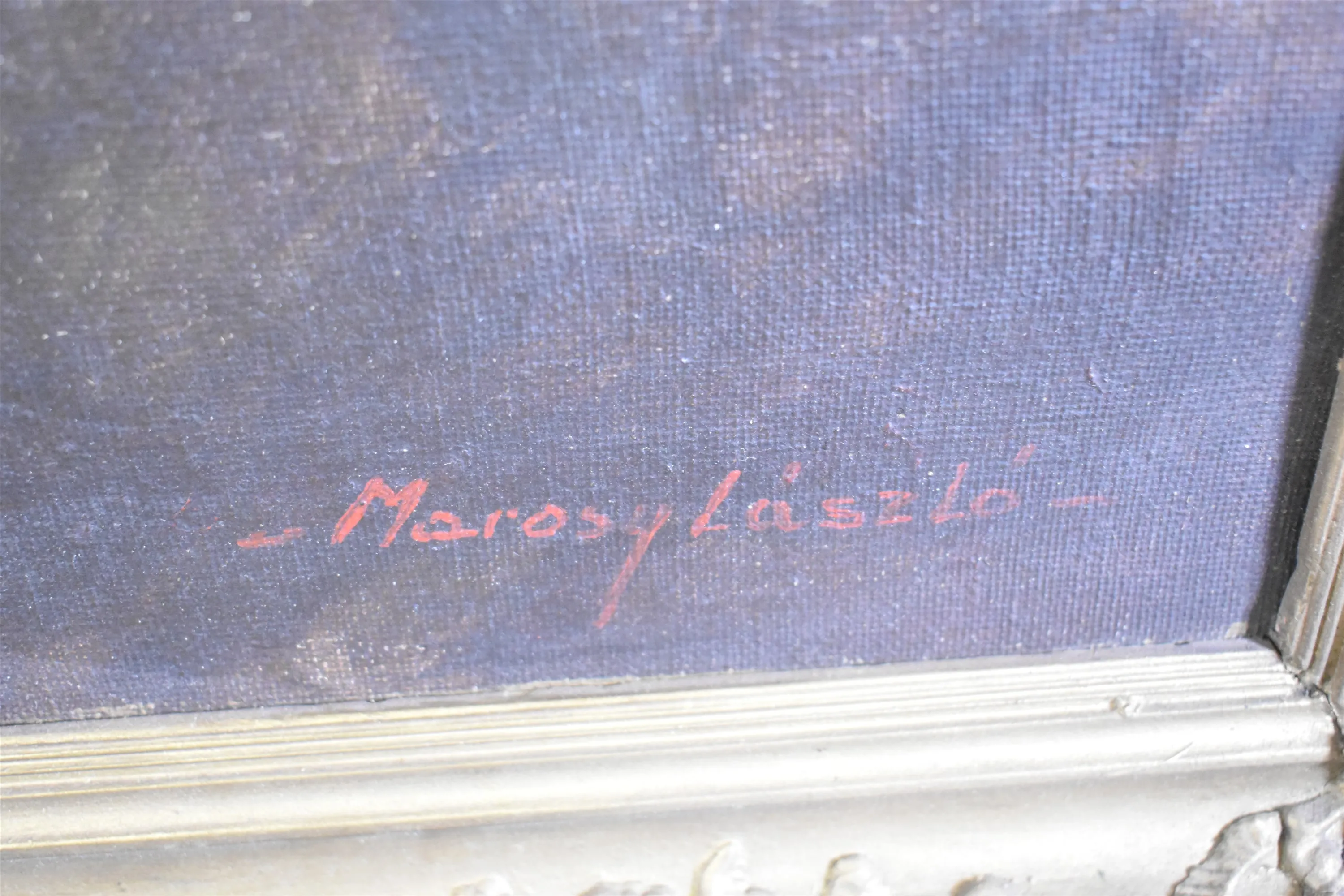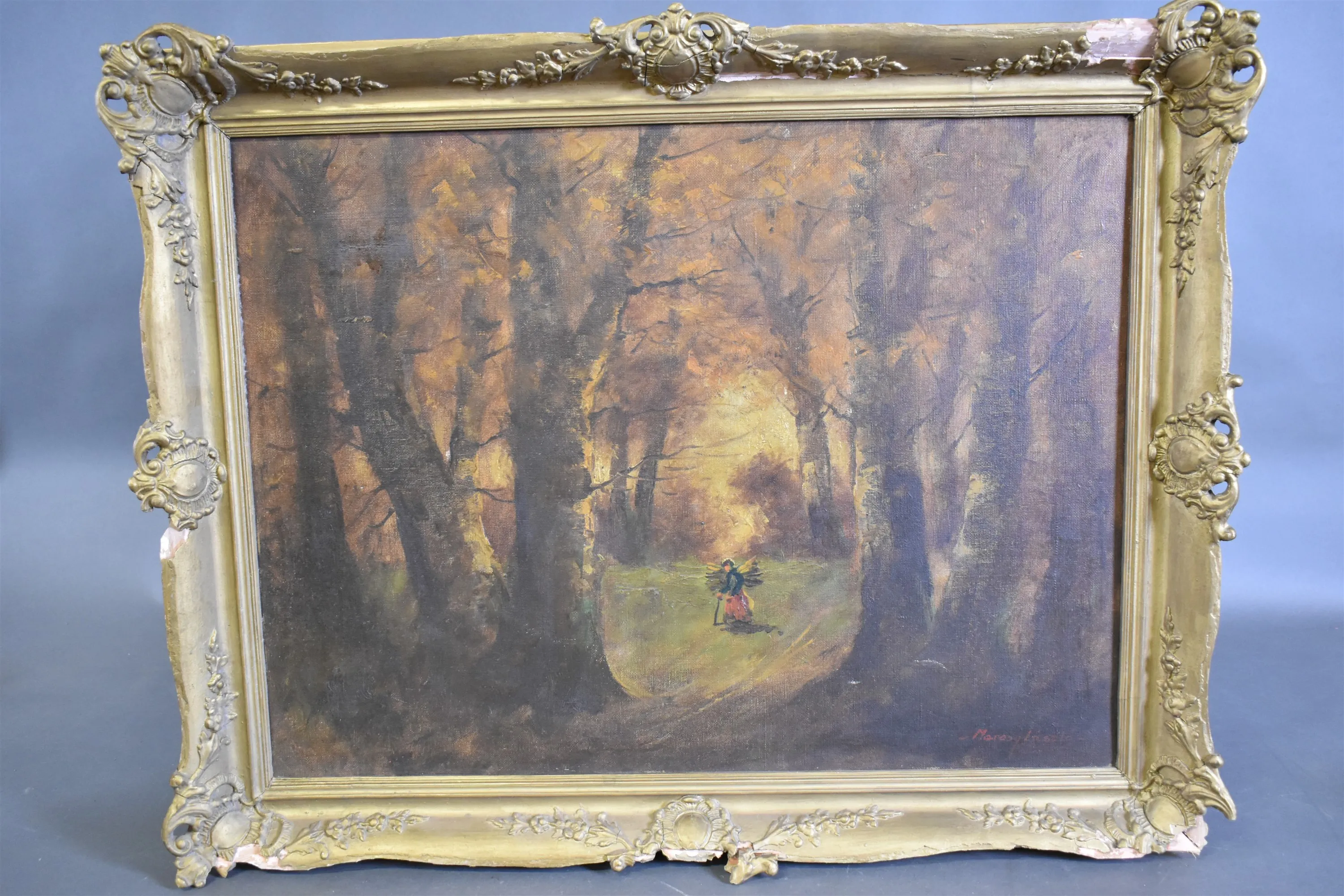 16669. Olja på duk, figur i skogsglänta, signerad, skada på ram, yttermått 95x77 cm