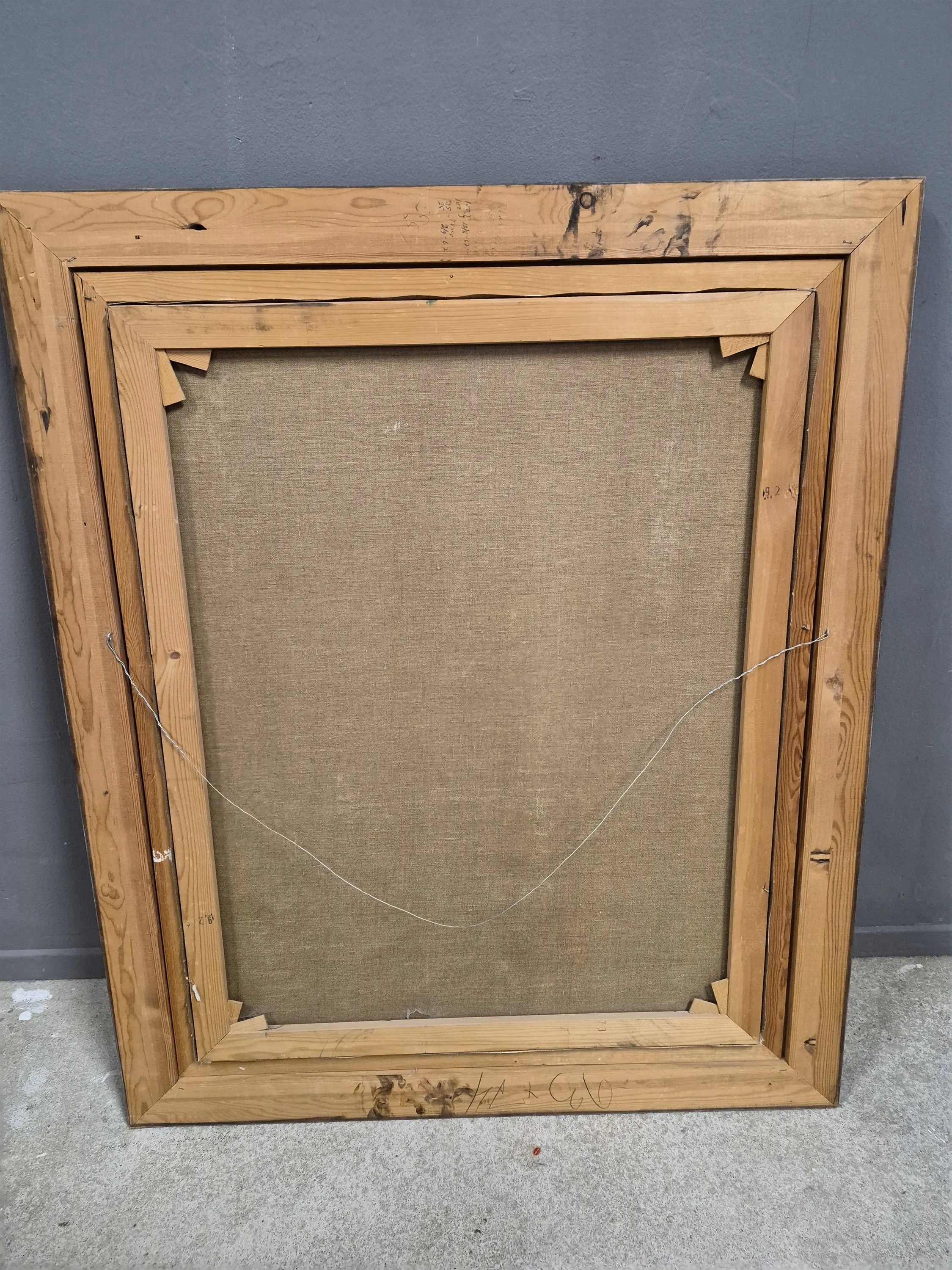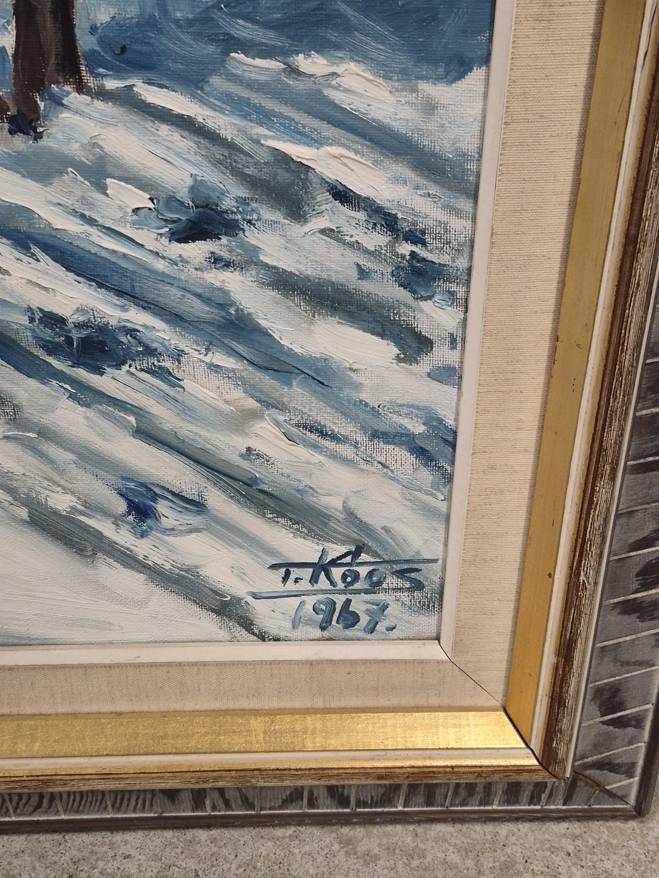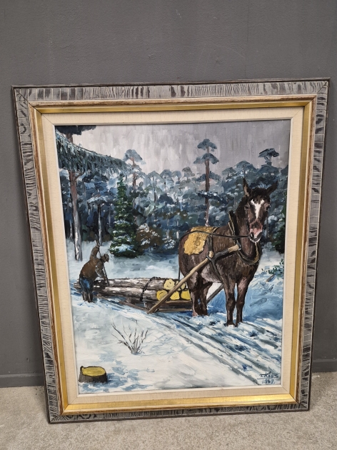 19004. Olja på duk, häst med timmer, signerad, yttermått 114x94 cm