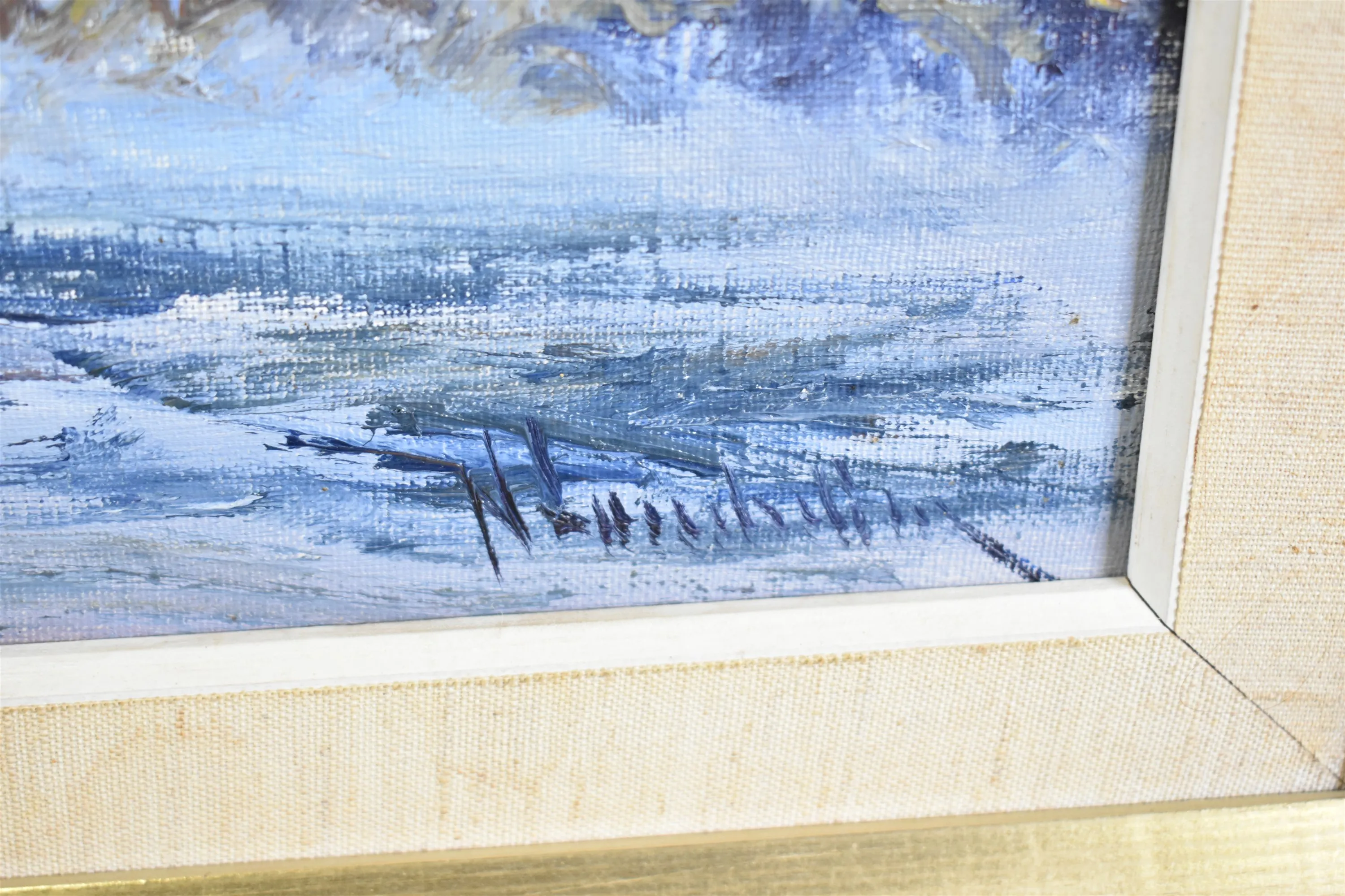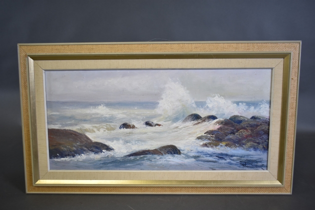 16671. Olja på duk, vågor mot klippor, signerad, yttermått 91x52 cm